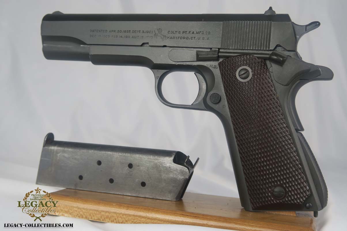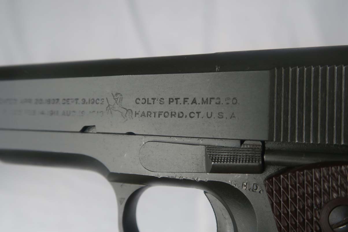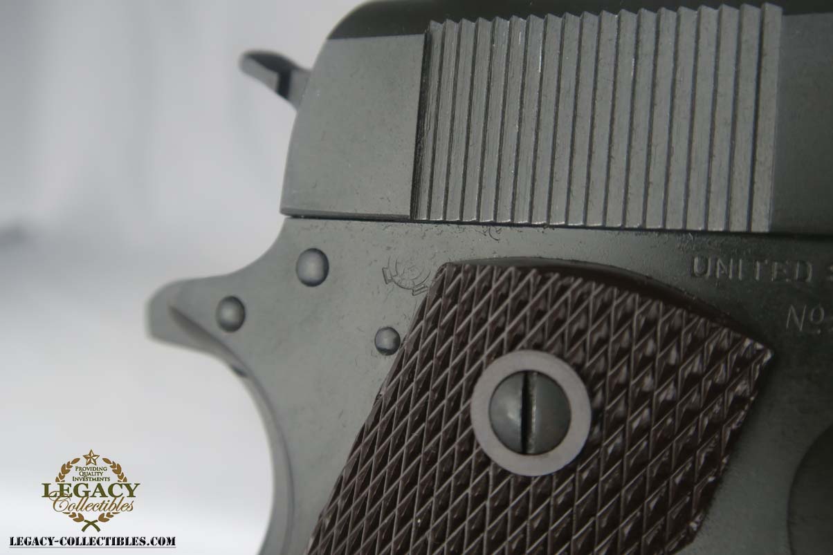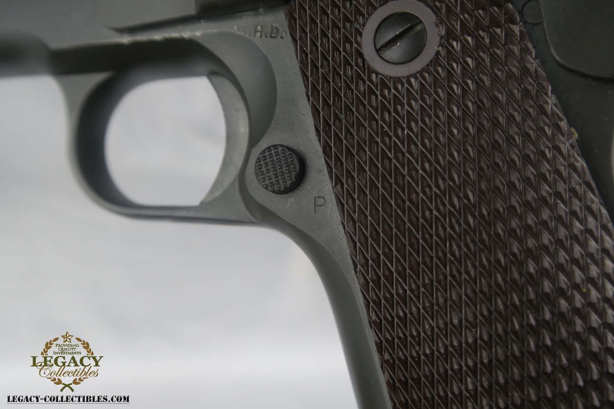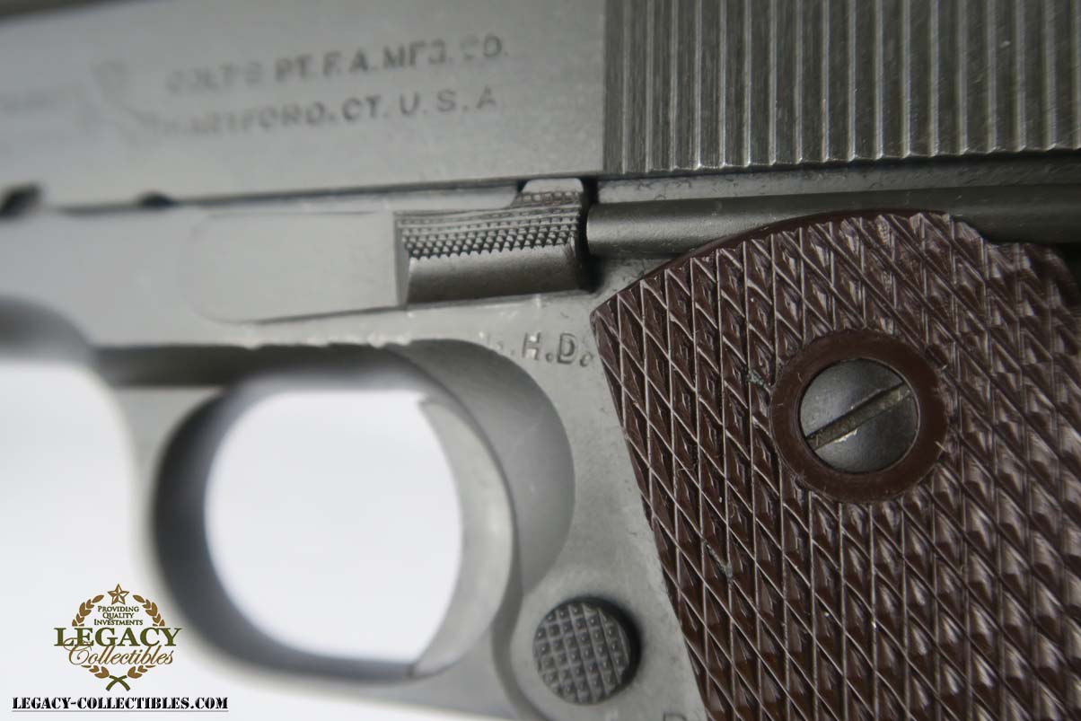 5/30/17 – This is a near-mint Colt M1911A1, manufactured in 1943.  The original finish rates at about 99%, with only a couple small dings beneath the slide stop, and almost zero finish loss.  The pistol has the matching number slide, which was discontinued a few months later.  This pistol was shipped from Colt to Springfield’s Armory in may of 1943.This pistol is all correct and original, with features such as P proofs on the slide and frame, G.H.D. inspector’s mark, proper Colt barrel and correct grips. This is an early GHD inspected pistol with small GHD marking.  Magazine is ‘S’ marked on the lip.  Bore is excellent with no pitting or frosting.