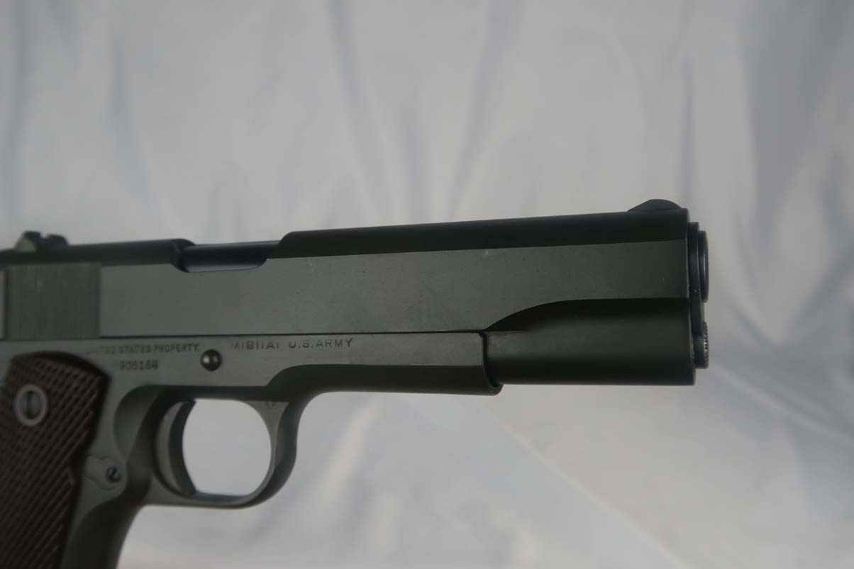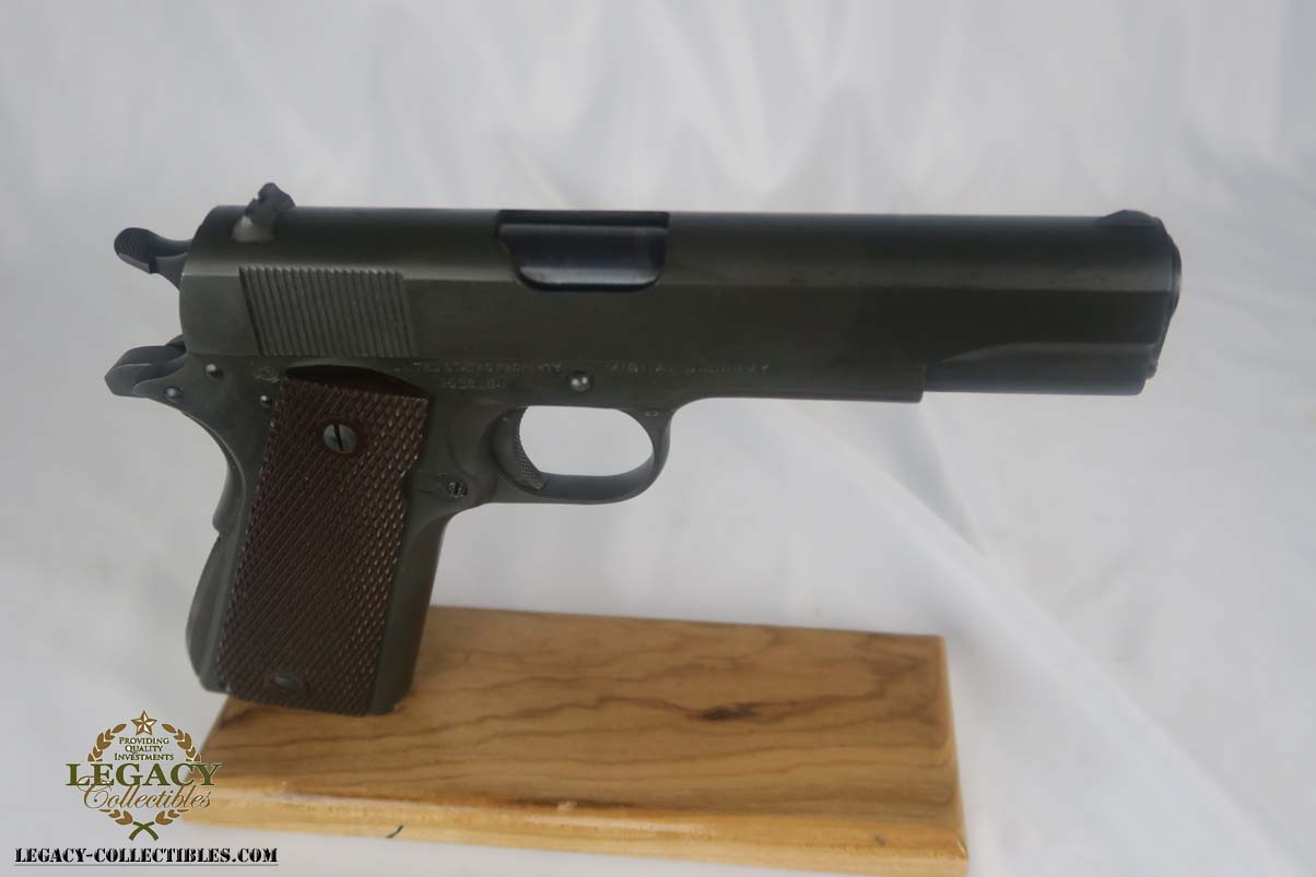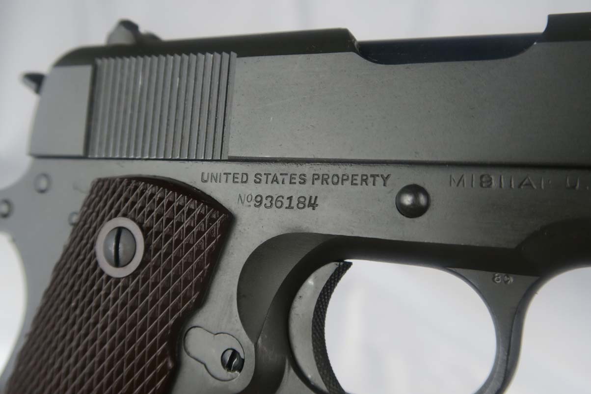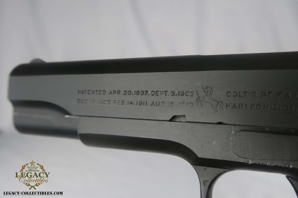 5/30/17 – This is a near-mint Colt M1911A1, manufactured in 1943.  The original finish rates at about 99%, with only a couple small dings beneath the slide stop, and almost zero finish loss.  The pistol has the matching number slide, which was discontinued a few months later.  This pistol was shipped from Colt to Springfield’s Armory in may of 1943.This pistol is all correct and original, with features such as P proofs on the slide and frame, G.H.D. inspector’s mark, proper Colt barrel and correct grips. This is an early GHD inspected pistol with small GHD marking.  Magazine is ‘S’ marked on the lip.  Bore is excellent with no pitting or frosting.