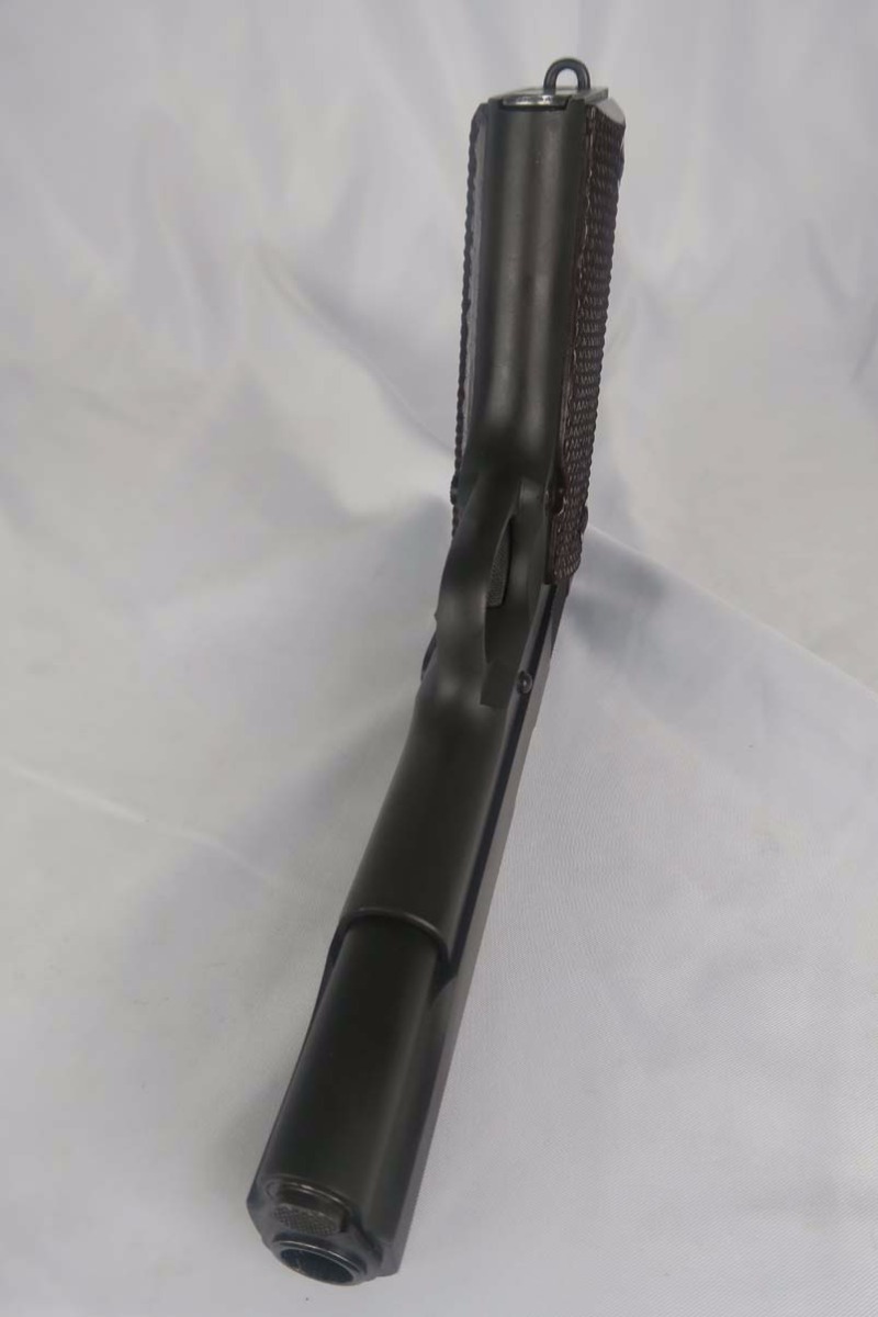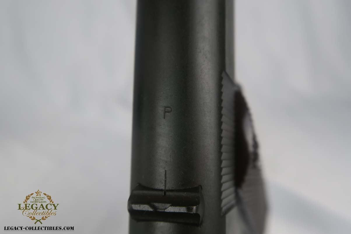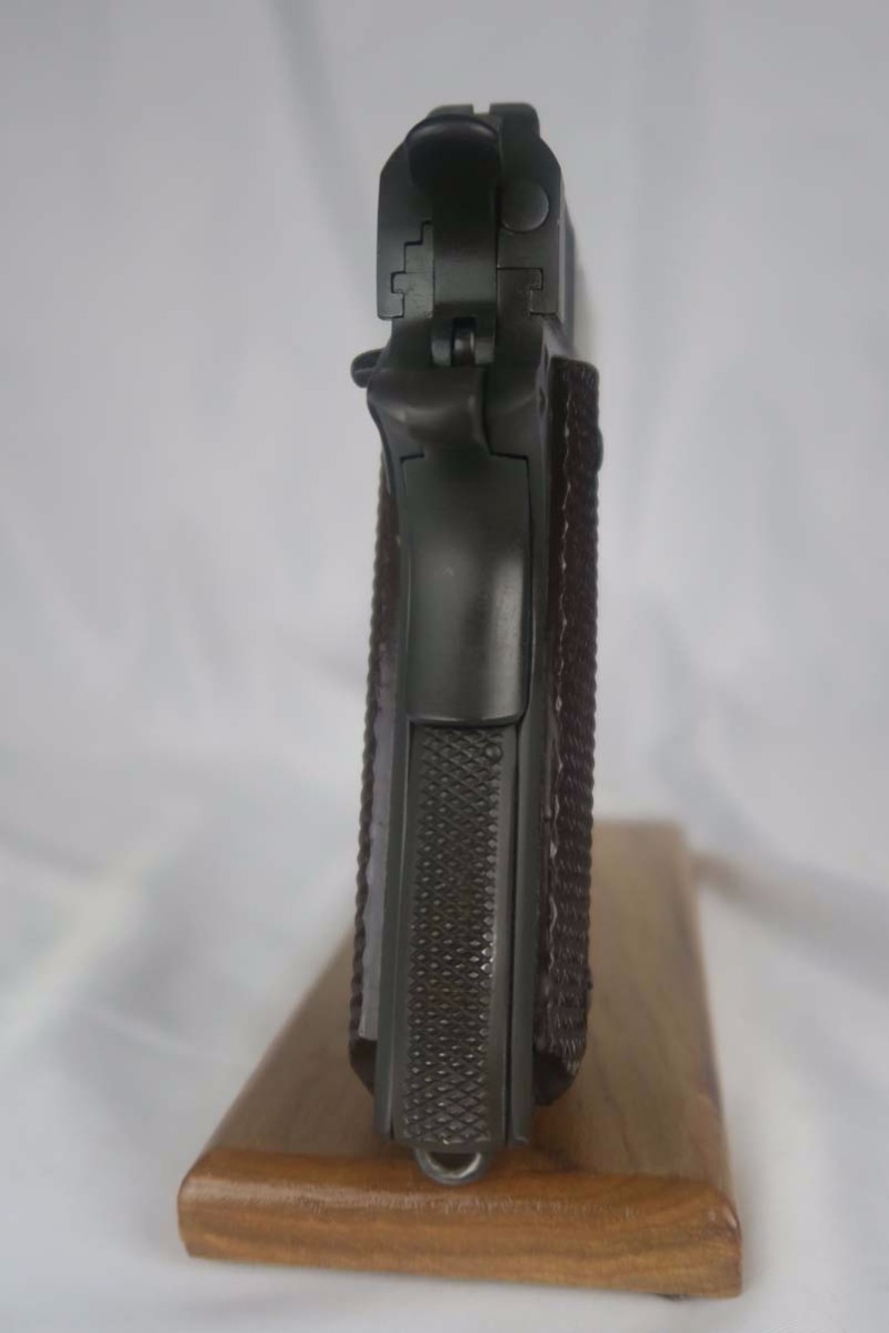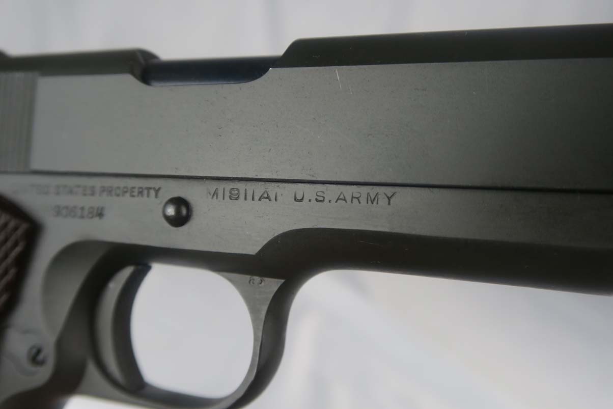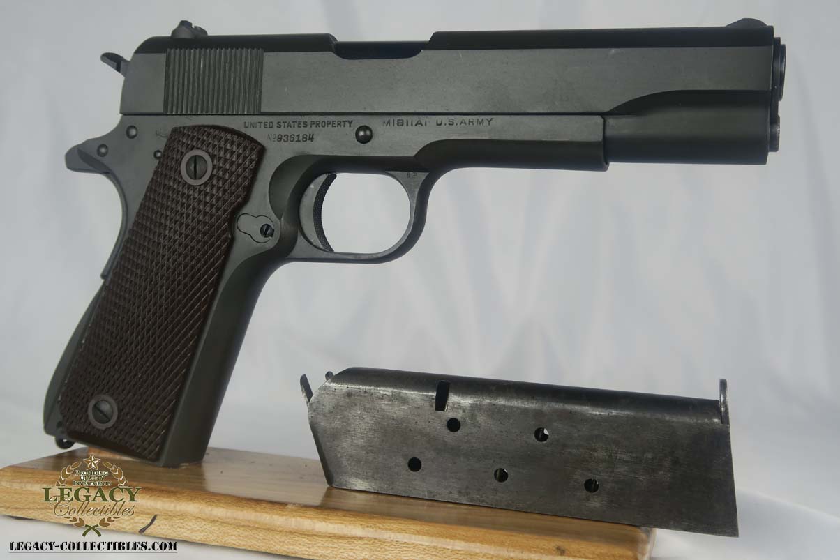 5/30/17 – This is a near-mint Colt M1911A1, manufactured in 1943.  The original finish rates at about 99%, with only a couple small dings beneath the slide stop, and almost zero finish loss.  The pistol has the matching number slide, which was discontinued a few months later.  This pistol was shipped from Colt to Springfield’s Armory in may of 1943.This pistol is all correct and original, with features such as P proofs on the slide and frame, G.H.D. inspector’s mark, proper Colt barrel and correct grips. This is an early GHD inspected pistol with small GHD marking.  Magazine is ‘S’ marked on the lip.  Bore is excellent with no pitting or frosting.