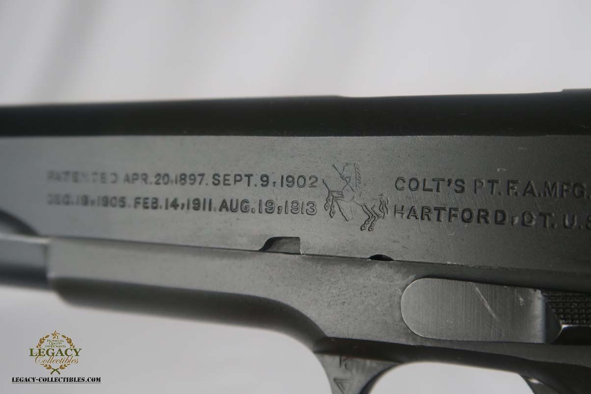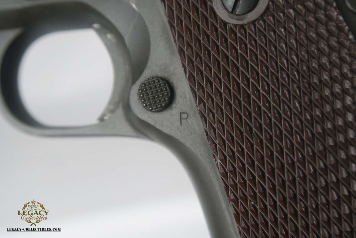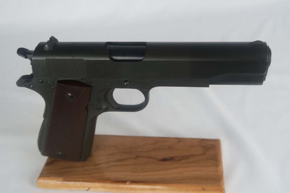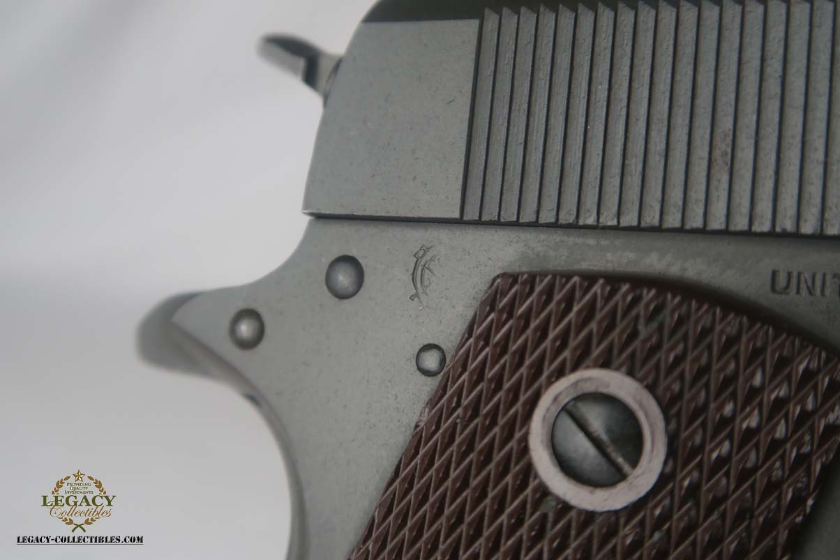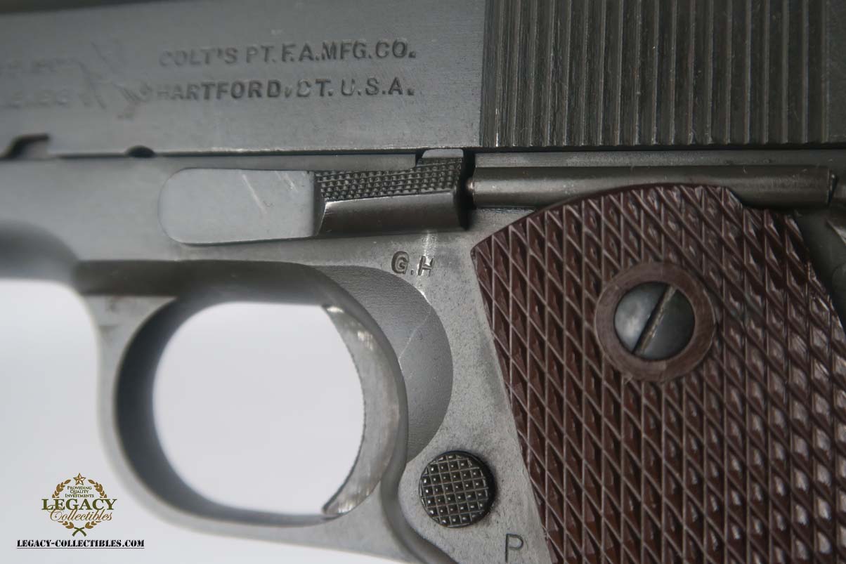 6/7/17 – It may seem like these minty slide numbered Colts grow on trees with how many we’ve listed in the past week or two, but WW2 era M1911A1’s in this condition are tough to find.  The original finish is over 99%, with no major issues to mention.  The slide is numbered to the frame, and the pistol is all original and correctly marked otherwise.  G.H.D. inspector proof and P proofs on frame and slide.  Proper barrel, grips and mag.  Bore has a little wear in it but generally clean with strong rifling.