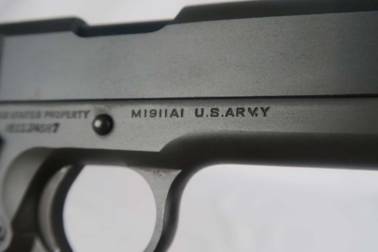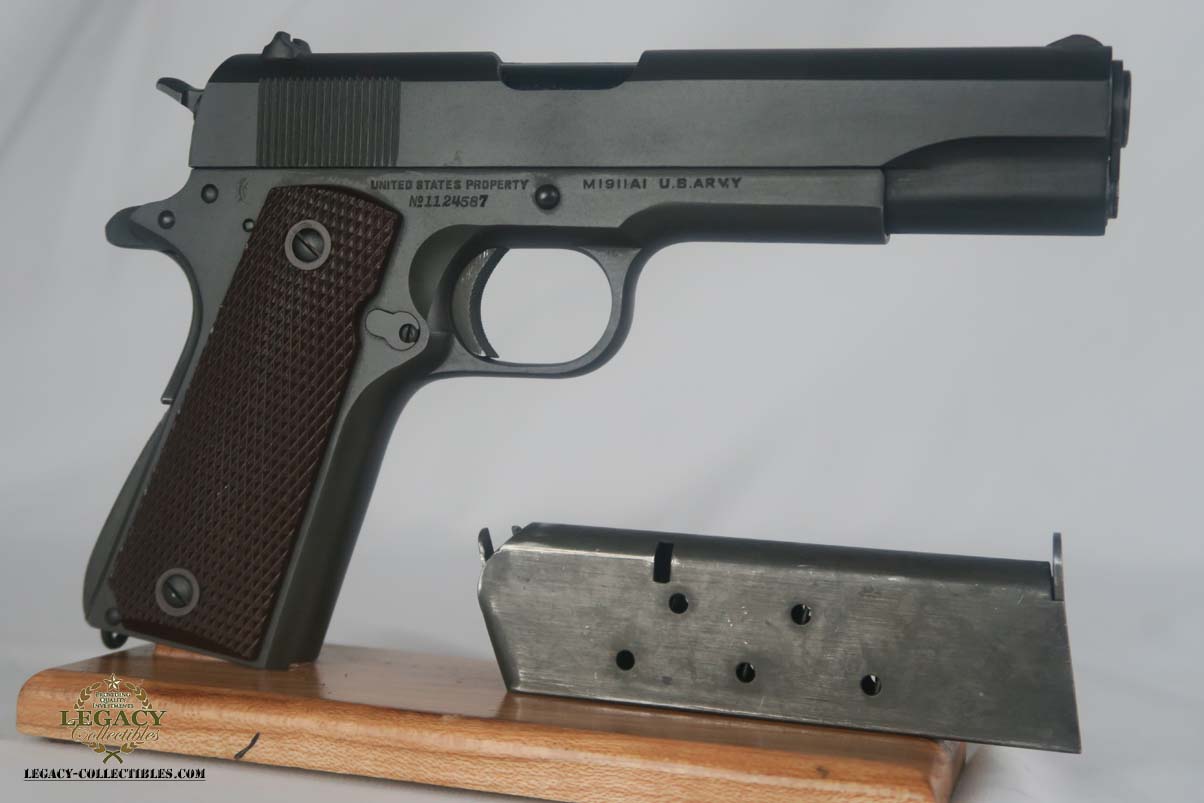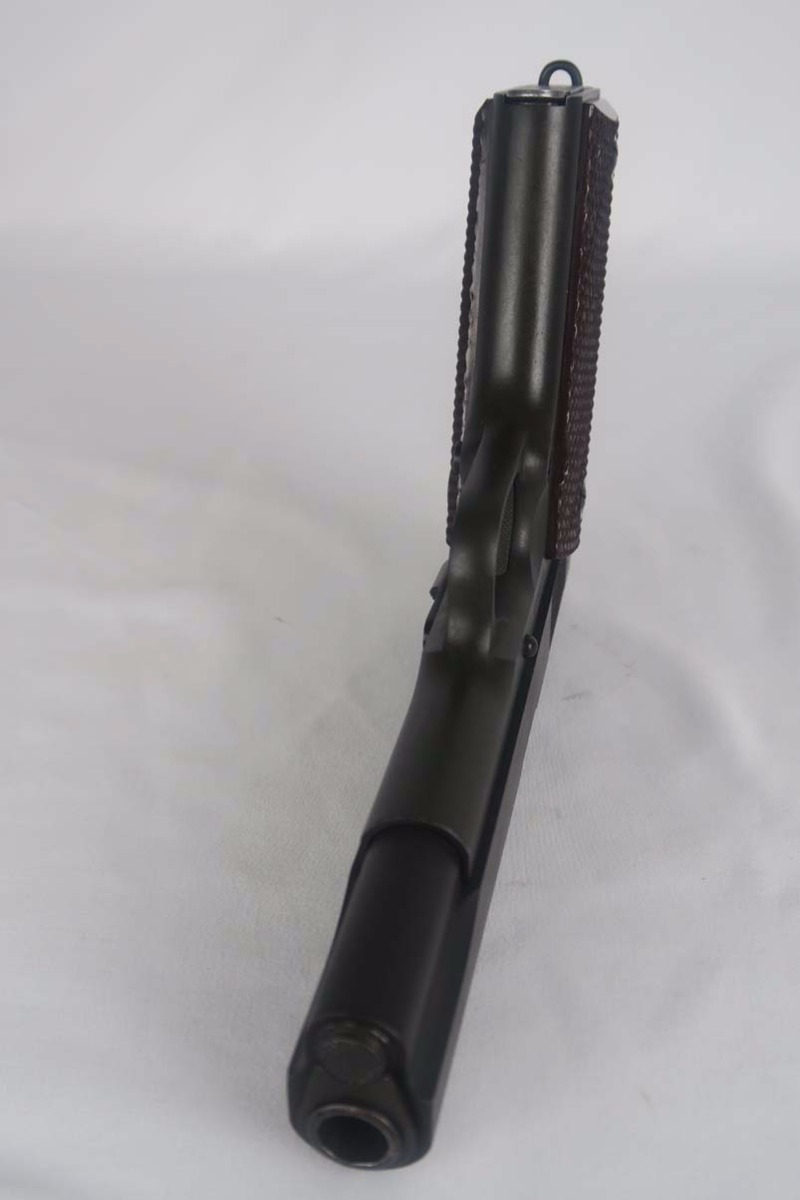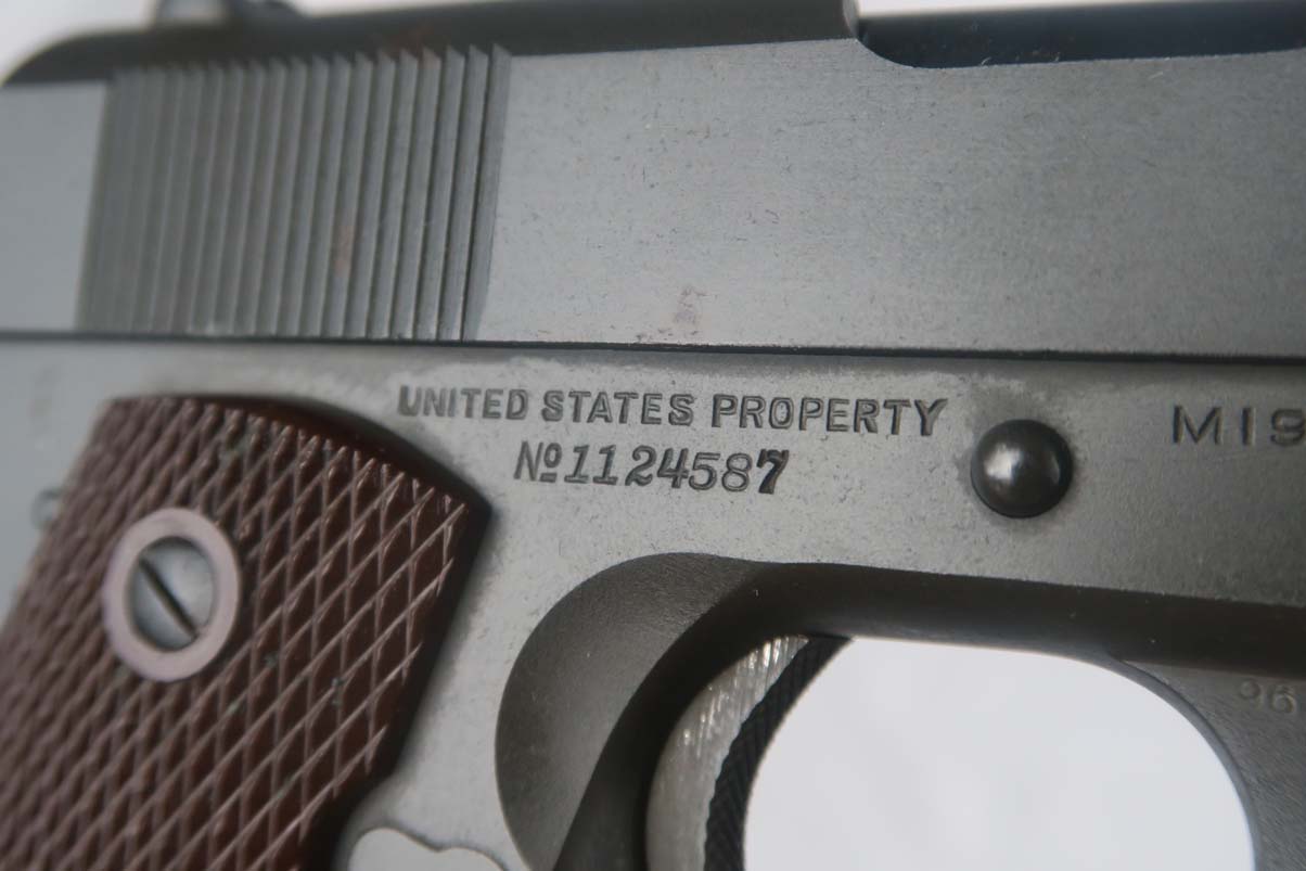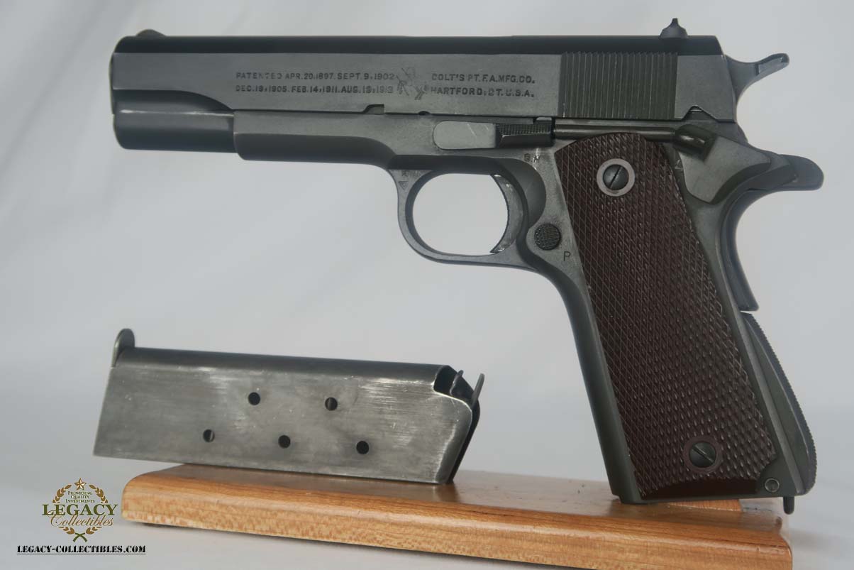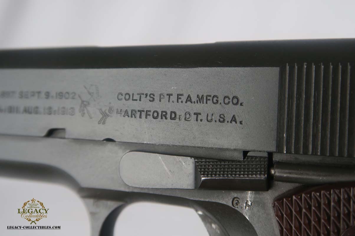 6/7/17 – It may seem like these minty slide numbered Colts grow on trees with how many we’ve listed in the past week or two, but WW2 era M1911A1’s in this condition are tough to find.  The original finish is over 99%, with no major issues to mention.  The slide is numbered to the frame, and the pistol is all original and correctly marked otherwise.  G.H.D. inspector proof and P proofs on frame and slide.  Proper barrel, grips and mag.  Bore has a little wear in it but generally clean with strong rifling.