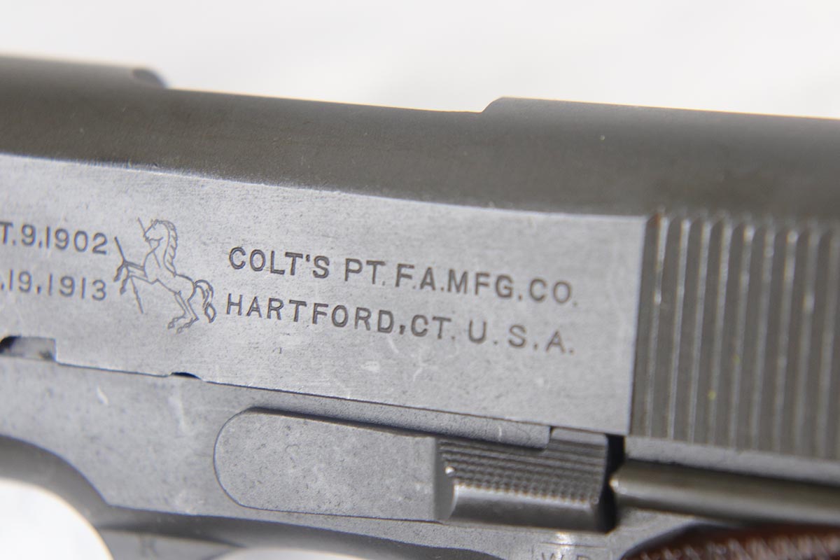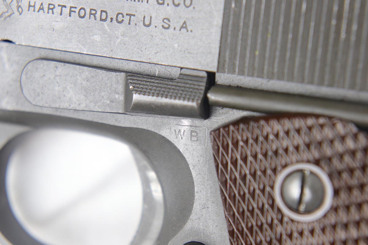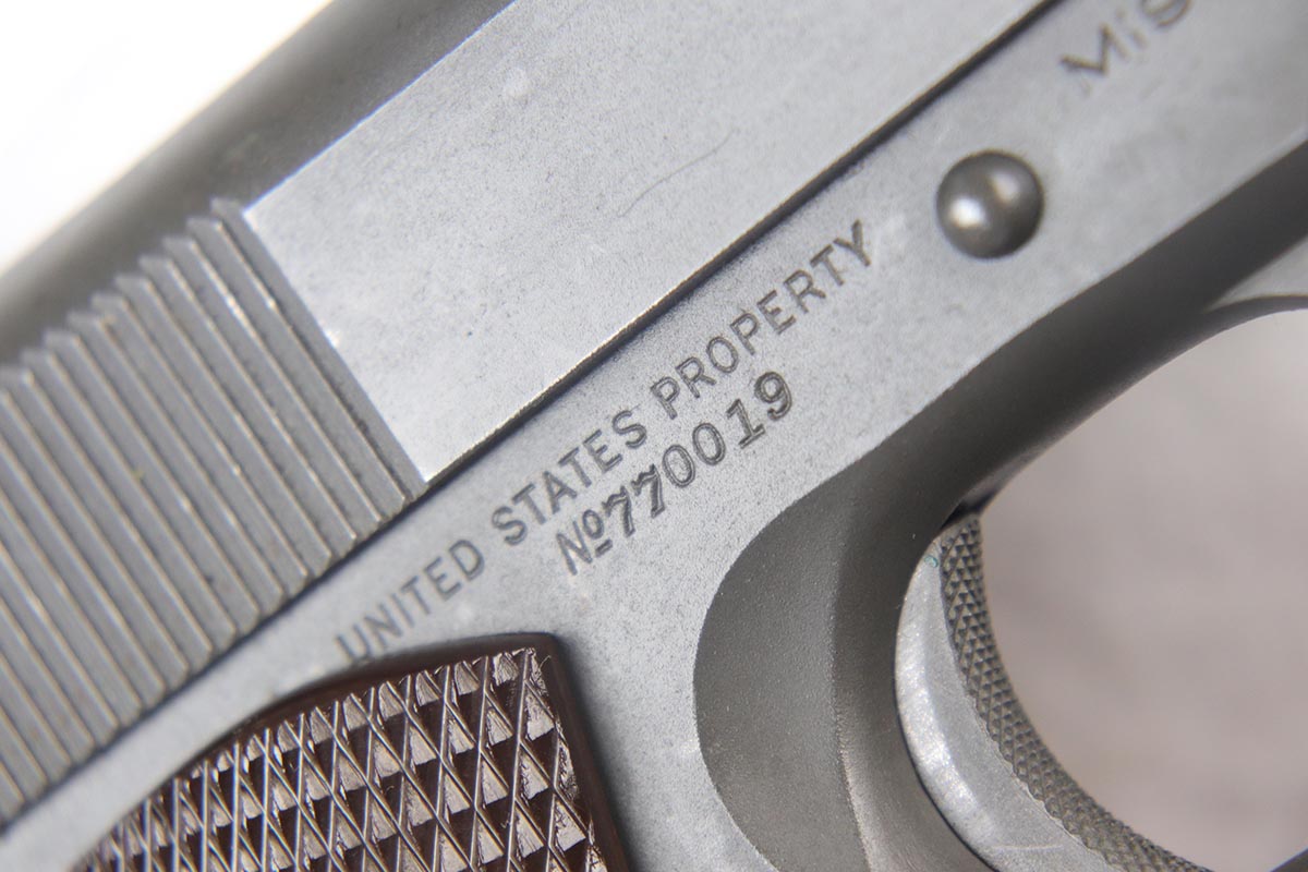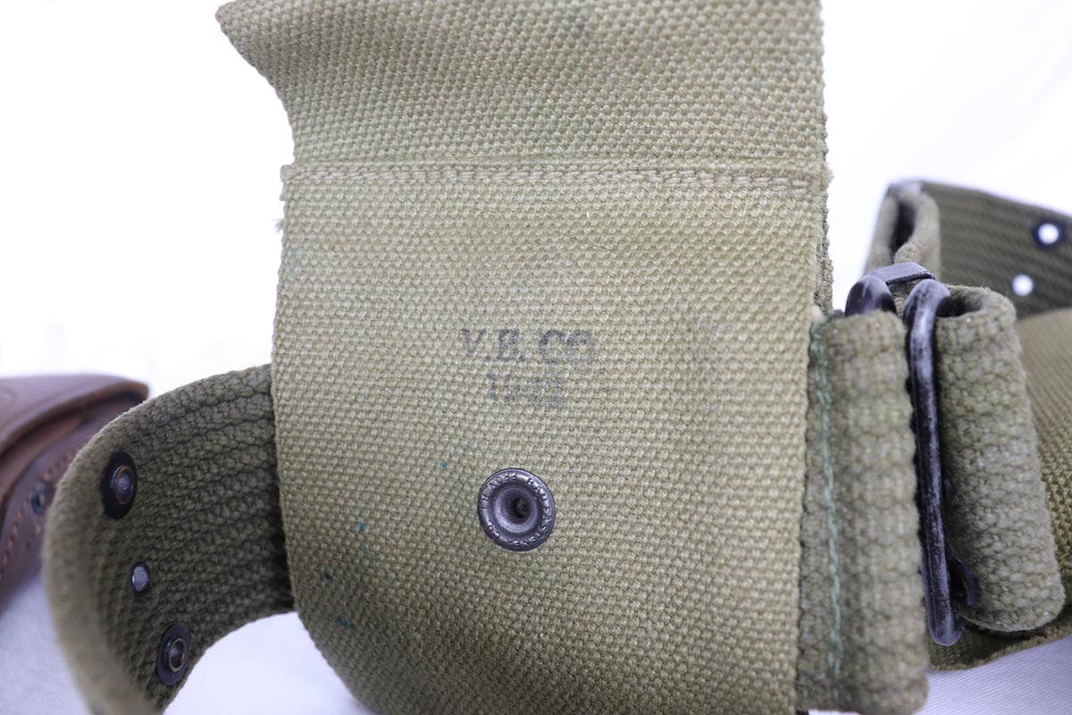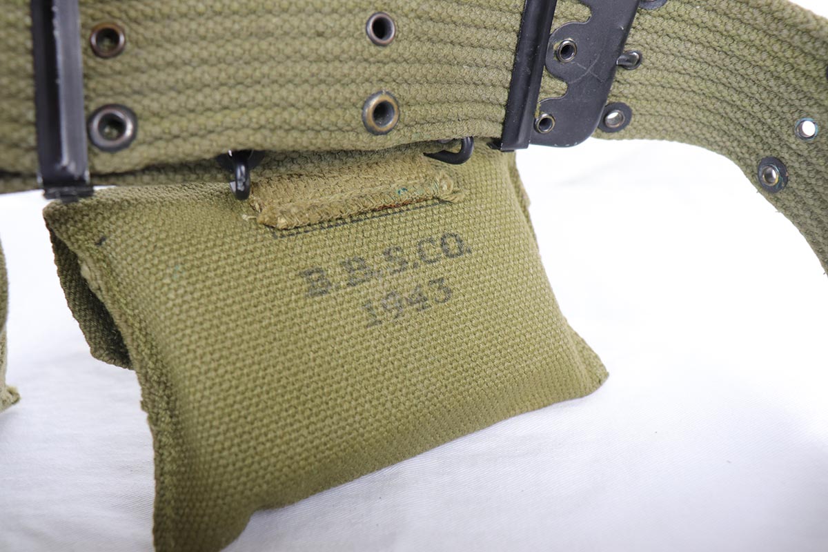 7/19/18 – This is a near-mint Colt M1911A1 rig, manufactured in 1942 with all correct inspector marks and proof stamps. The pistol retains 98-99% original parkerized finish with only minor finish loss on the underside of the slide. The slide is numbered to the frame, and the scarce barrel is ‘G’ proofed under the lug and has a mint bore. Minty grips and an ‘R’ marked magazine. The pistol comes with a 1942 dated Sears holster, as well as the original canvas belt with magazine pouch and first aid kit. Just an excellent example of an ‘as issued’ wartime rig.
