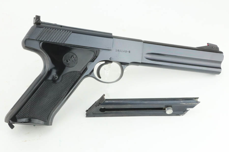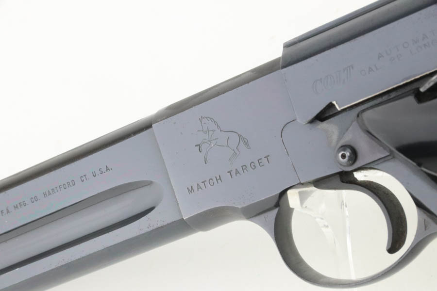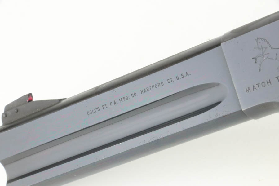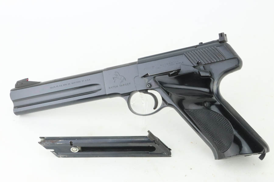8/8/24 – This is a minty example of a Colt Match Target, manufactured in 1968 and chambered in .22 LR. It is all matching and has retained nearly all of its original finish. There are just hints of high edge wear and one small area of wear at the base of the back strap. Fitted with excellent black bakelite grips and comes with one proper magazine. Mint bore.