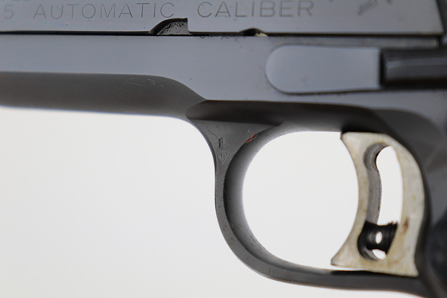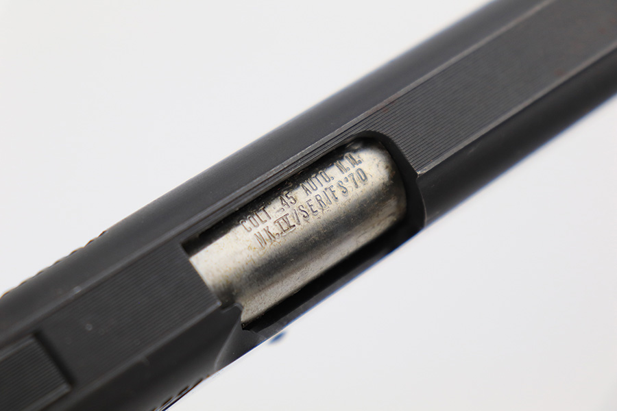 5/4/23 – This is a near-mint example of a Colt MK IV Series 70 Gold Cup National Match manufactured in 1975 and chambered in .45 ACP. It has retained nearly all of its original finish with just a hint of muzzle wear and a hint of thinning on the grip straps. There are a few small dots of surface rust on the top of the slide around the front sight – should clean off fairly easily. Fitted with minty wood grips. Comes with one magazine. Mint bore.