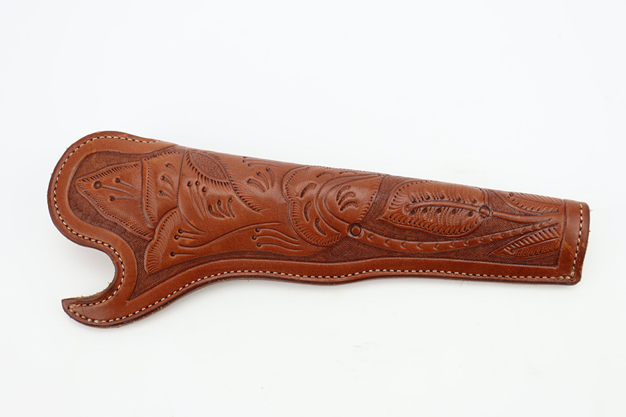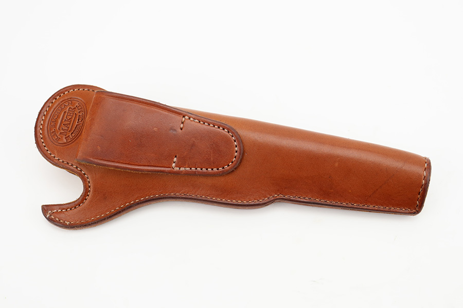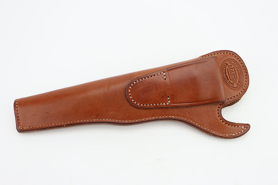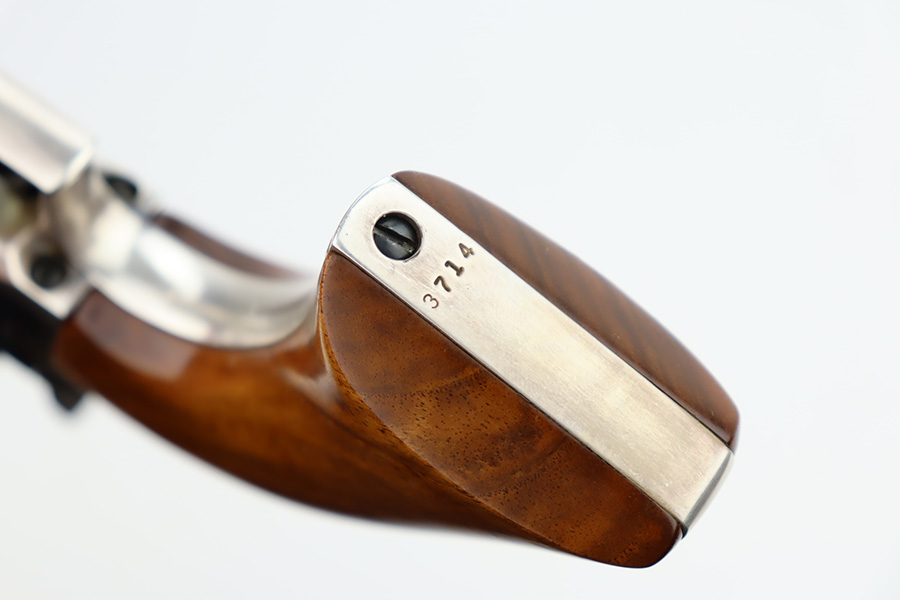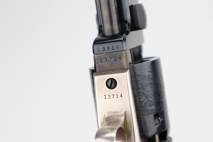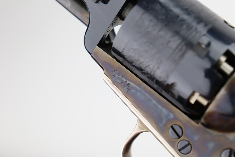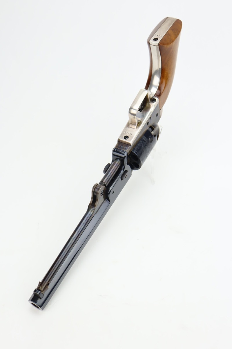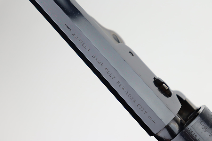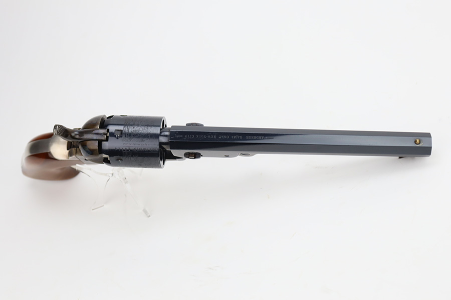 11/29/23 – This is a near-mint Colt 1851 revolver that was made as part of their more recent reproduction run on this model and the others of its era. It has a little bit of wear on one side of the muzzle but is minty otherwise. Strong, shiny bore with only minor hints of frost. No turn line on the cylinder. Minty wood grips. Beautiful case hardening on the loading lever, frame and hammer. Listing includes two leather holsters, made by R.M. Bachman in Montana.