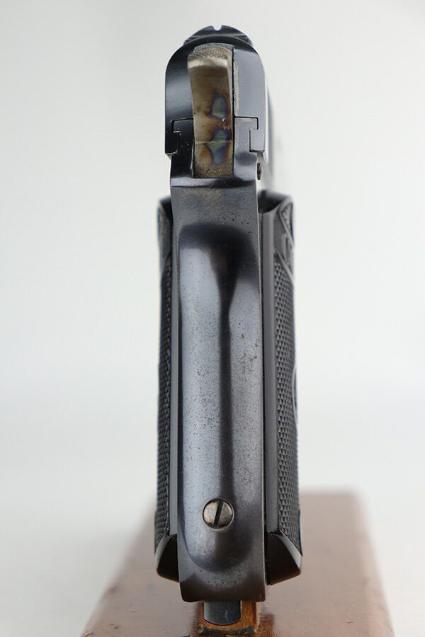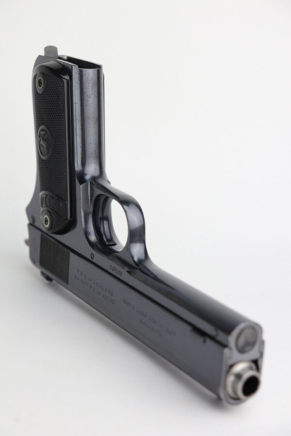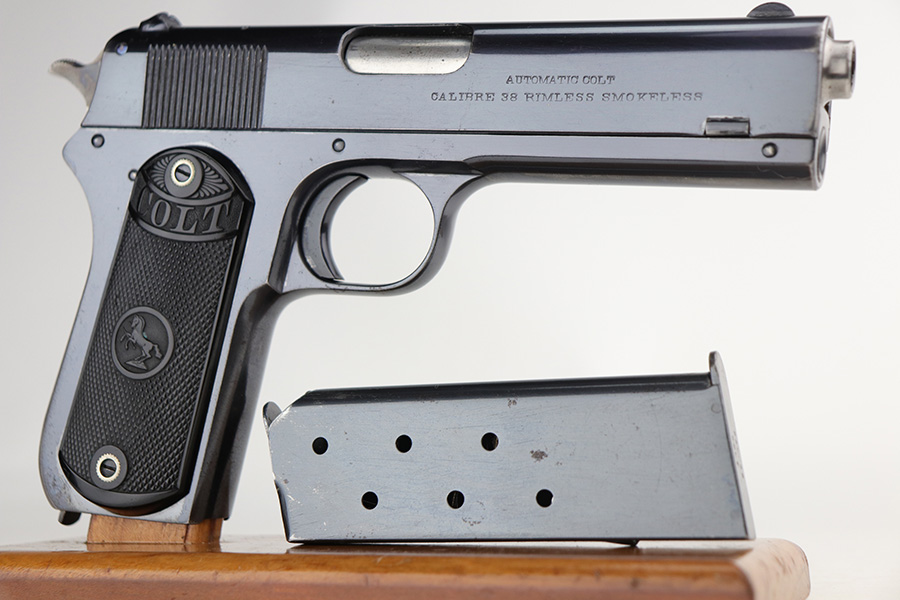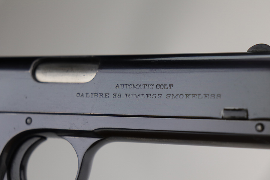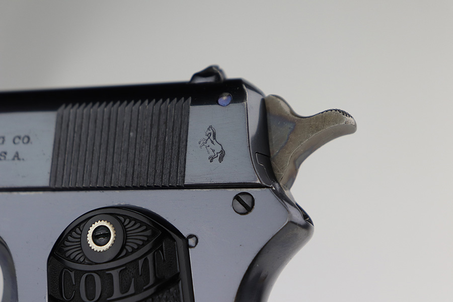 1/9/23 – This is a beautiful, near-mint example of a Colt Model 1903 Pocket Hammer pistol, manufactured in 1917. It is all matching and has the proper rampant Colt logo on the slide. It has retained about 98% of its high polish Colt blued finish. The beautiful case hardening is still intact on the hammer. There are just faint hints of wear on the high edges of the slide and around the muzzle. A few extremely light surface scratches here and there on the slide. There is some tiny freckling on both grip straps. Comes with excellent period-correct black hard rubber grips and a proper magazine. The bore is shiny with strong rifling with some areas of minor freckling.