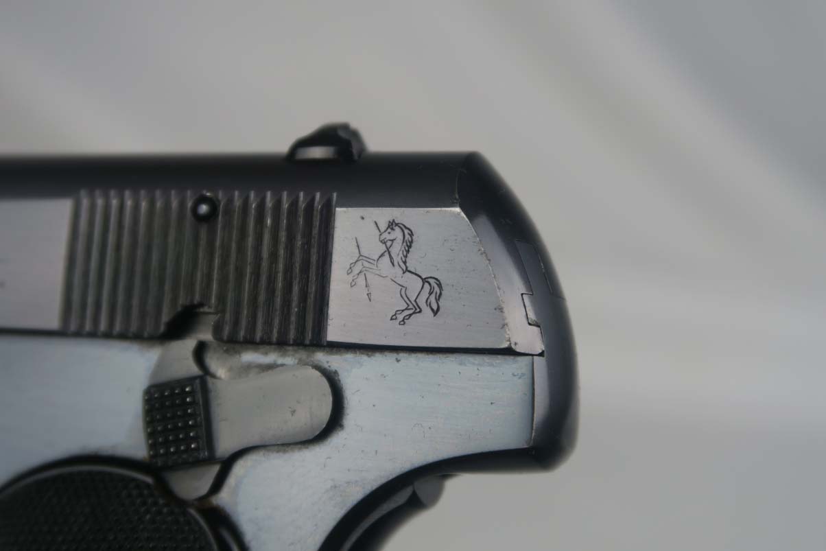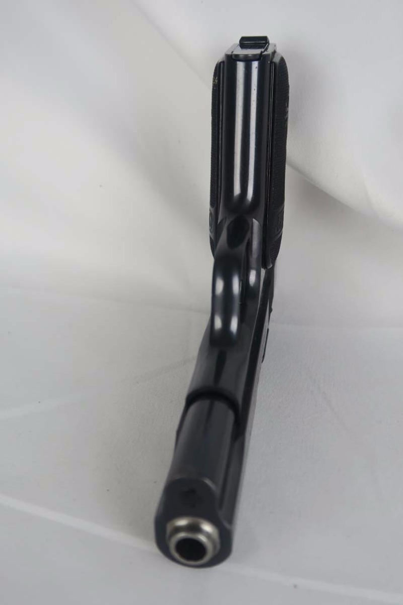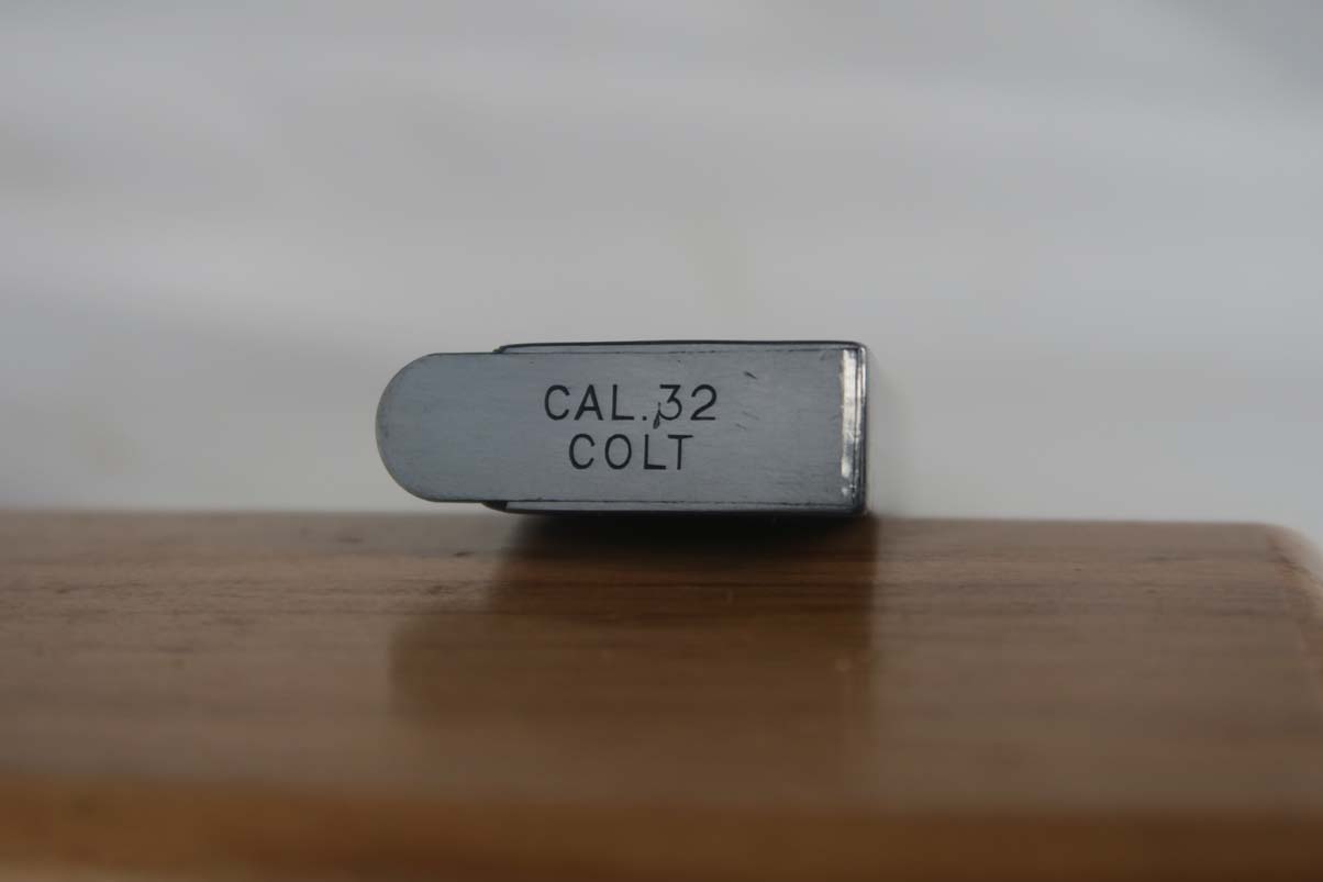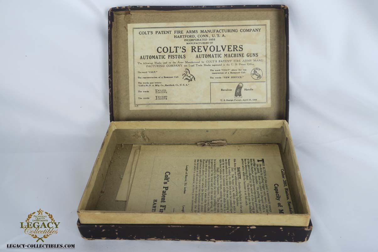3/31/17 – This is a minty Colt model 1903 Pocket Hammerless in its original box!  The finish rates at 99%, with only minor edge wear, though there is a little bit of freckling on the right side of the slide beneath the ejection port.  The box is matching to the gun, though the serial can be seen only faintly on the bottom in pencil.  Serial number dates this pistol to a manufacture date of 1921.  Correct magazine and grips, all original parts on the gun.  Bore is a 7 or 8 out of 10, just a little smoothing to the grooves.