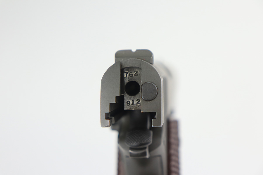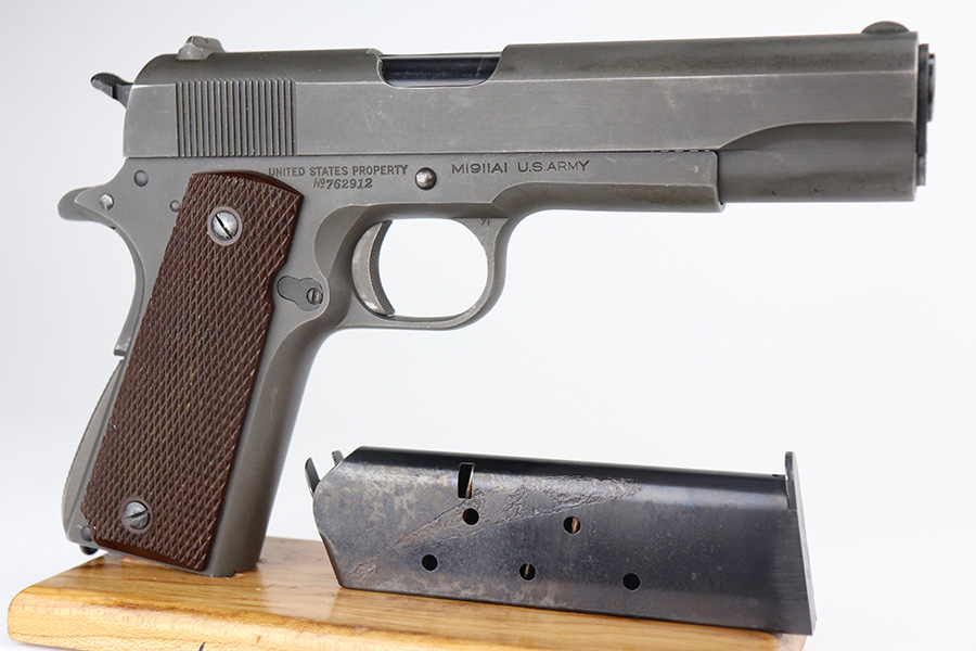 6/17/21 – This is a near-mint example of a Colt M1911A1 issued to the US military in 1942. The gun is all correct and matching – matching numbered slide. It is has the proper “United States Property” mark. “Colt Auto .45” barrel with a large “G” under the lug. The gun has retained more than 98% of its parkerized finish. There are hints of wear on the high edges and around the muzzle. Some very minor discoloration on the undersides of the slide and frame. Comes with excellent correct grips and one magazine. The bore has strong rifling with pin-pricking in the grooves.