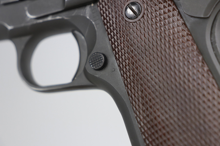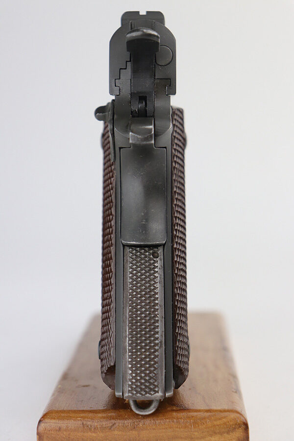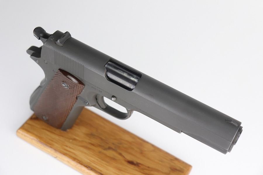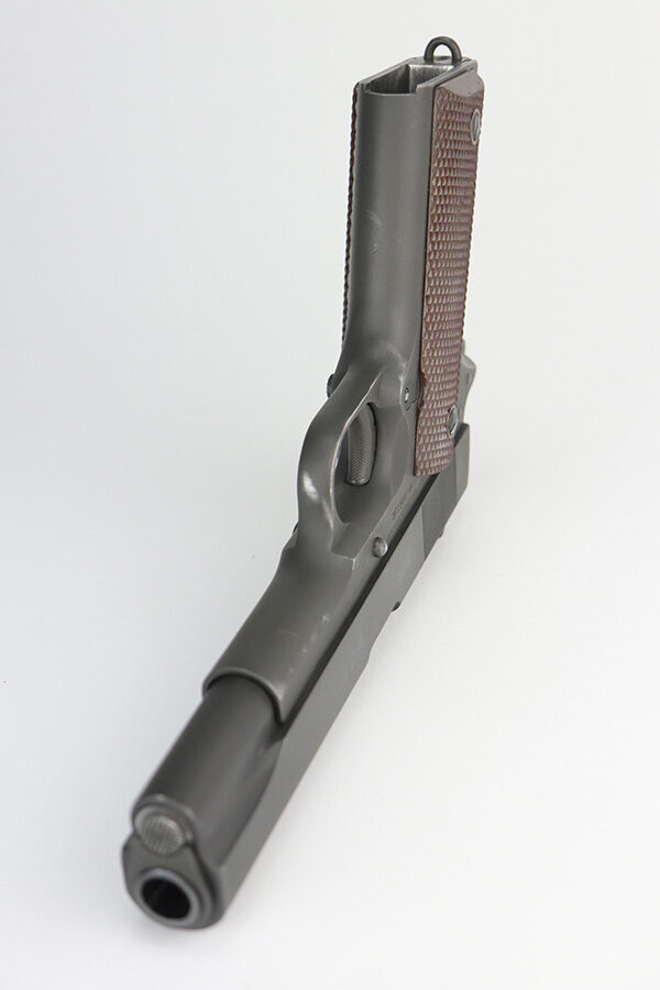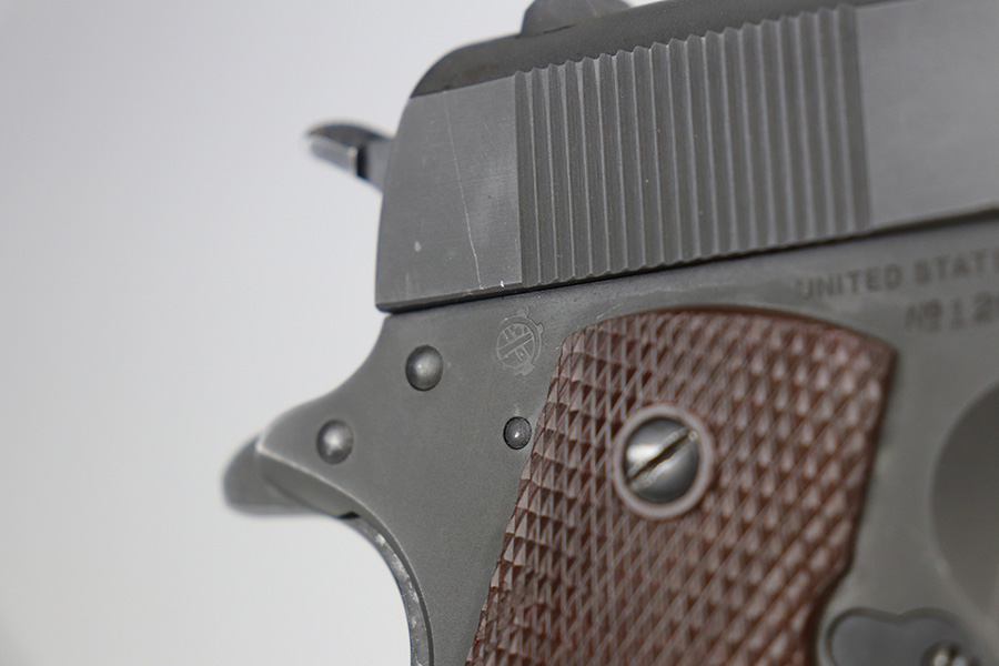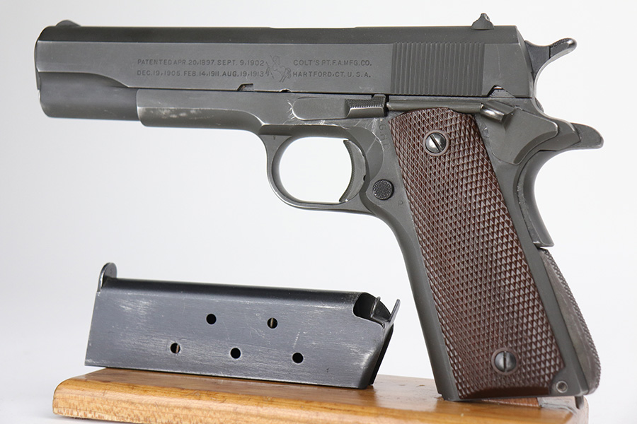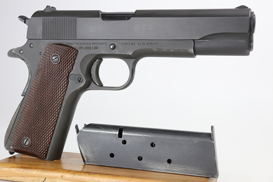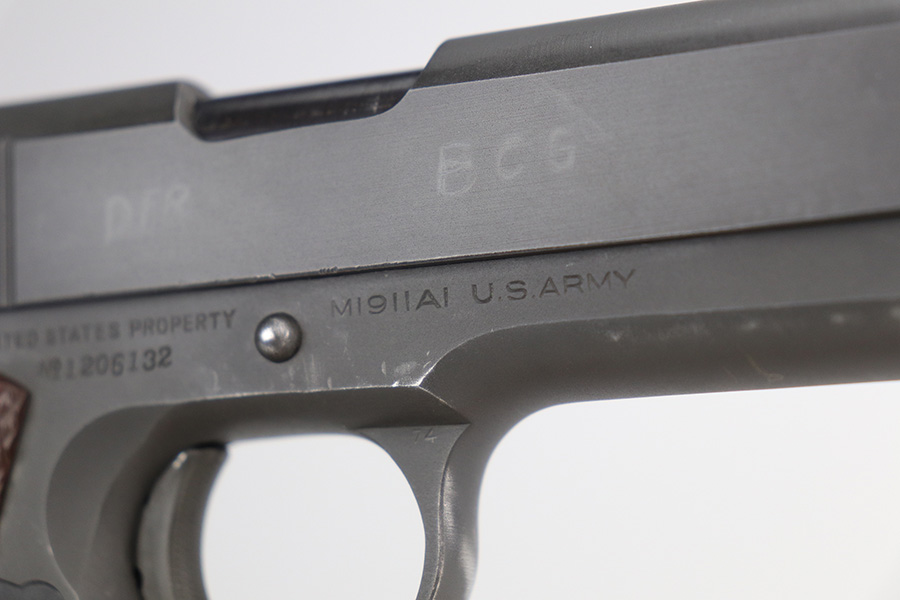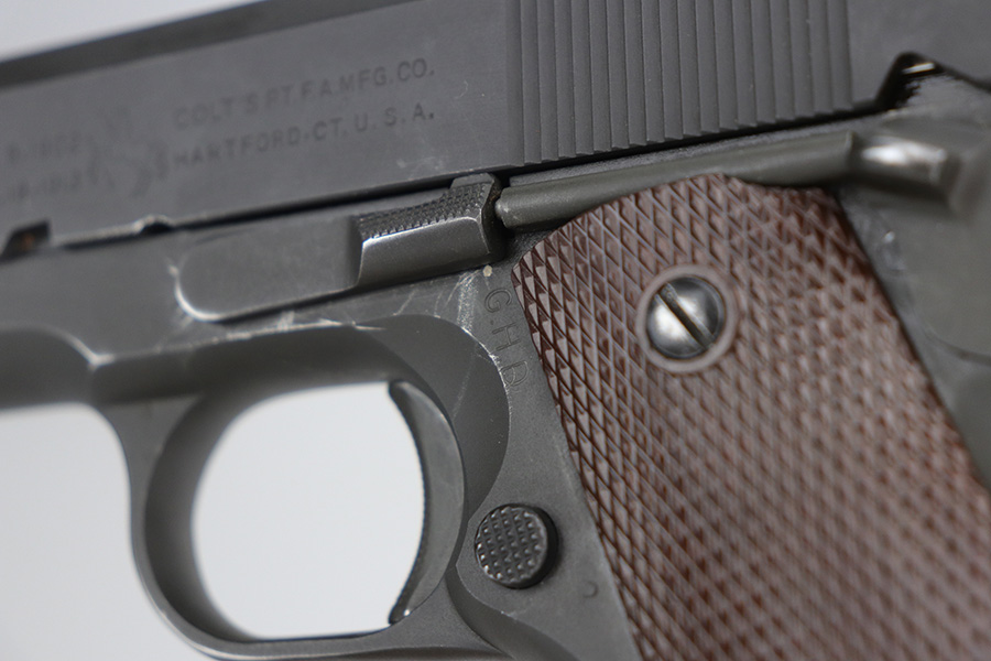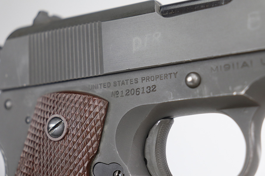 2/28/23 – This is a minty example of a Colt Model 1911A1 issued to the US military in 1943. It is “United States Property” marked, has the proper “GHD” inspector initials, and has the correct cross-canon military cartouche. It also has a proper Colt barrel. The gun has retained about 97% of its parkerized finish. Unfortunately, someone scratched “DFR” and “BCG” initials lightly into the right side of the slide. There are a few small spots of wear on the very front edge of the frame and some handling marks around the takedown lever. There is some spotty wear on the grip safety and one or two small handling marks on the front strap. Comes with excellent plastic grips and a period-correct unmagazine. The bore is mint.