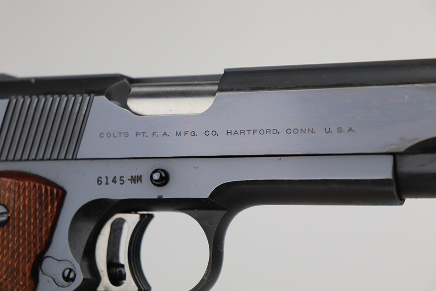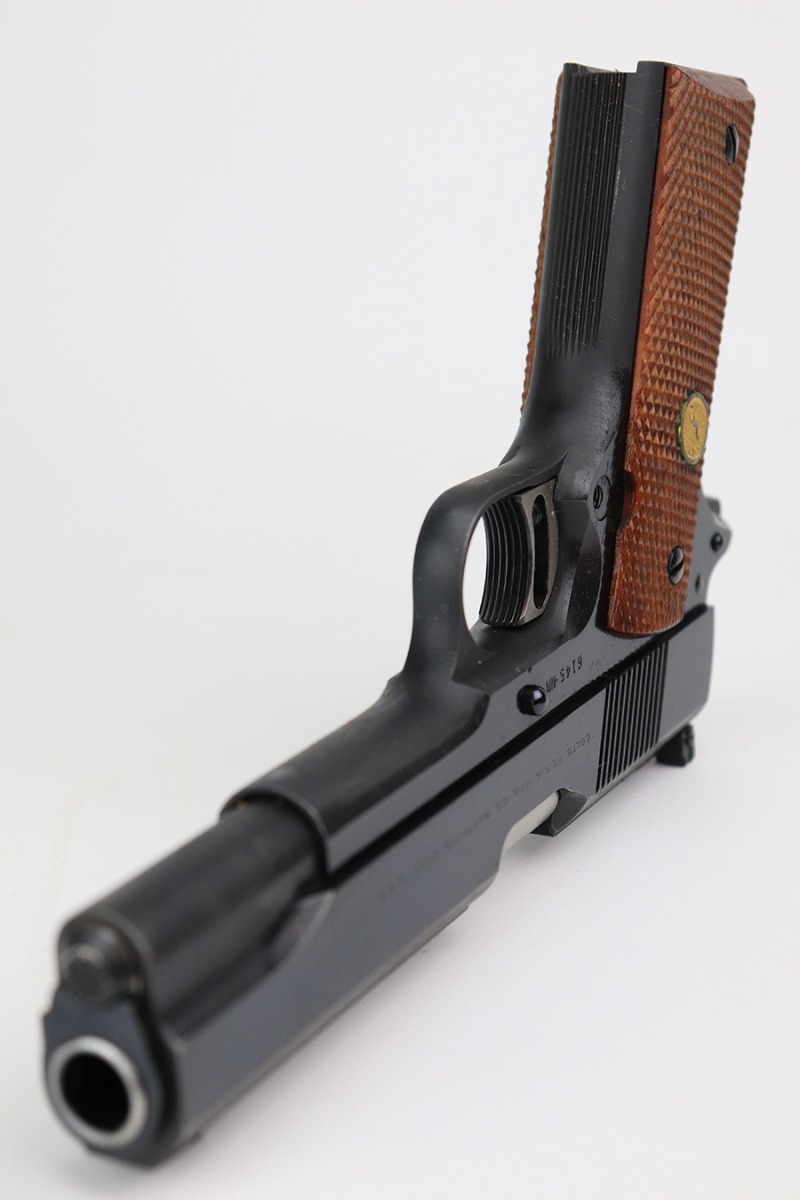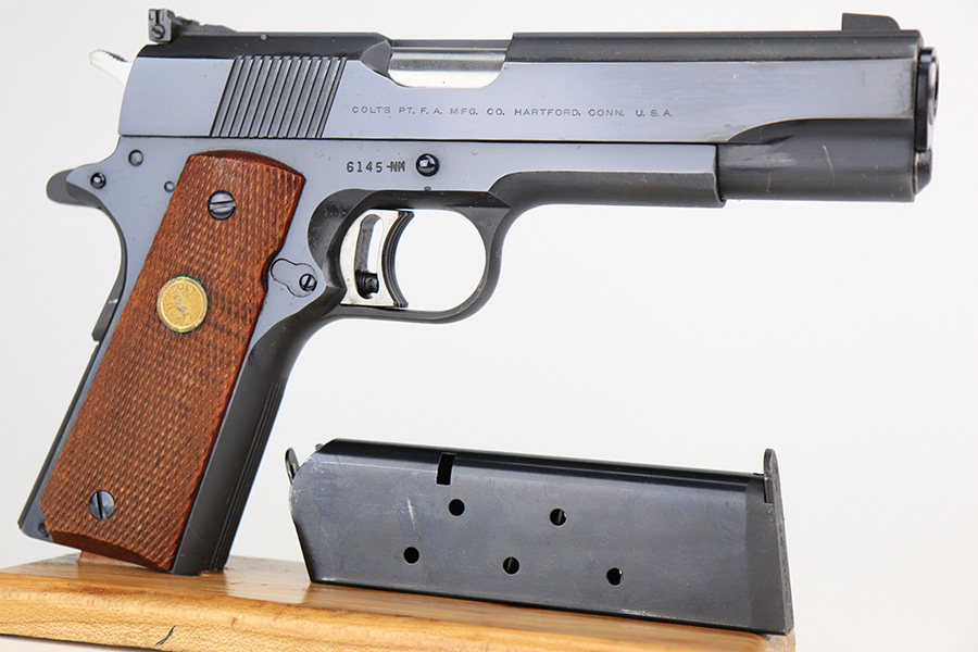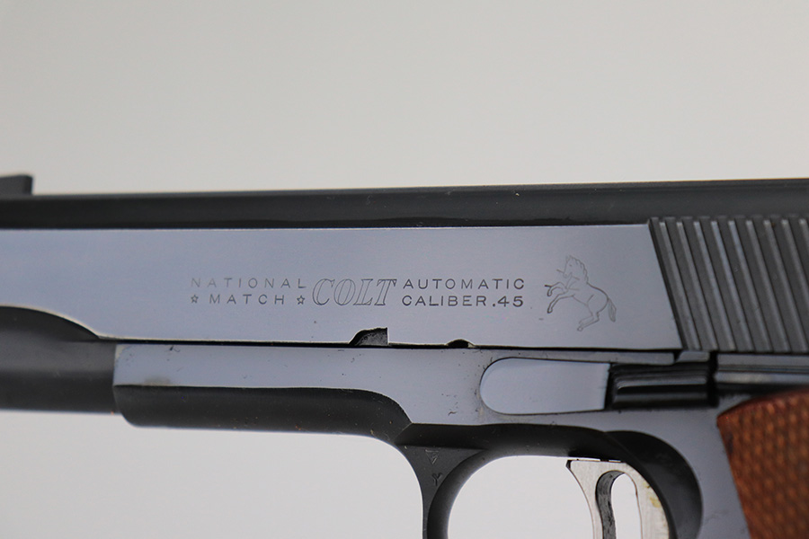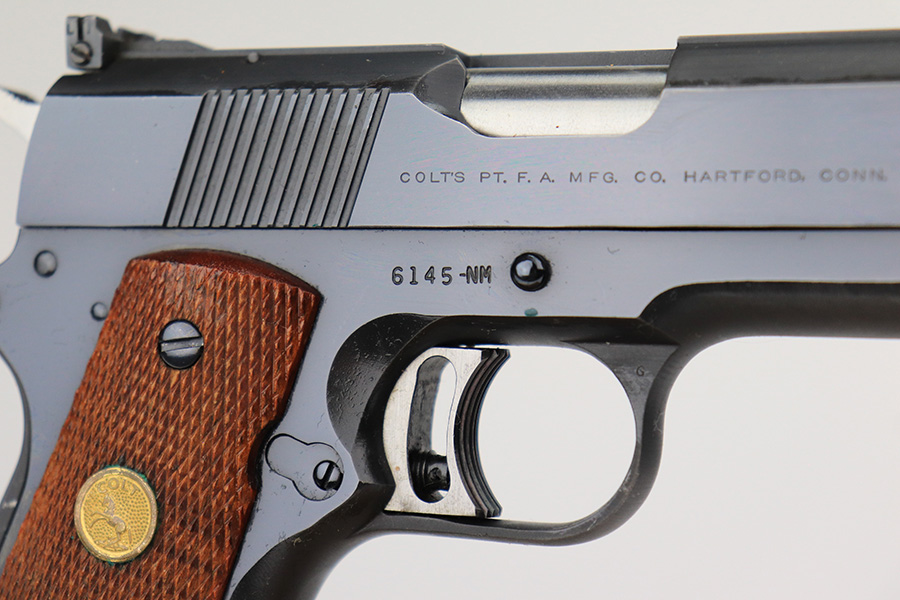 5/19/22 – This is a near-mint example of a Colt National Match Model 1911 manufactured in 1960 and chambered in .45 ACP. It has retained nearly all of its original finish with a couple of small spots of wear and two very light scratches on the right side of the slide. Comes with minty wood grips and one proper magazine. Mint bore.