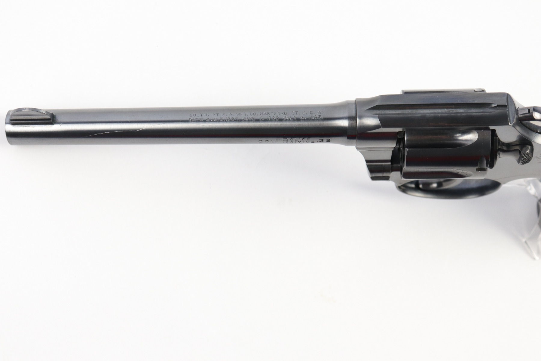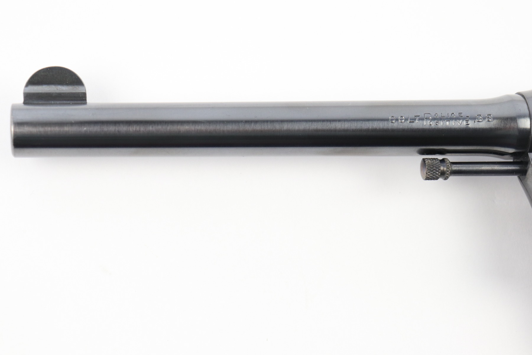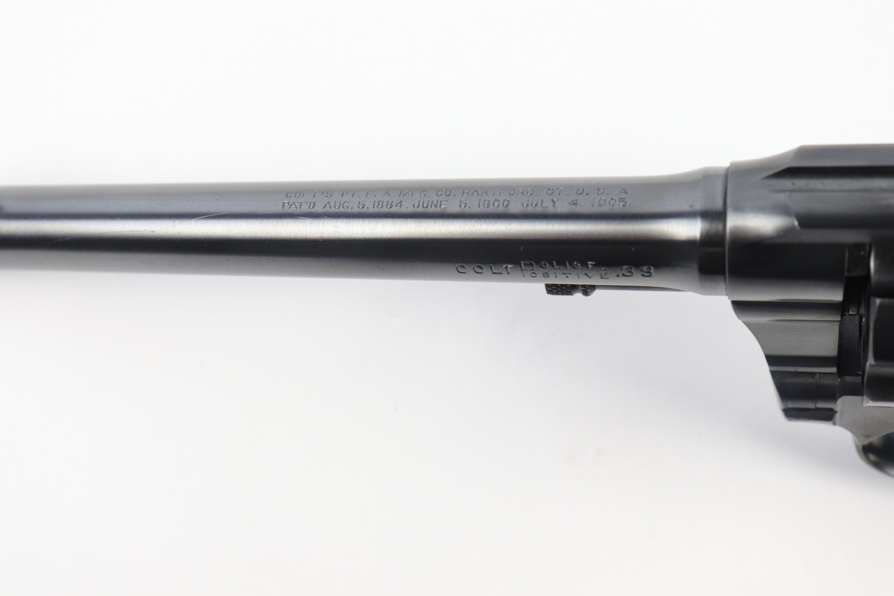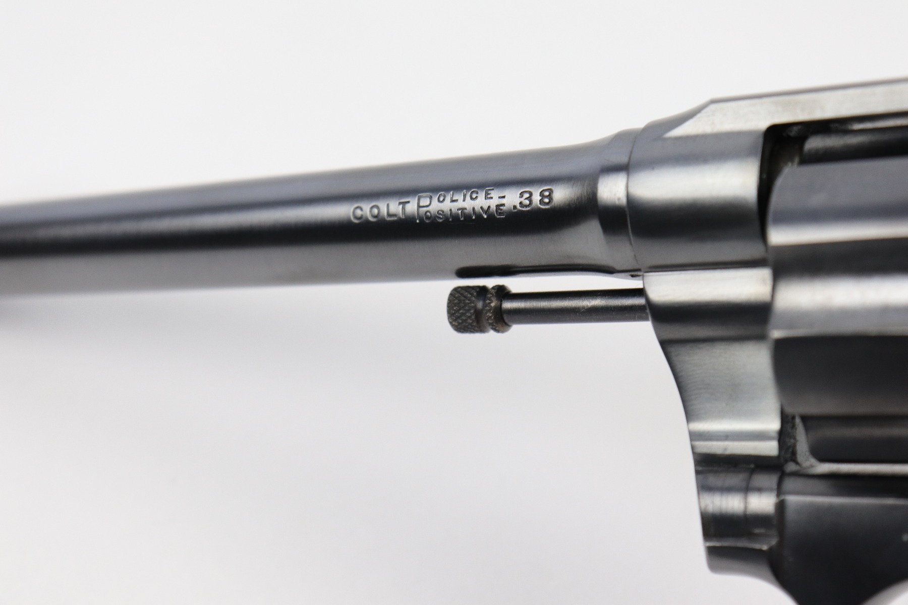 3/16/18 – This is an original, excellent first-issue Colt Police Positive revolver. The beautiful Colt factory bluing is still in excellent condition with only approx. 2% wear throughout the entire gun. There is some very light surface scratching on the barrel that can only be seen in the right angle and lighting, but otherwise the gun is close to mint. The back strap of the grip has very light, minimal patina. The cylinder has typical roll marks, but the bore looks minty – almost un-fired. Guaranteed original and authentic.