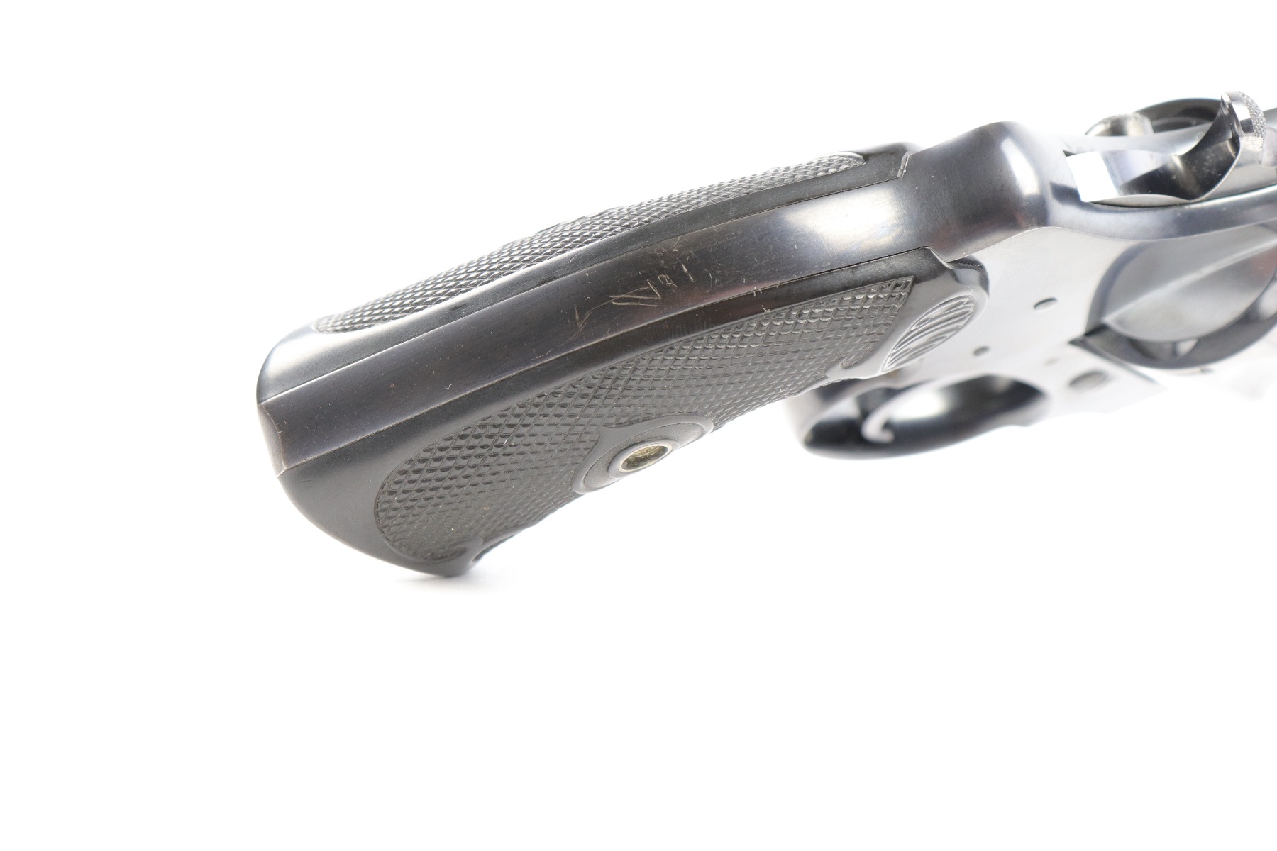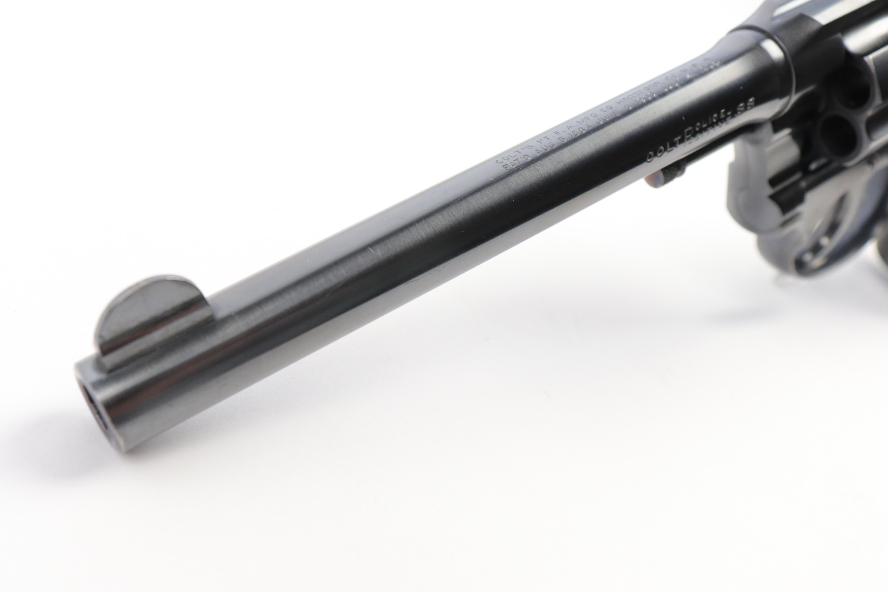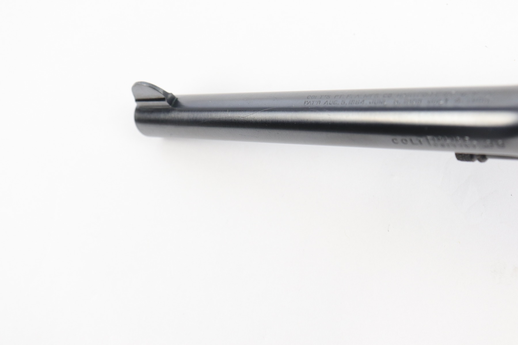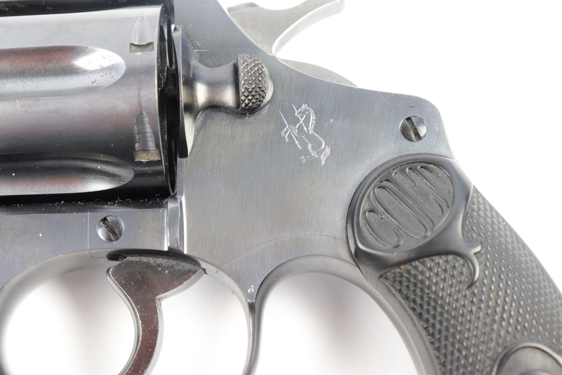 3/16/18 – This is an original, excellent first-issue Colt Police Positive revolver. The beautiful Colt factory bluing is still in excellent condition with only approx. 2% wear throughout the entire gun. There is some very light surface scratching on the barrel that can only be seen in the right angle and lighting, but otherwise the gun is close to mint. The back strap of the grip has very light, minimal patina. The cylinder has typical roll marks, but the bore looks minty – almost un-fired. Guaranteed original and authentic.
