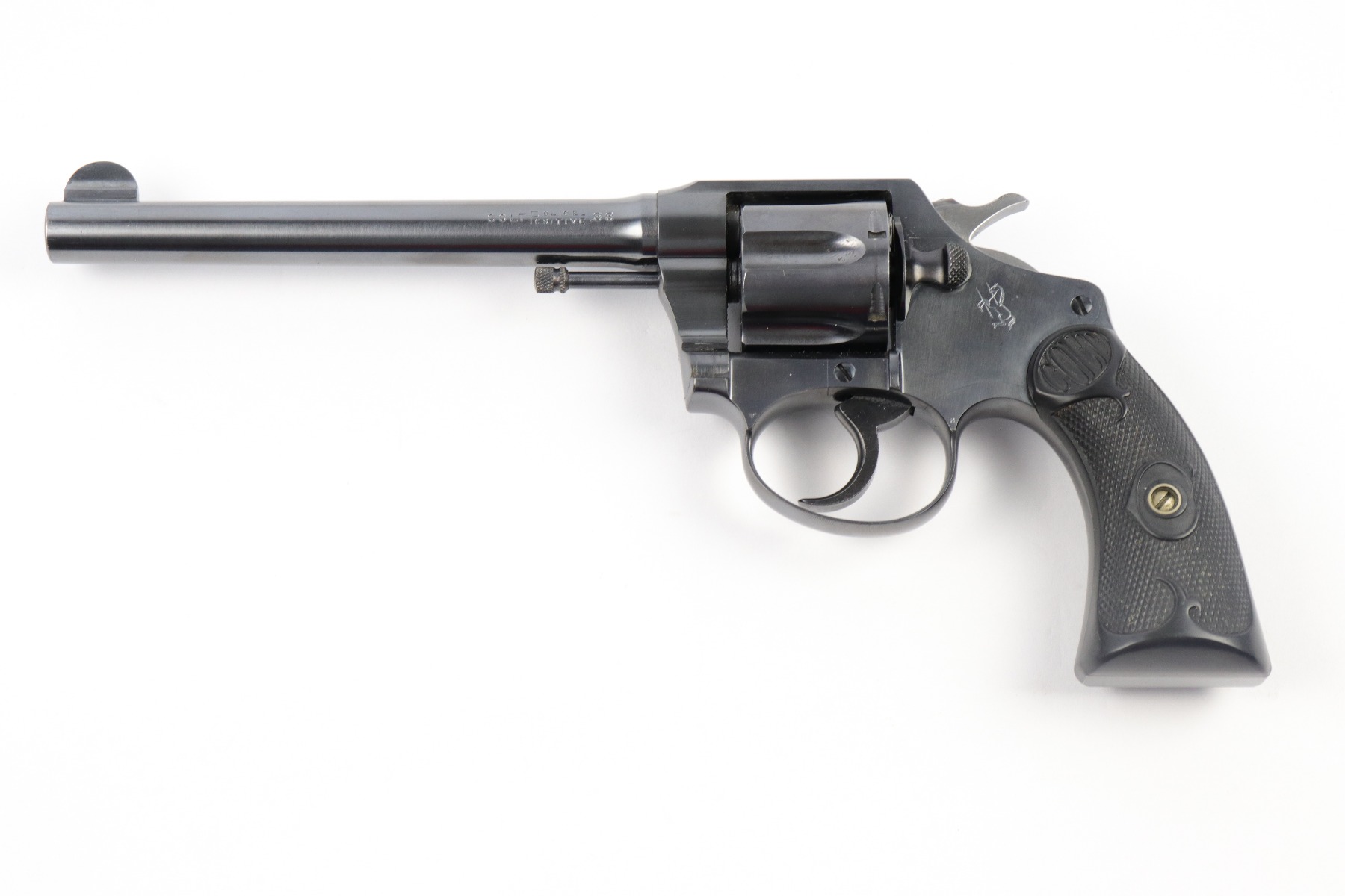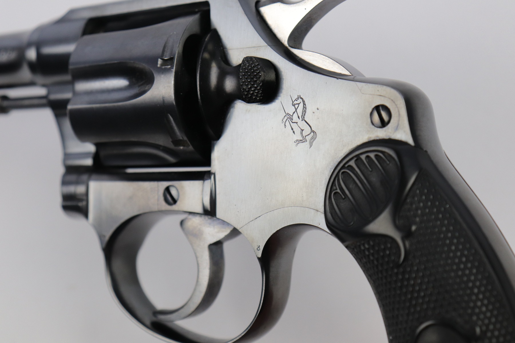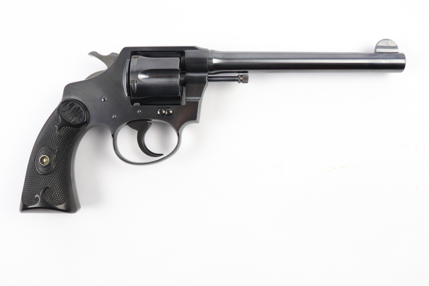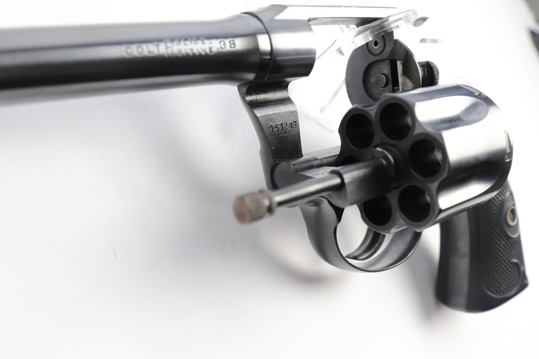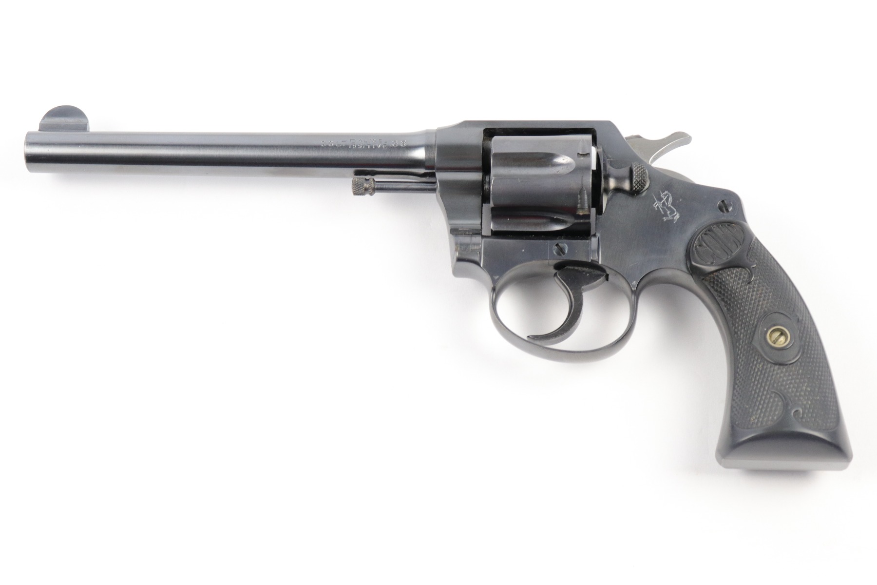 3/16/18 – This is an original, excellent first-issue Colt Police Positive revolver. The beautiful Colt factory bluing is still in excellent condition with only approx. 2% wear throughout the entire gun. There is some very light surface scratching on the barrel that can only be seen in the right angle and lighting, but otherwise the gun is close to mint. The back strap of the grip has very light, minimal patina. The cylinder has typical roll marks, but the bore looks minty – almost un-fired. Guaranteed original and authentic.
