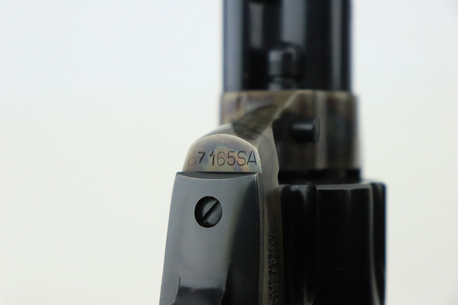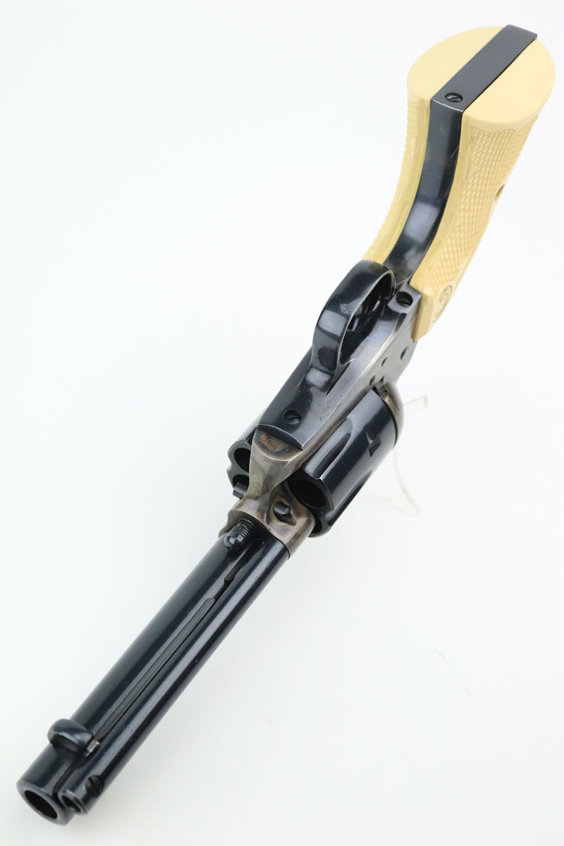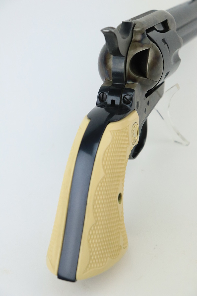 6/16/22 – This is a minty Colt Single Action Army revolver from 1977. It’s a third gen example with 99% of the blue remaining. Tiny bit of muzzle and hardly even a turn line on the cylinder. Barrel is 4.75in with a mint bore. The grips are checkered simulated ivory. FFL required.