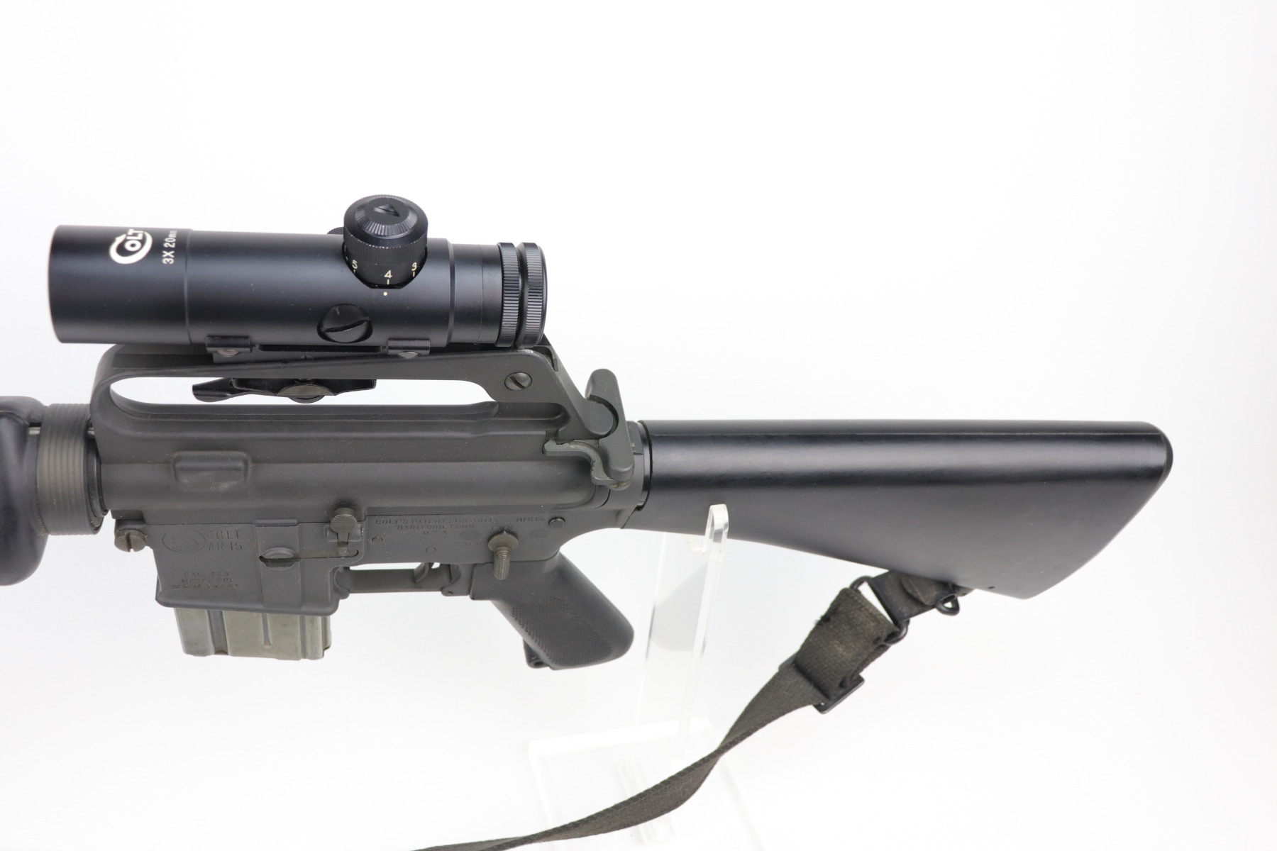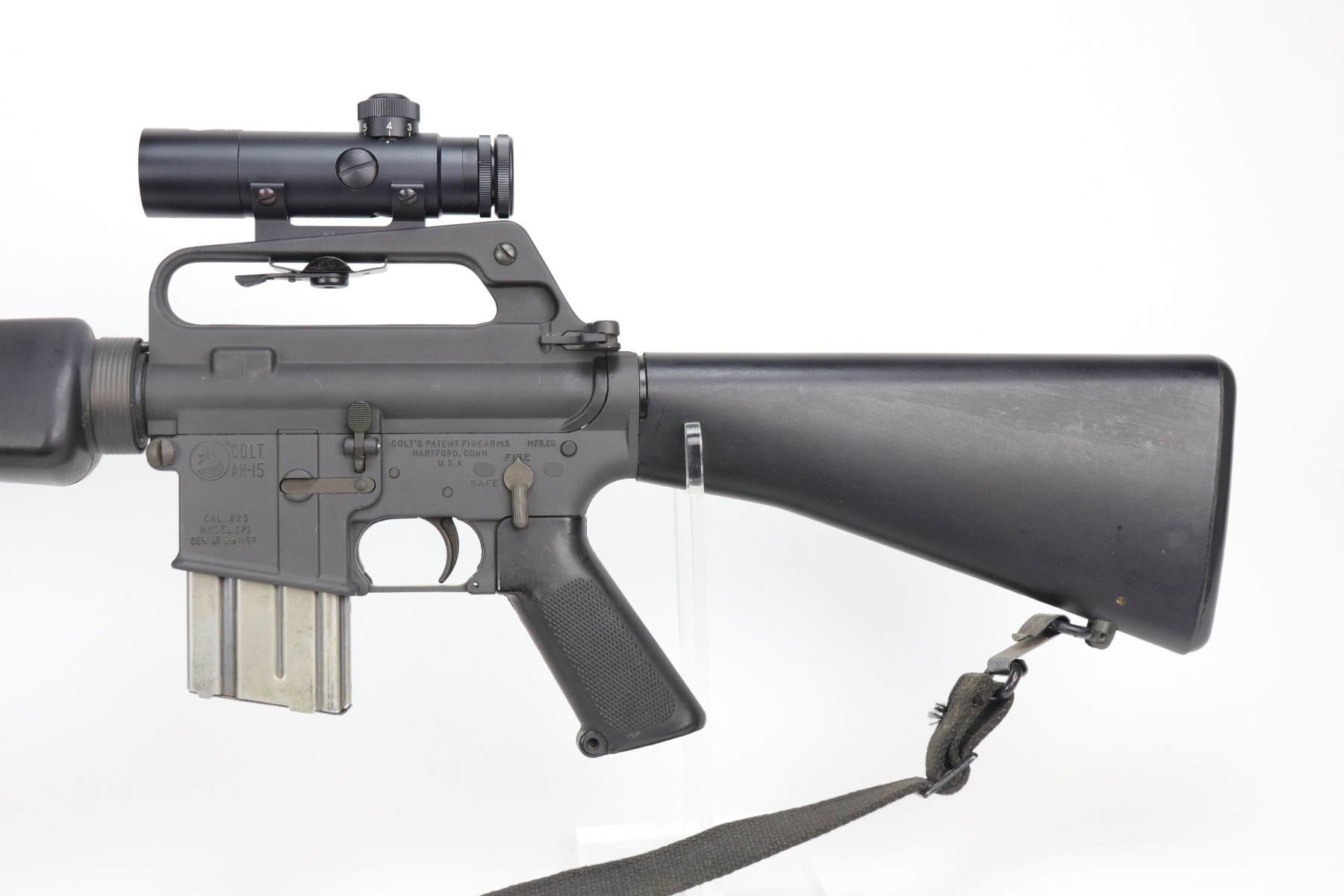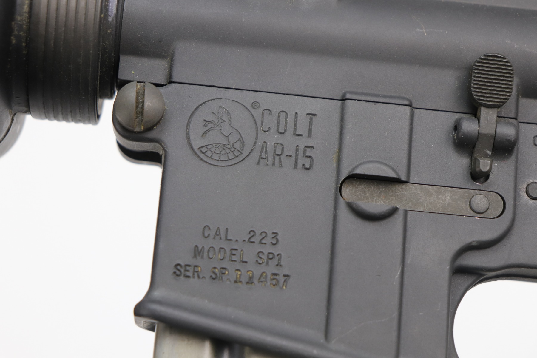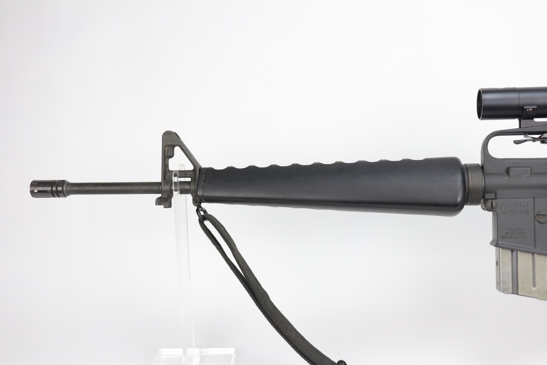 9/4/20 – This is a minty Colt SP1 AR-15 Rifle, manufactured in 1968. This gun is fully functional and has retained about 99% of its original finish. The only sign of wear is a few scuffs on the barrel. It comes with a Japanese-made Colt scope (clear optics), 15-round Colt magazine, and a black canvas sling. The bore is mint. C&R eligible.