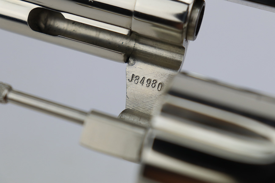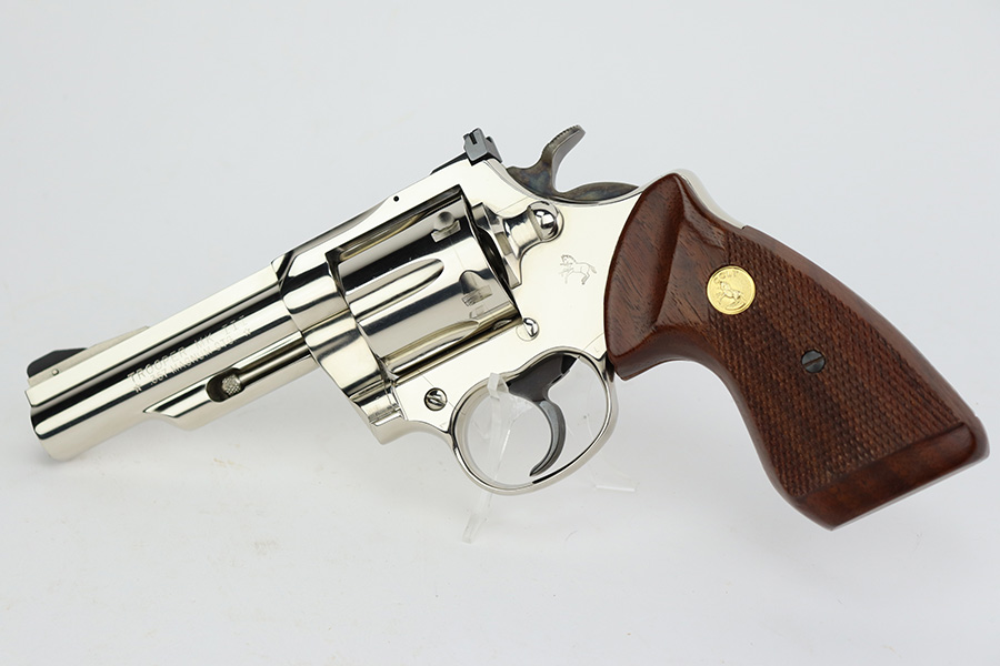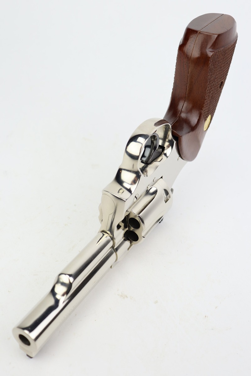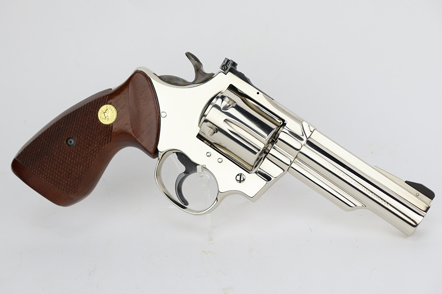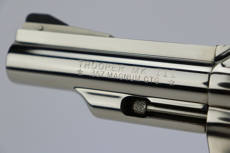 7/13/23 – This is a near-mint example of a Colt Trooper MK III revolver, manufactured in 1972and chambered in .357 Magnum. 6″ barrel. The gun has retained essentially all of its original nickeled finish. There is just a light roll mark on the cylinder, a few tiny handling marks along the barrel. Fitted with excellent wood grips. Mint bore. The cylinder is tight, and the action is smooth. C&R eligible.