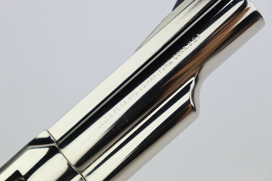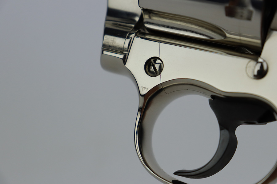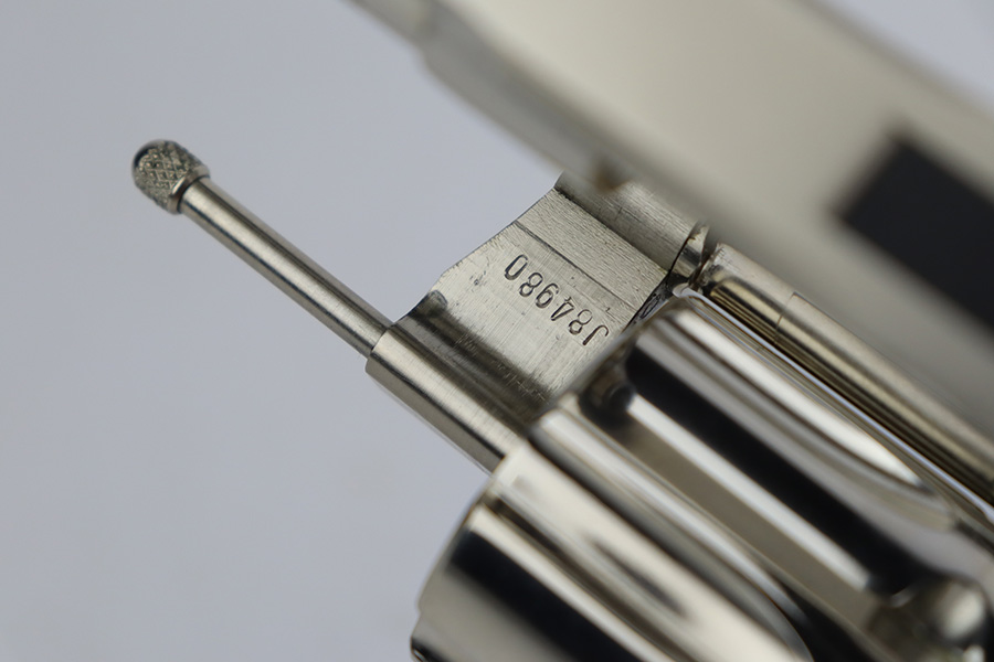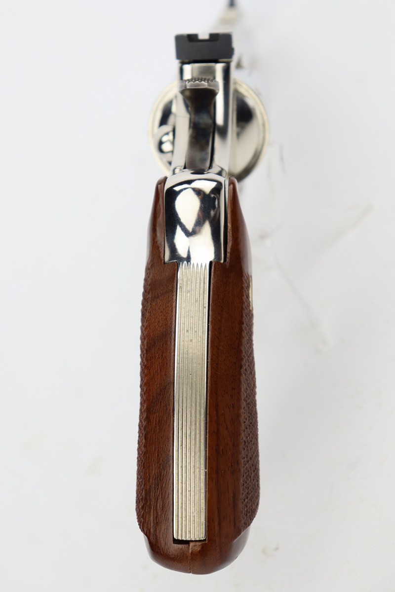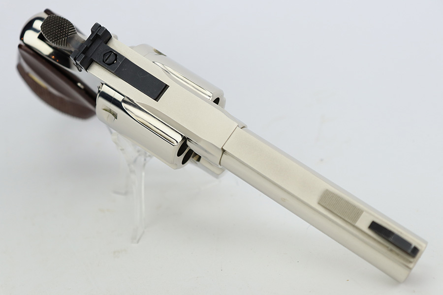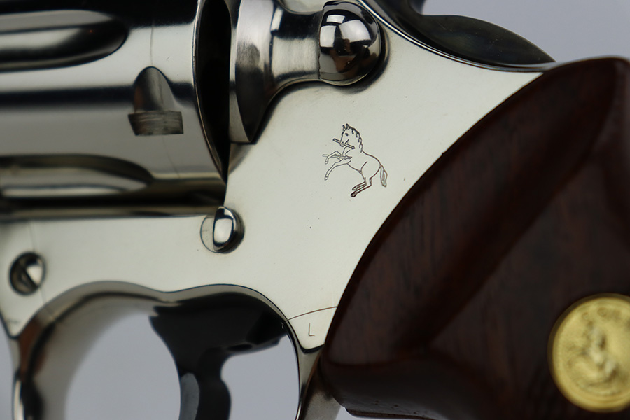 7/13/23 – This is a near-mint example of a Colt Trooper MK III revolver, manufactured in 1972and chambered in .357 Magnum. 6″ barrel. The gun has retained essentially all of its original nickeled finish. There is just a light roll mark on the cylinder, a few tiny handling marks along the barrel. Fitted with excellent wood grips. Mint bore. The cylinder is tight, and the action is smooth. C&R eligible.