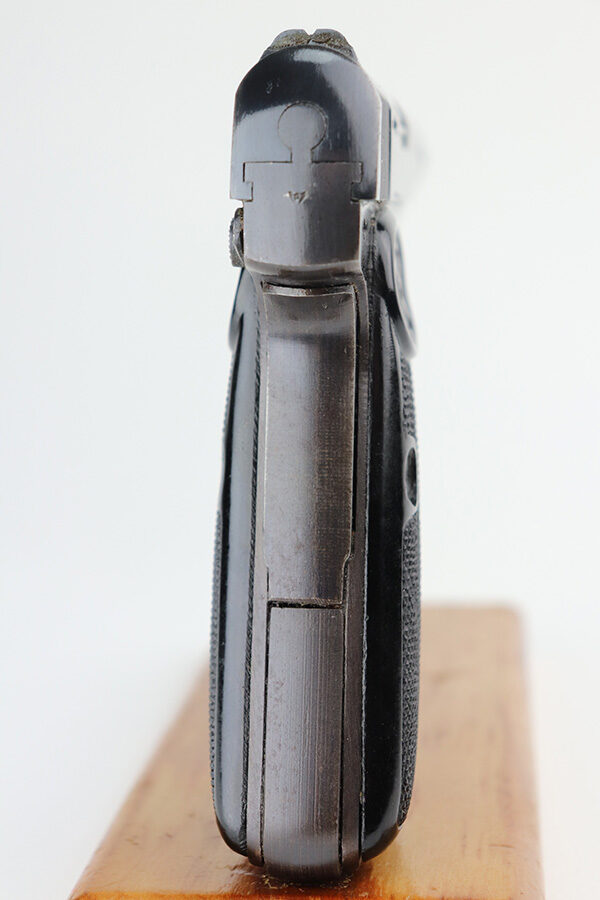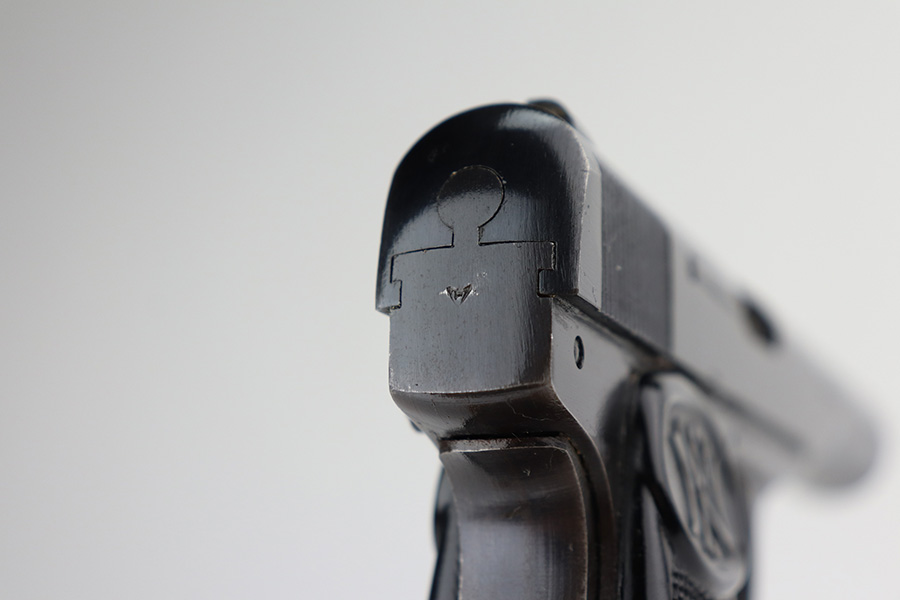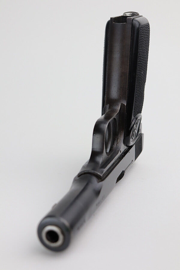 8/16/21 – This is a minty example of an FN Browning Model 1922 sold in the commercial market in the 1940’s. It is all matching and has the proper “Eagle N” proofs. This one is unique because it has a “shooting man” Akah retailer proof on the right side of the frame. It has retained about 97% of its original finish. There are just hints of wear on the high edges of the slide and around the muzzle. Just a hint of thinning and brown patina on the straps. Comes with excellent black bakelite grips and a period-correct magazine. Mint bore.