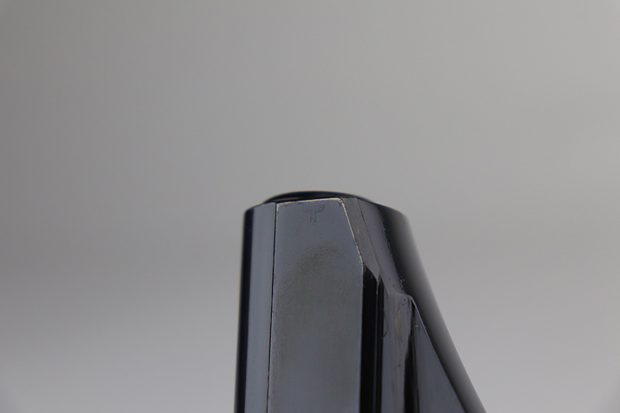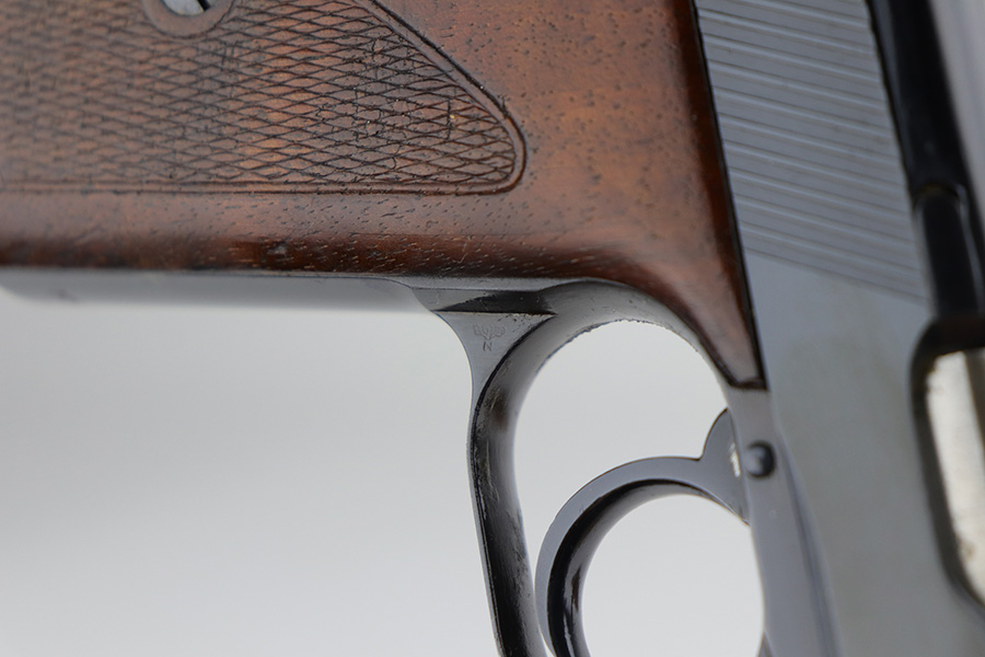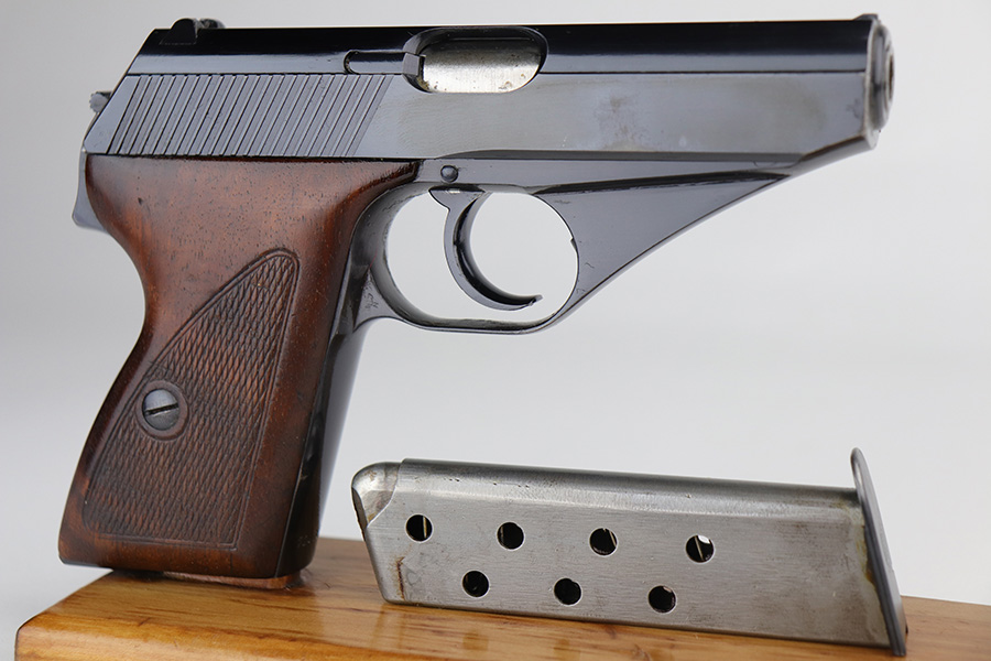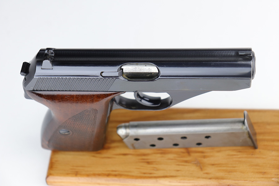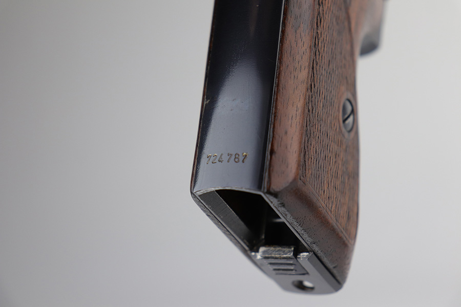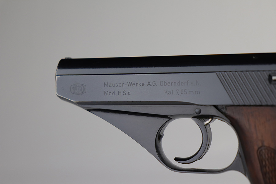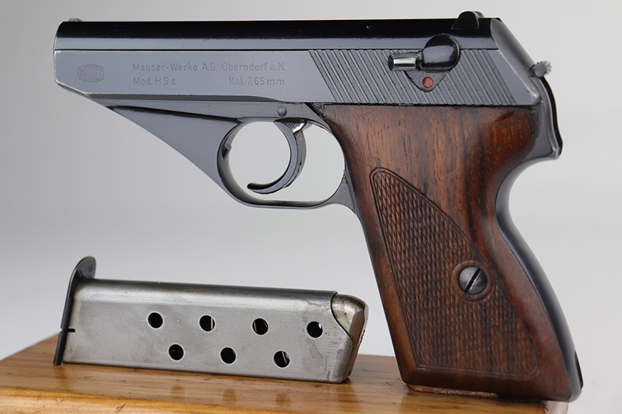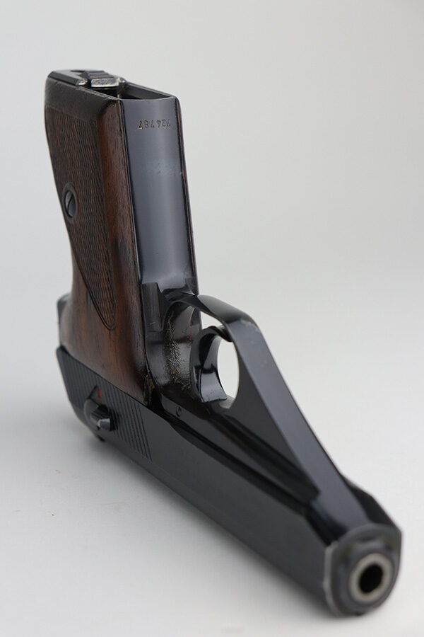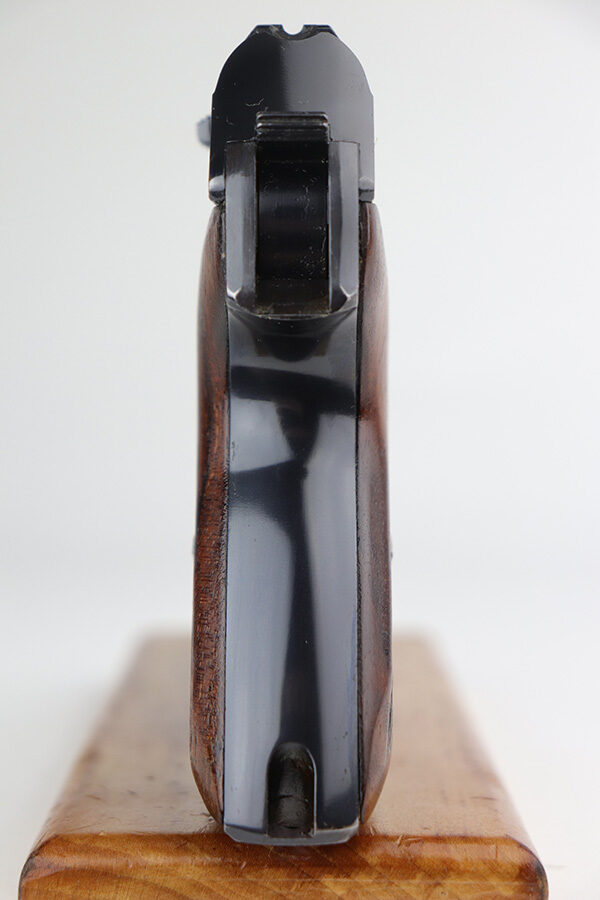 9/10/21 – This is a minty example of a Mauser HSC sold in the commercial market in 1941. It is all matching and has the proper “Eagle N” commercial proofs. It has retained about 97-98% of its original high polish finish. There is very minor wear around the muzzle, one spot of minor wear on the right side of the slide, and a few very small spots of wear on the front strap. Comes with excellent wood grips and a proper magazine – small chip in the left grip. Mint bore.