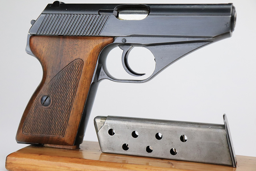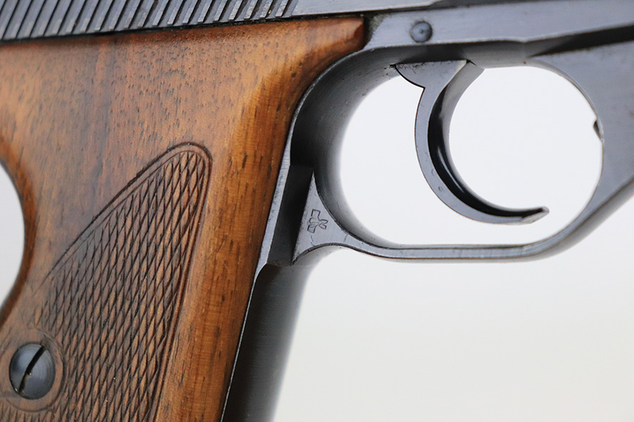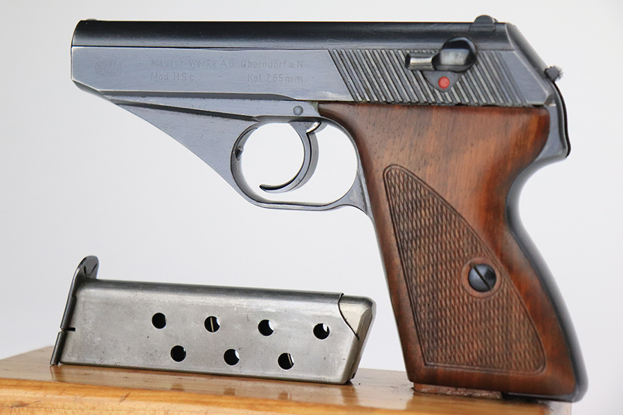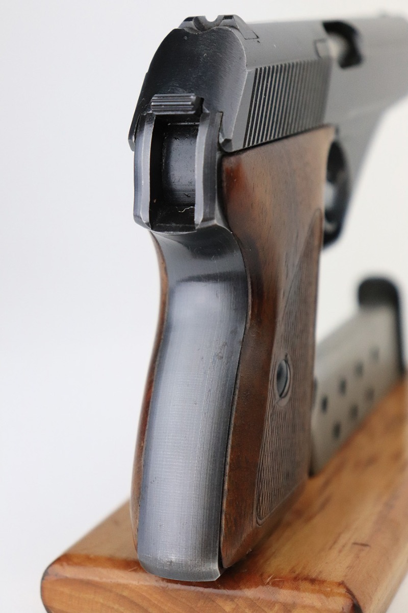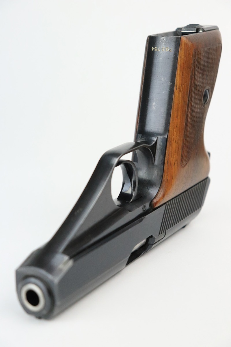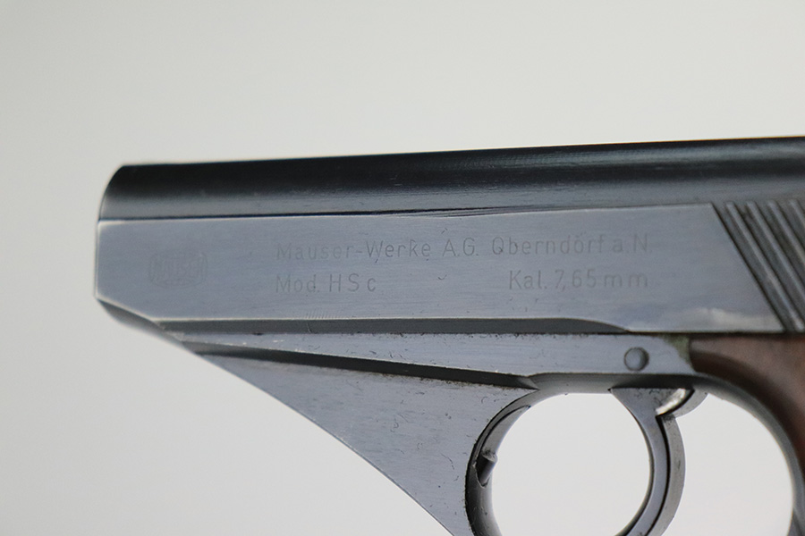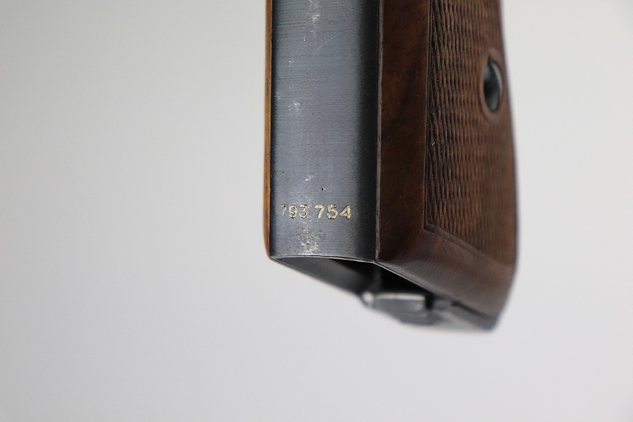 6/9/22 – This is a near-mint example of a Mauser HSC sold in the commercial market in 1942. It is all matching and has the proper “Eagle N” commercial proofs. It has retained about 98% of its original finish. There is just a hint of wear around the muzzle and some minor discoloration along the bottom edges of the slide serrations on both sides of the slide. Comes with minty wood grips and one proper magazine. Mint bore.