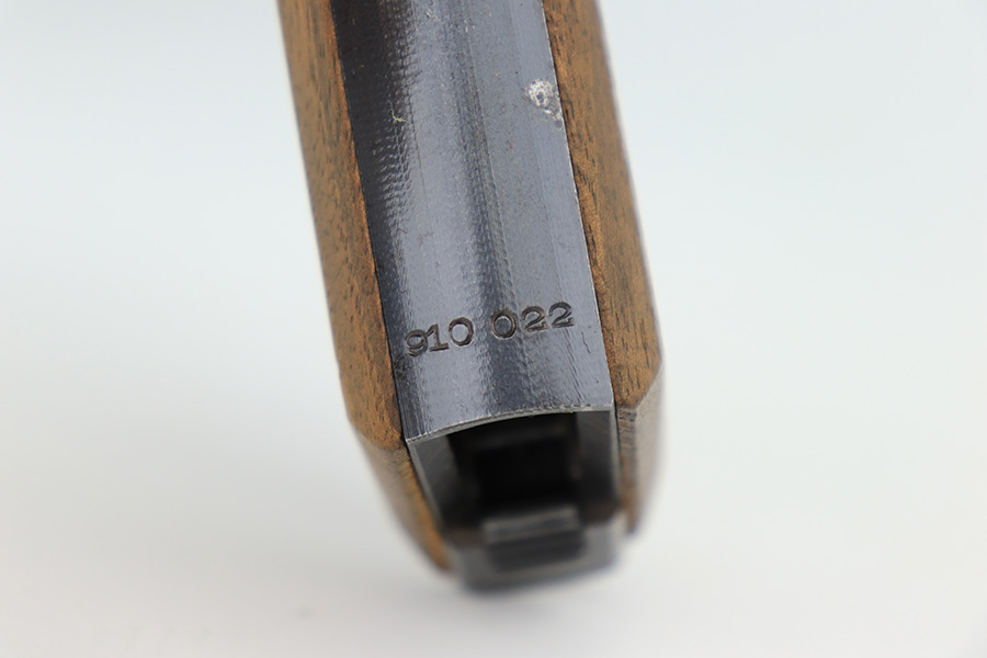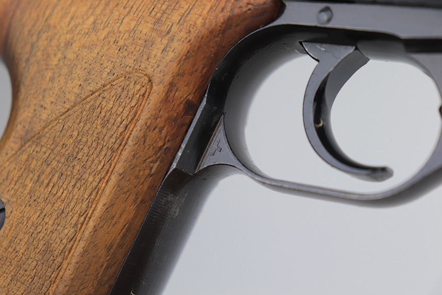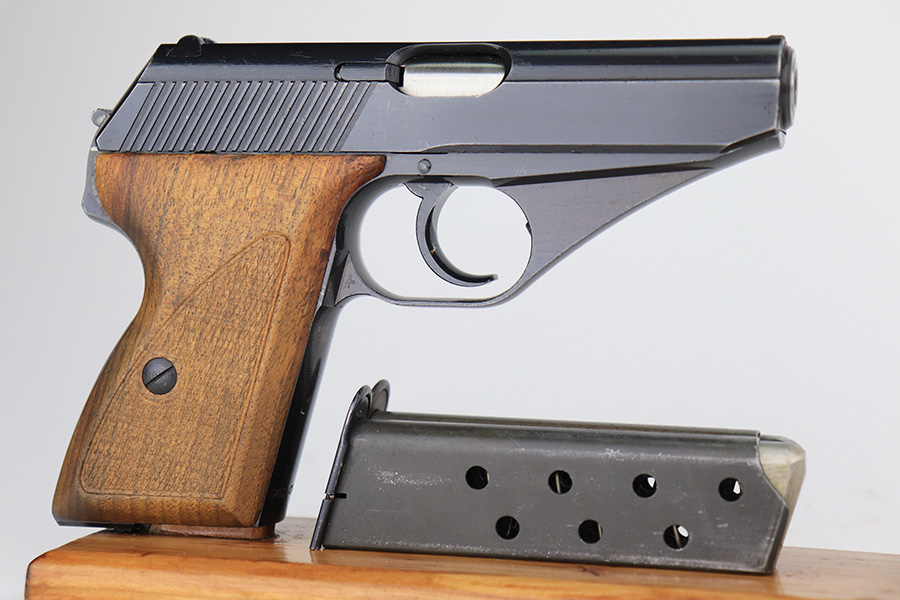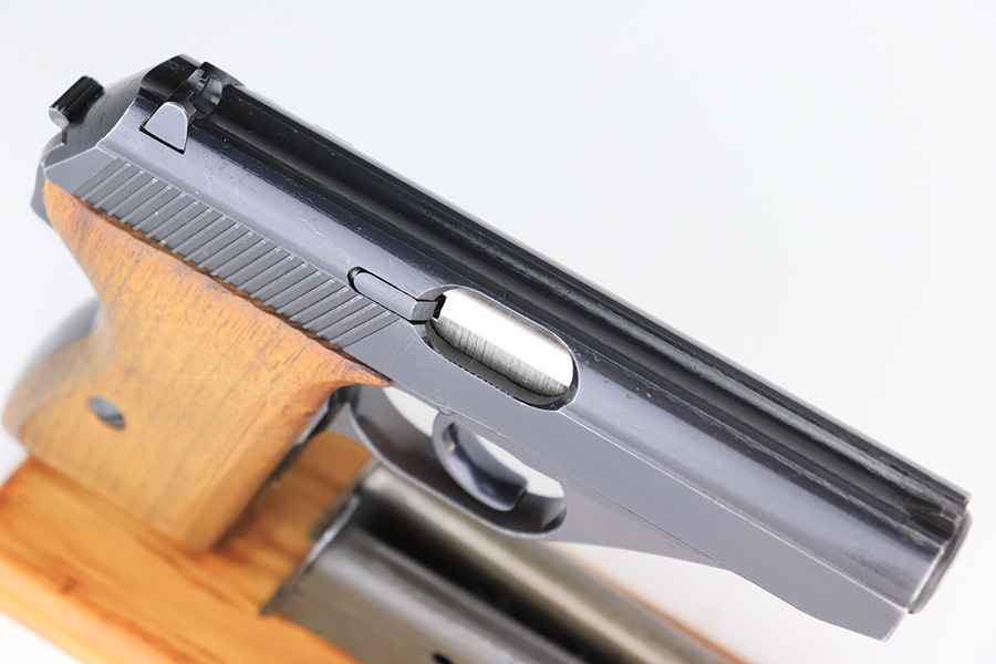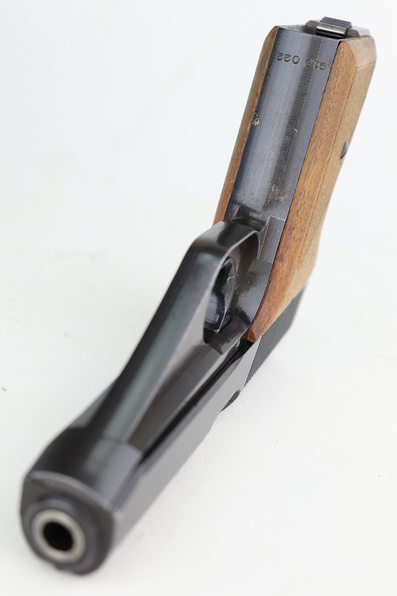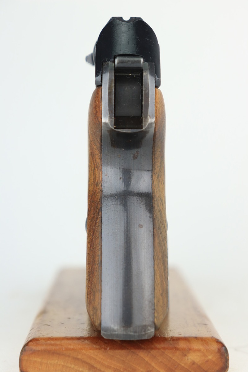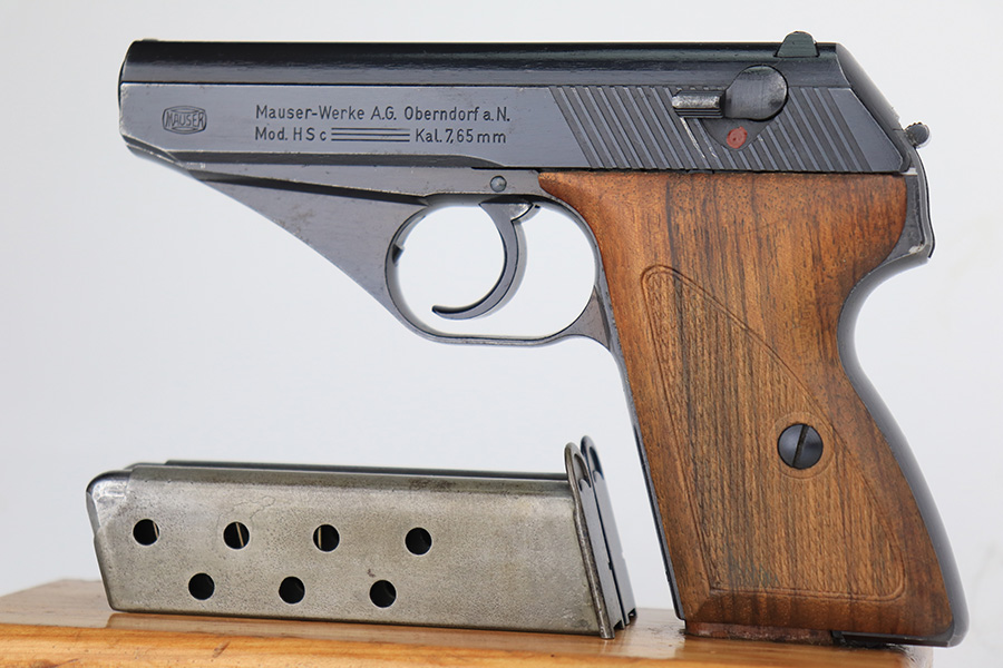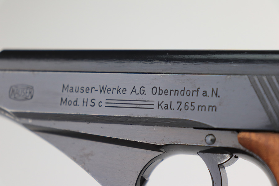 4/20/23 – This is near-mint example of a Mauser HSc sold on the commercial market in 1944. It is all matching, with the proper “Eagle N” commercial proofs. It has retained virtually all of its original finish, with just a few small dots of discoloration here and there, and an area of very light scratching on the right side of the slide. Fitted with excellent wood grips. Comes with two period correct half-moon magazines. Stone mint bore.