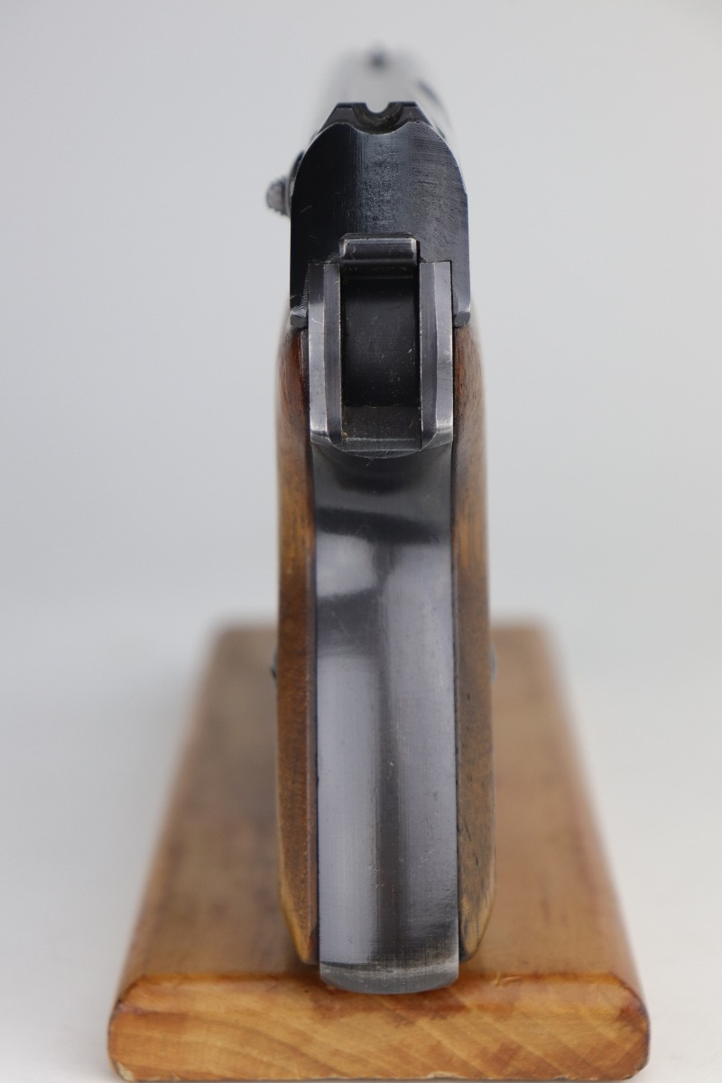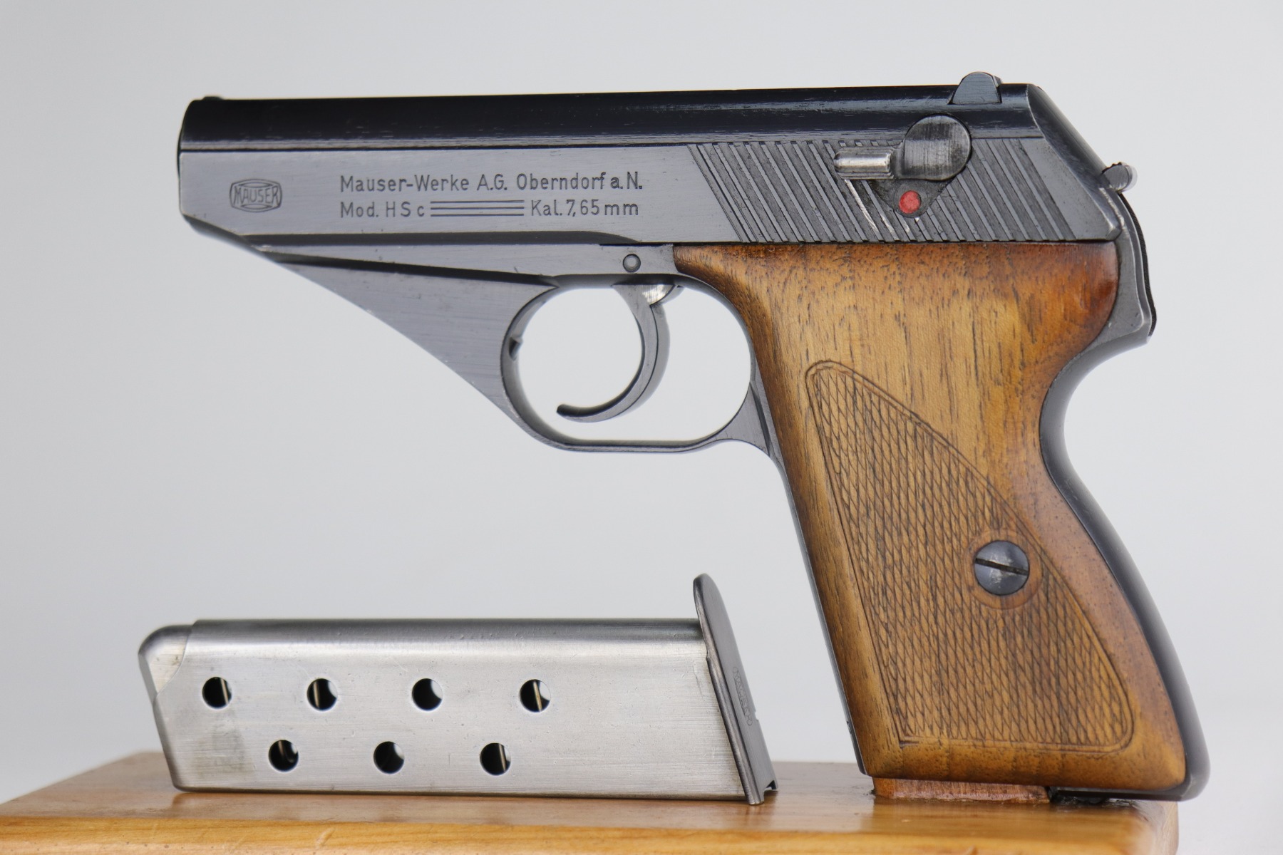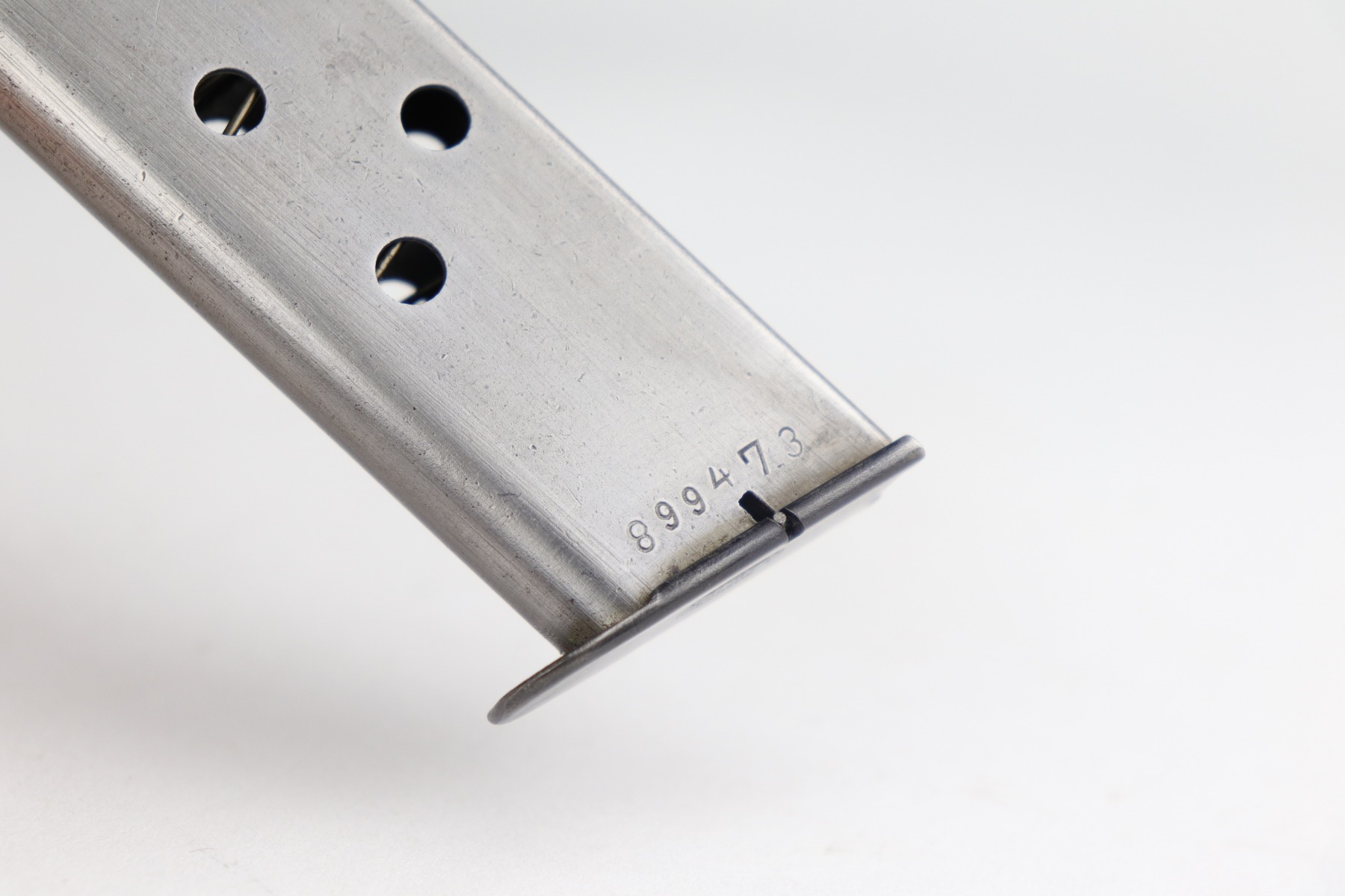 12/31/20 – This is a minty example of a Mauser HSC sold in the commercial market in 1944. It is all correct and has the proper “Eagle N” proofs. It has retained about 98% of its original finish. There is a hint of wear around the muzzle, a light streak of wear on the front strap, and minor wear on some of the high edges. Comes with excellent grips and one original matching magazine. We’re not sure why the magazine is numbered. Likely done after the war. The bore is mint.