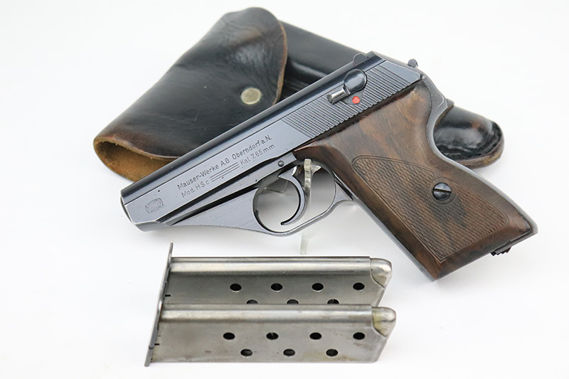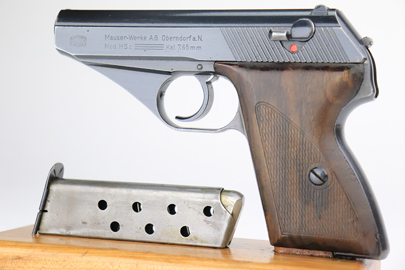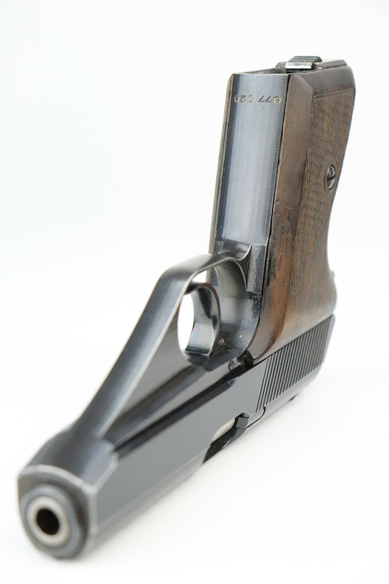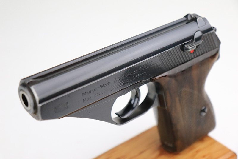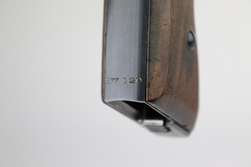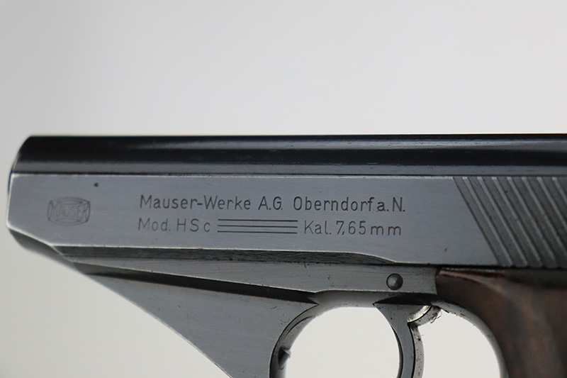 8/25/22 – This is a near-mint example of a Mauser HSC sold in the commercial market in 1943. It is all matching and has the proper “Eagle N” proofs. It comes as a rig with a generic holster and two period-correct magazines. The holster has 1941 and waffen stamps, but these markings are not original. The gun itself has retained about 97-98% of its original bluing. There is just a hint of wear around the muzzle and hints of thinning on both grip straps. Comes with very nice period-correct wood grips – one tiny chip in the top corner of the right grip. Mint bore.