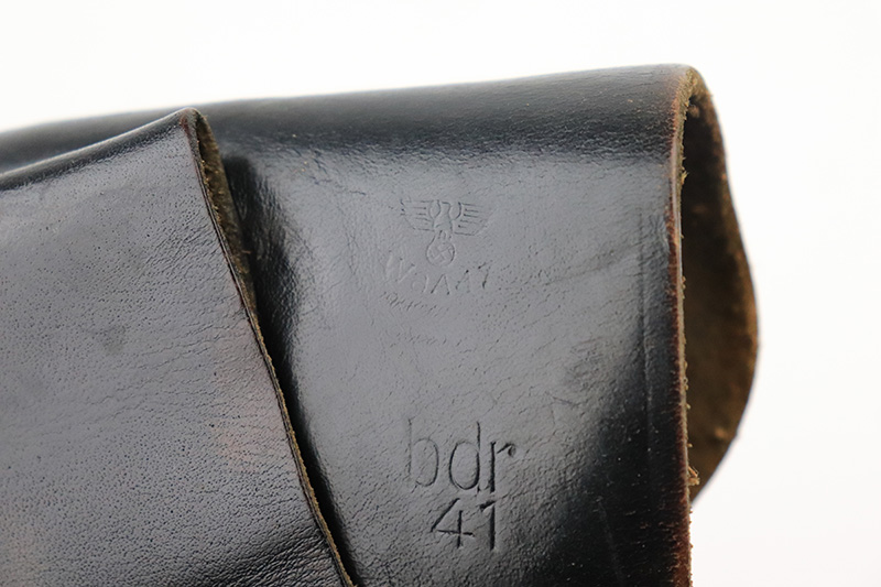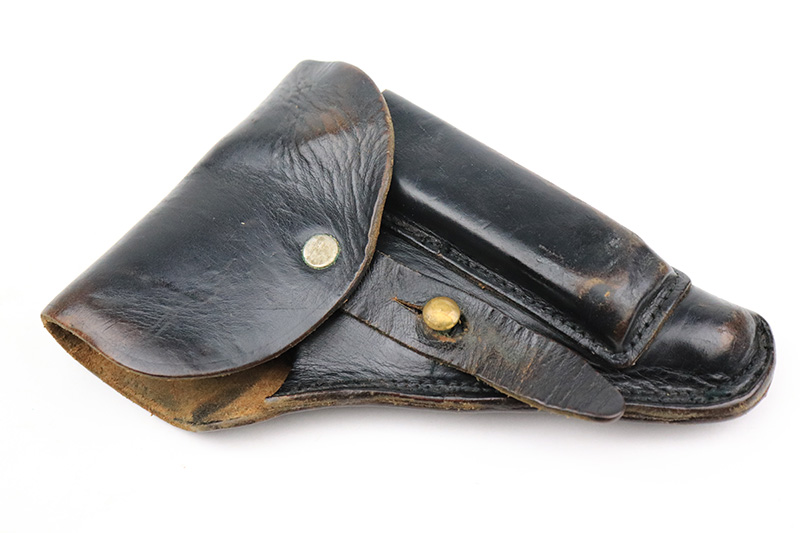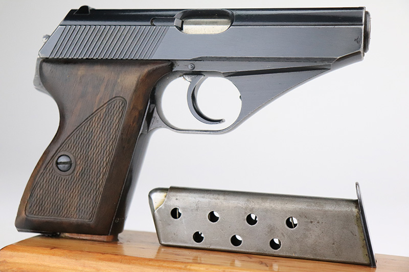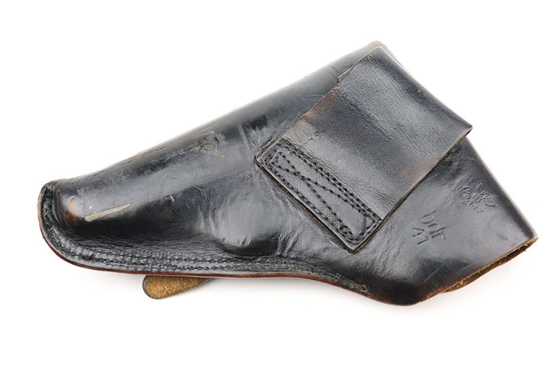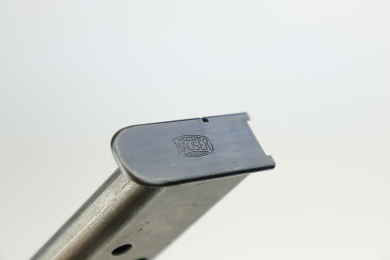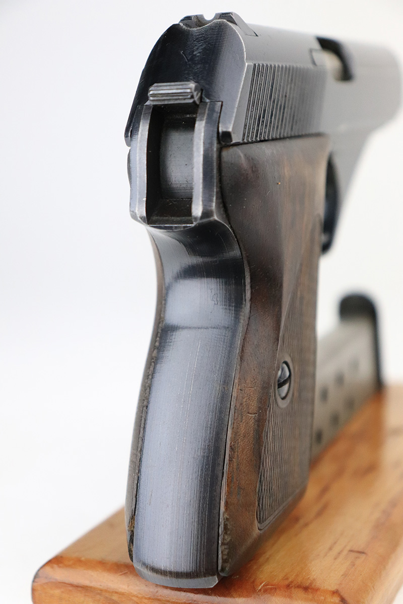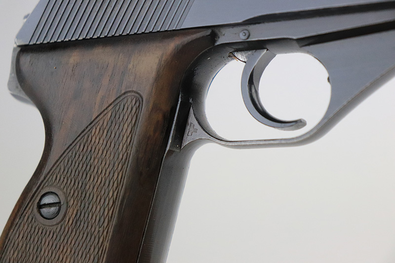 8/25/22 – This is a near-mint example of a Mauser HSC sold in the commercial market in 1943. It is all matching and has the proper “Eagle N” proofs. It comes as a rig with a generic holster and two period-correct magazines. The holster has 1941 and waffen stamps, but these markings are not original. The gun itself has retained about 97-98% of its original bluing. There is just a hint of wear around the muzzle and hints of thinning on both grip straps. Comes with very nice period-correct wood grips – one tiny chip in the top corner of the right grip. Mint bore.