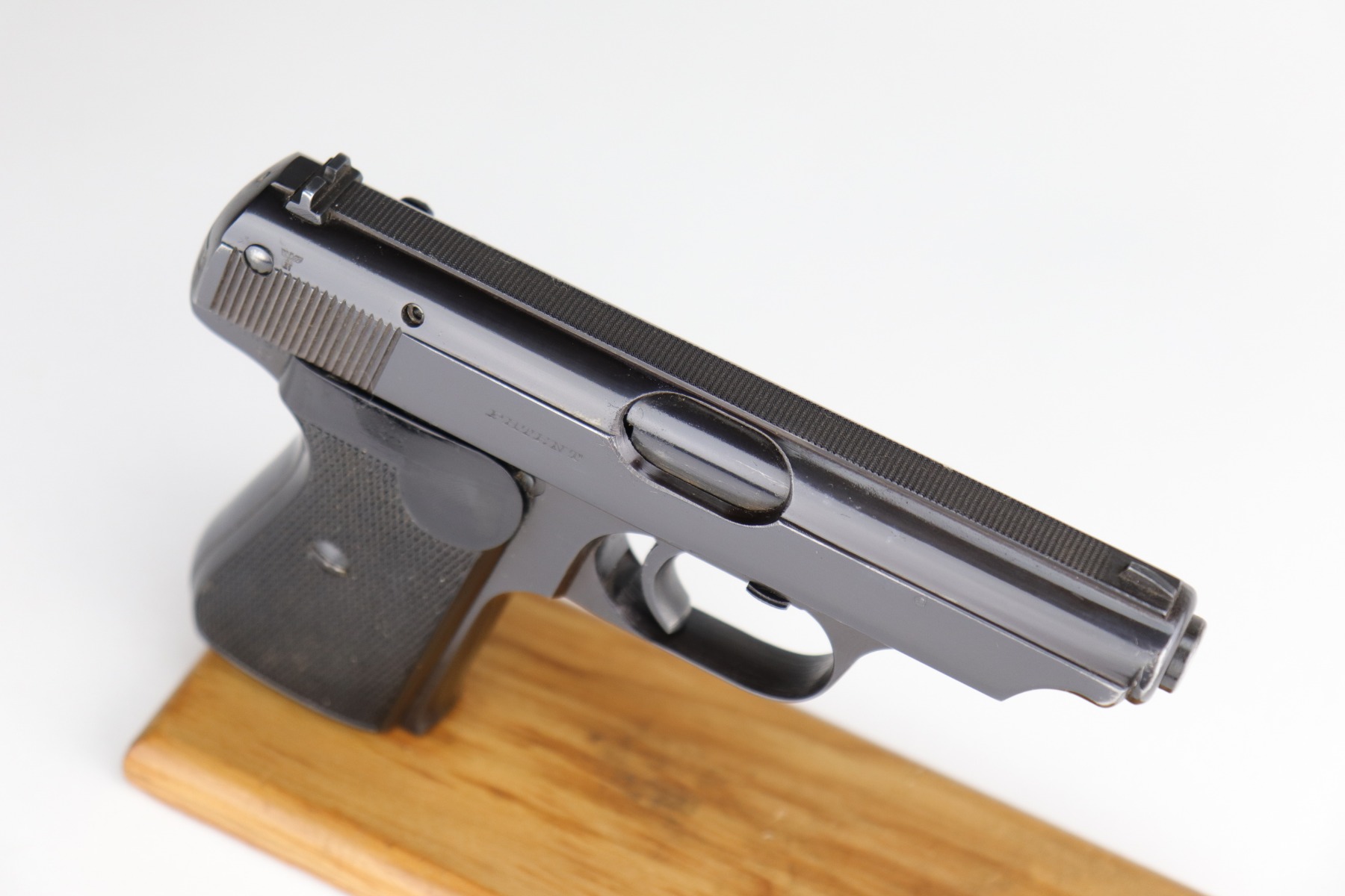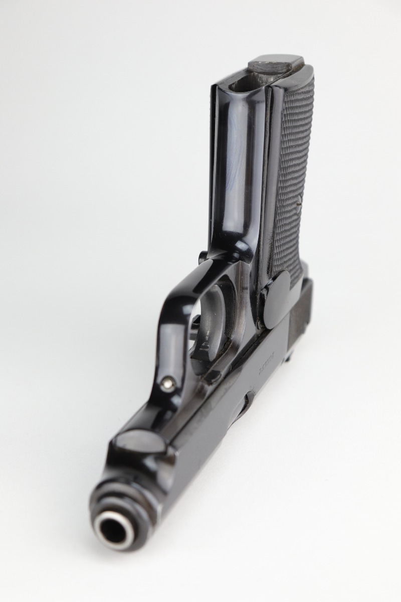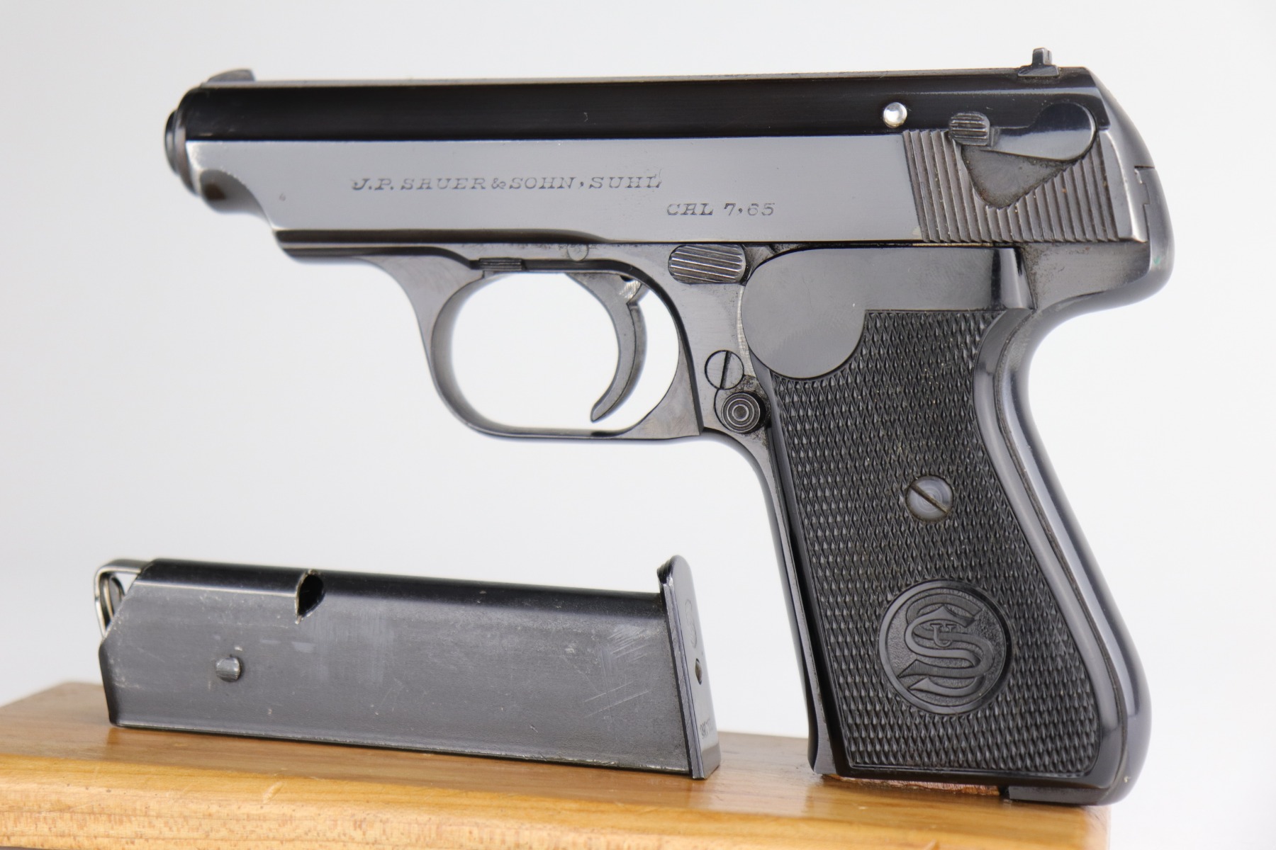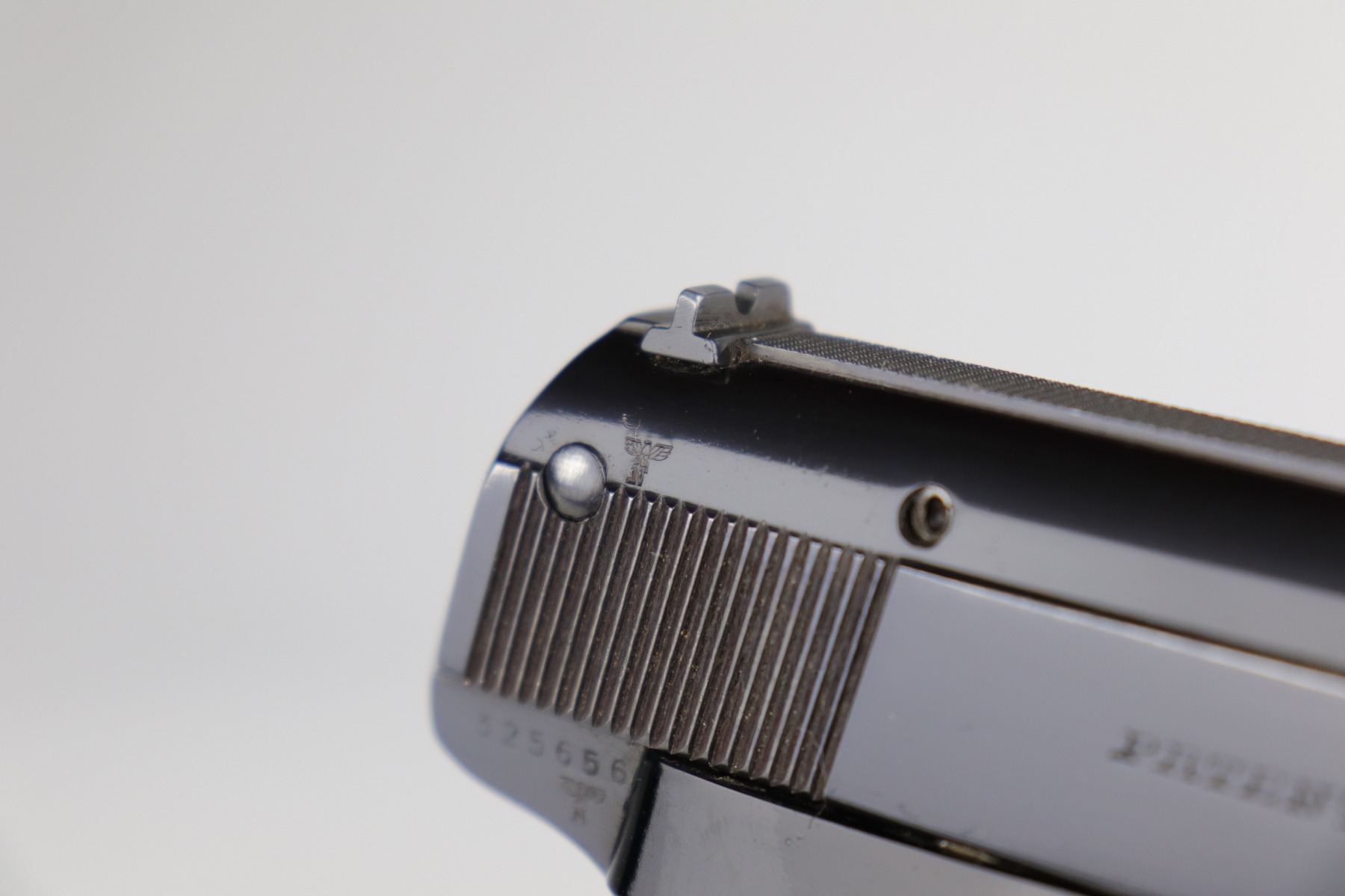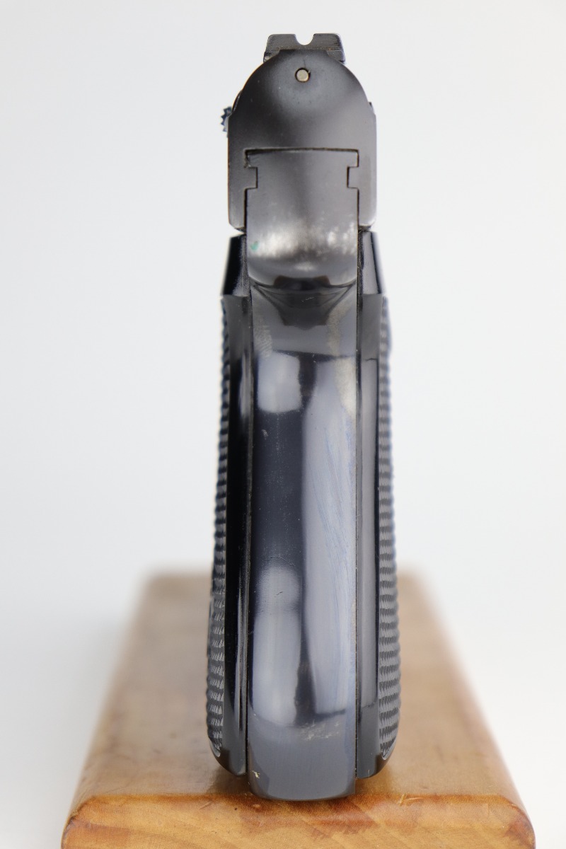 10/8/20 – This is a minty example of a Sauer 38h pistol, made for the commercial market during WW2. This particular gun has retained about ~98% of its original high-polish bluing. There is very minor muzzle wear and wear on the tang. There is one small area of discoloration on the right side of the slide. It comes with excellent period-correct grips and one magazine. The bore is mint.