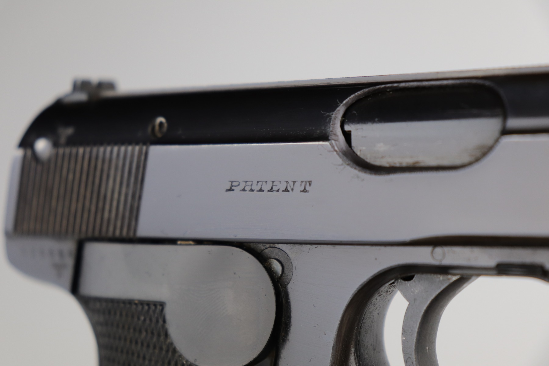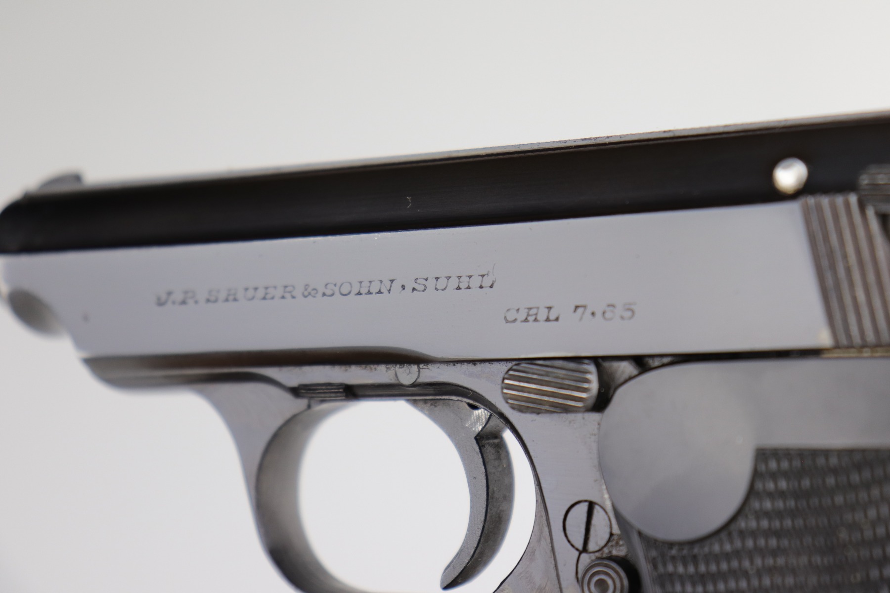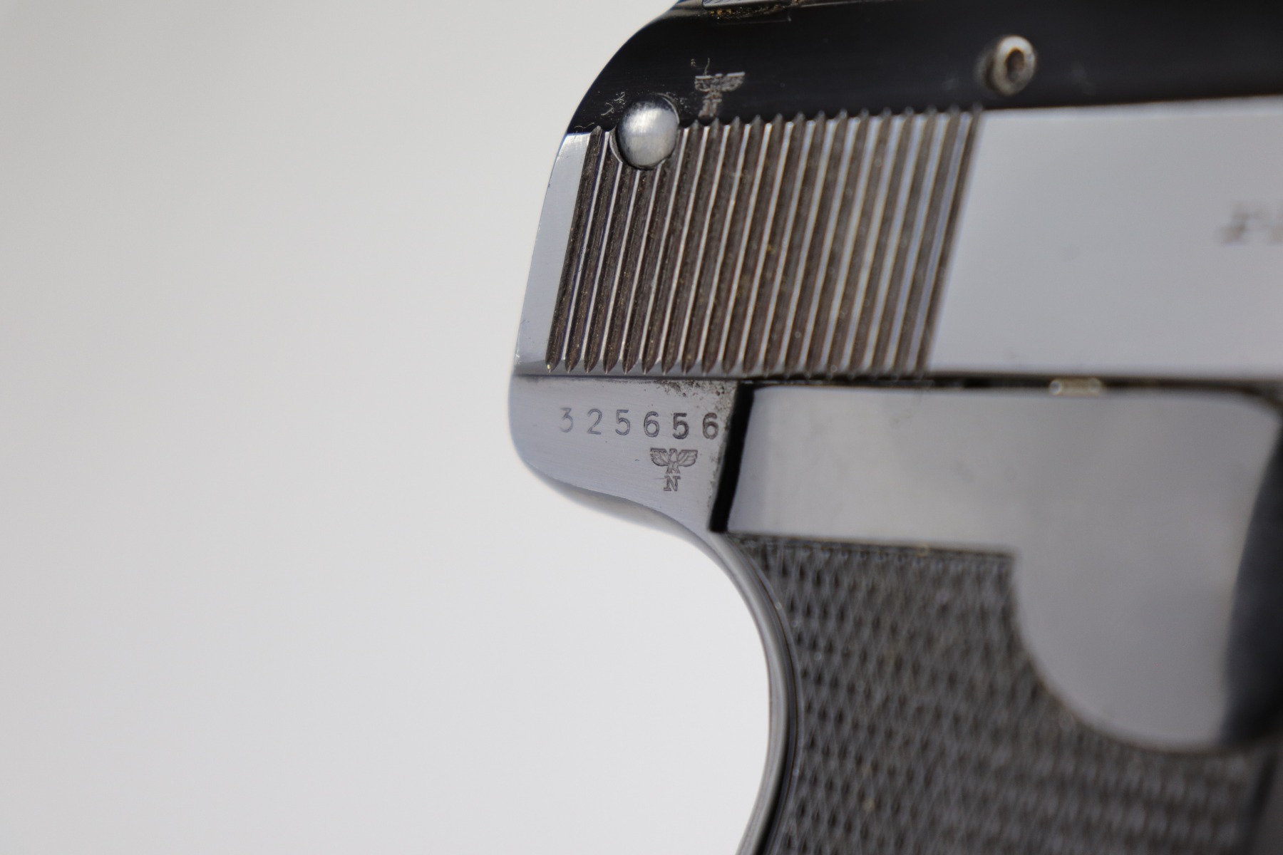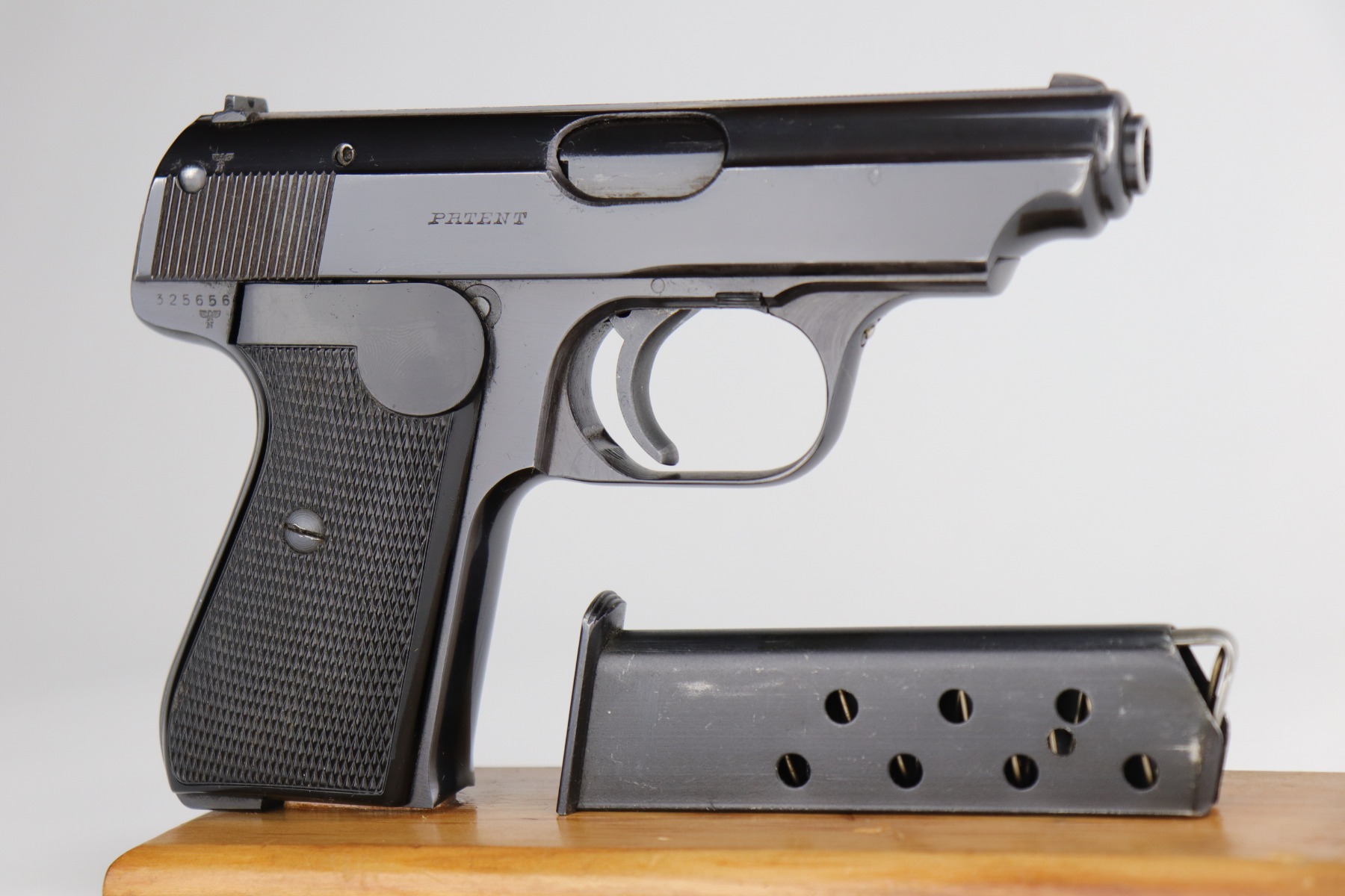 10/8/20 – This is a minty example of a Sauer 38h pistol, made for the commercial market during WW2. This particular gun has retained about ~98% of its original high-polish bluing. There is very minor muzzle wear and wear on the tang. There is one small area of discoloration on the right side of the slide. It comes with excellent period-correct grips and one magazine. The bore is mint.
