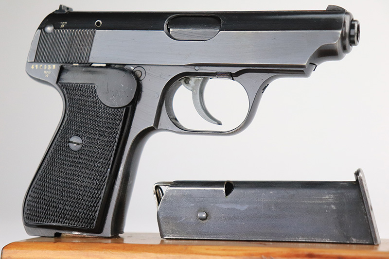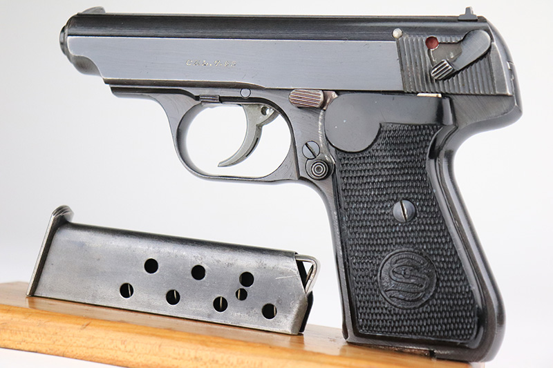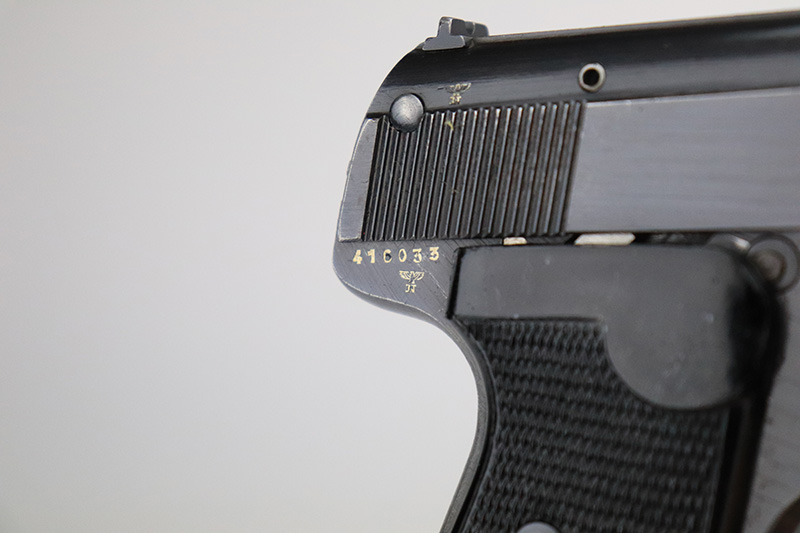 9/16/22 – This is a minty example of a Sauer 38h sold in the commercial market during WW2. It is all matching, lacks military proofs, and has the proper “Eagle N” proofs. It has retained about 97% of its original finish. There is very minor muzzle wear, some very minor thinning on the grip straps, and one small area of wear and minor discoloration on the right side of the slide. Comes with very nice period-correct black bakelite grips and one proper magazine that is period original. The bore is like-new.