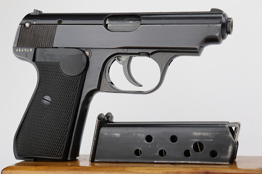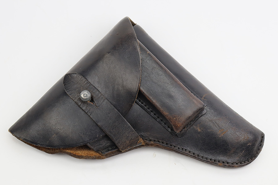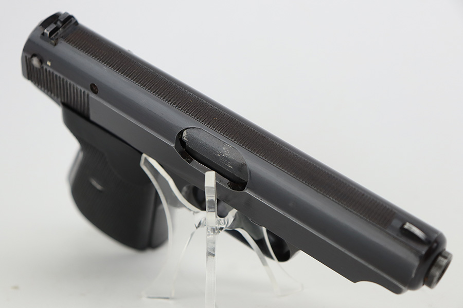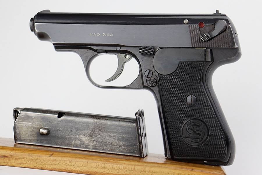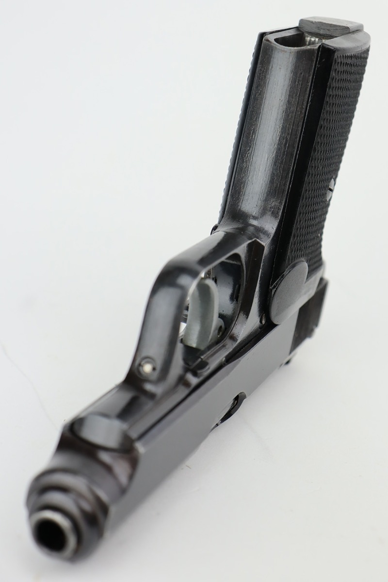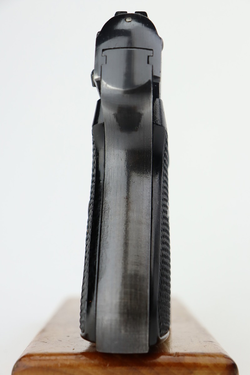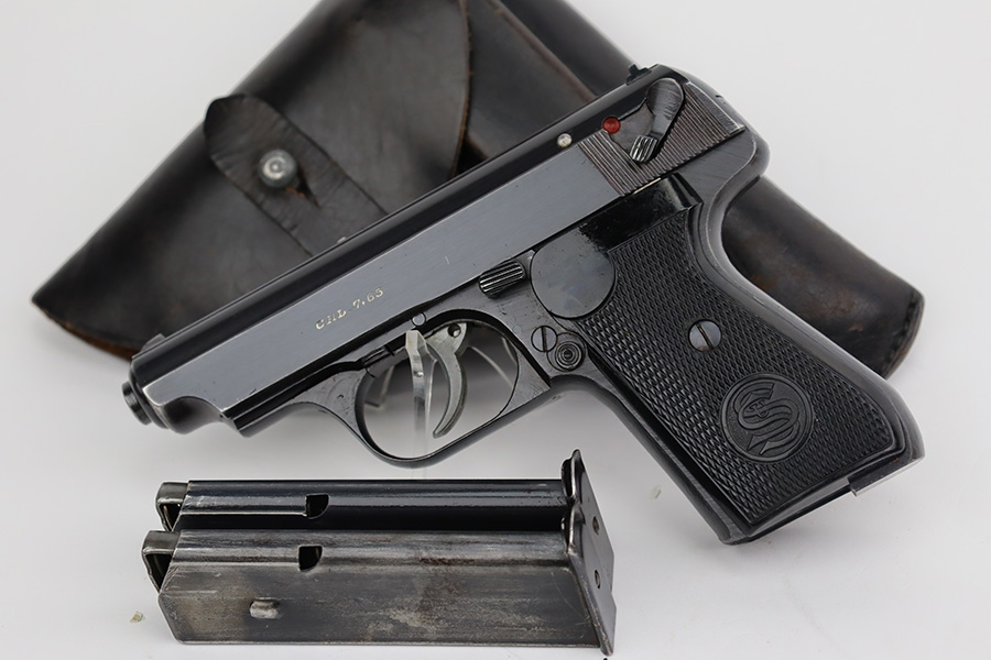 8/14/23 – This is a near-mint example of a Sauer 38h sold in the commercial market during WW2. It is all matching and has the proper “Eagle N” commercial proofs. No military acceptance proofs. It comes as a rig with an excellent generic black leather holster and two period-correct half-moon magazines. The gun itself has retained nearly all of its original wartime finish with just a hint of wear around the muzzle and hints of thinning on the grip straps. Fitted with excellent period-correct black bakelite grips. Stone-mint bore.