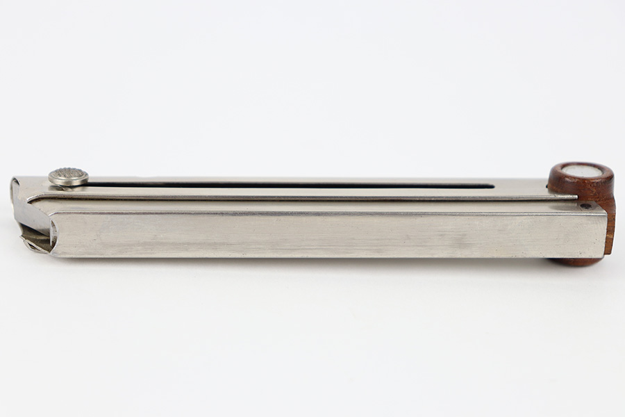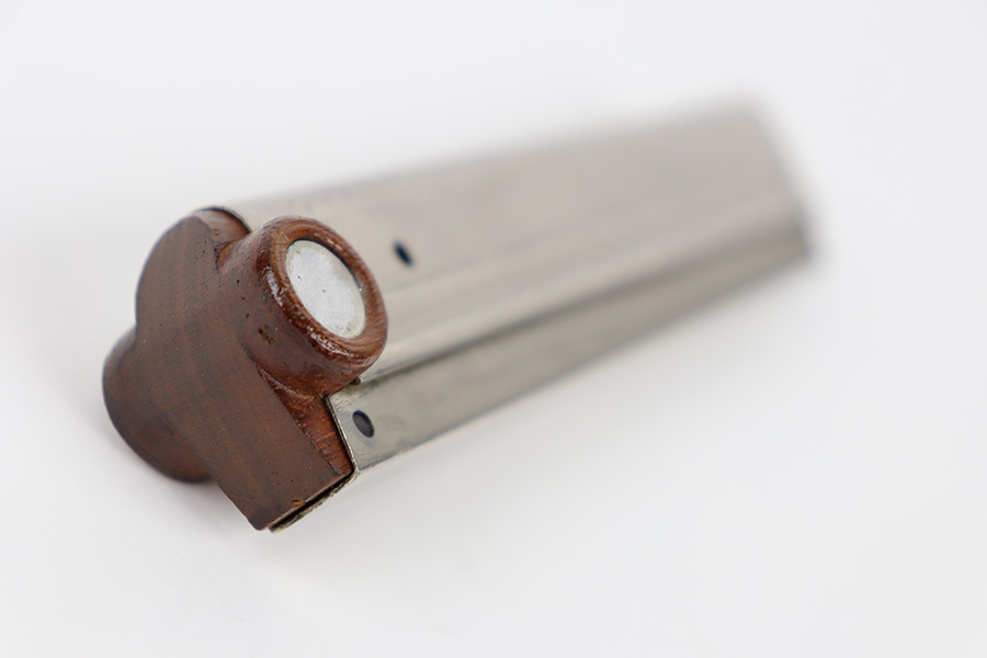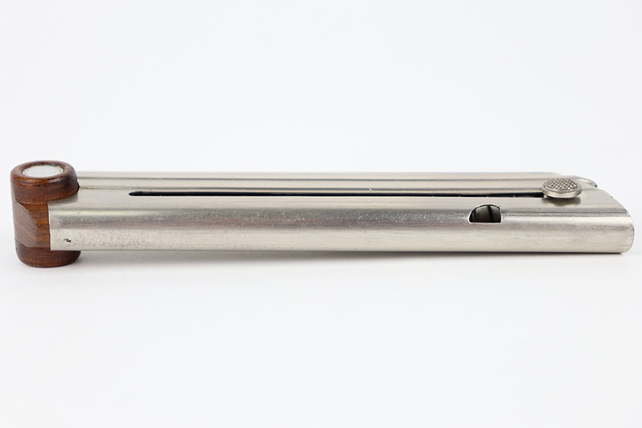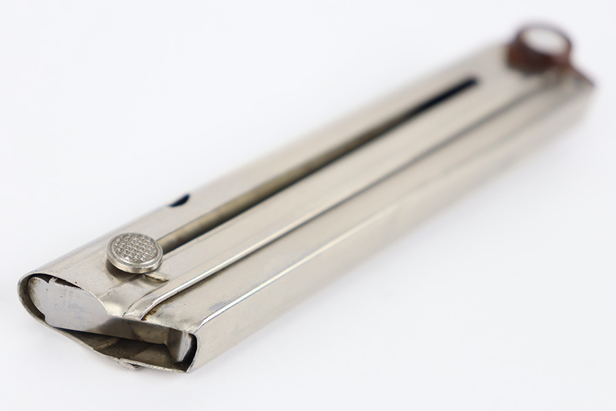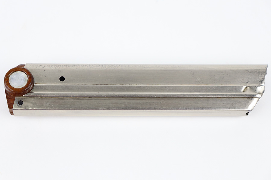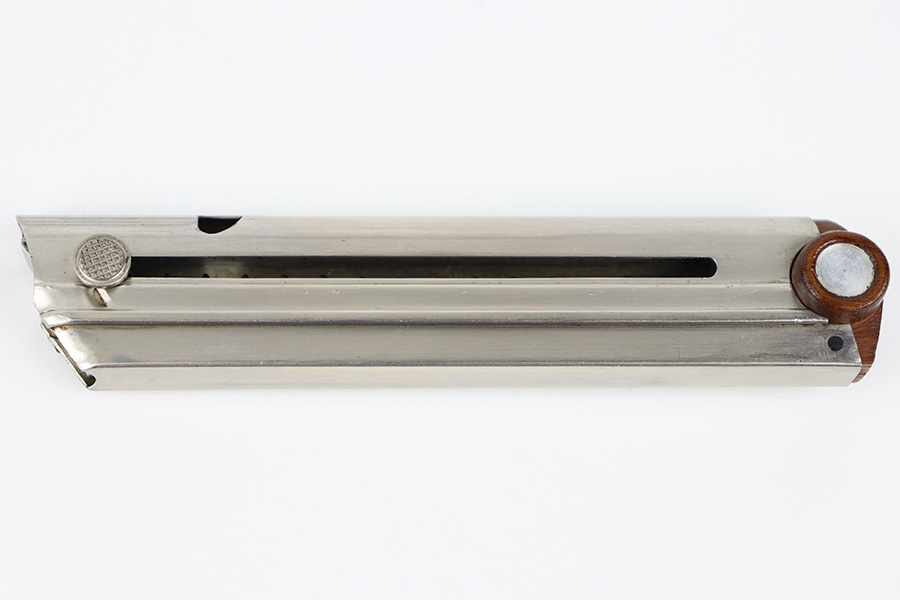 10/17/23 – This is a minty condition Swiss Luger magazine. The magazine has a nickel tube and wood base. The wood base has original metal inlays on each side. The base is unmarked and shows no signs of alteration or tampering. Clean and excellent throughout, with some micro-scratches on the tube but no rust or pitting. Fully functional spring.