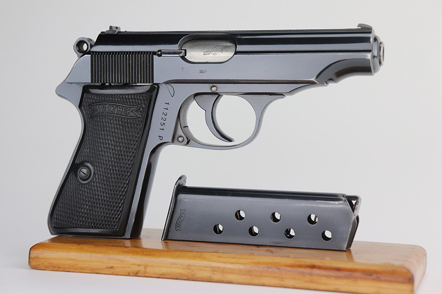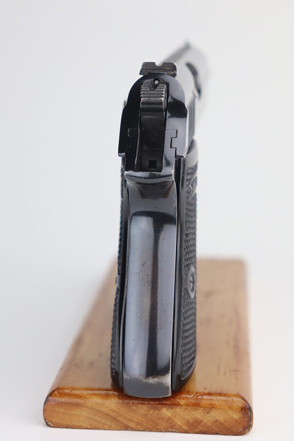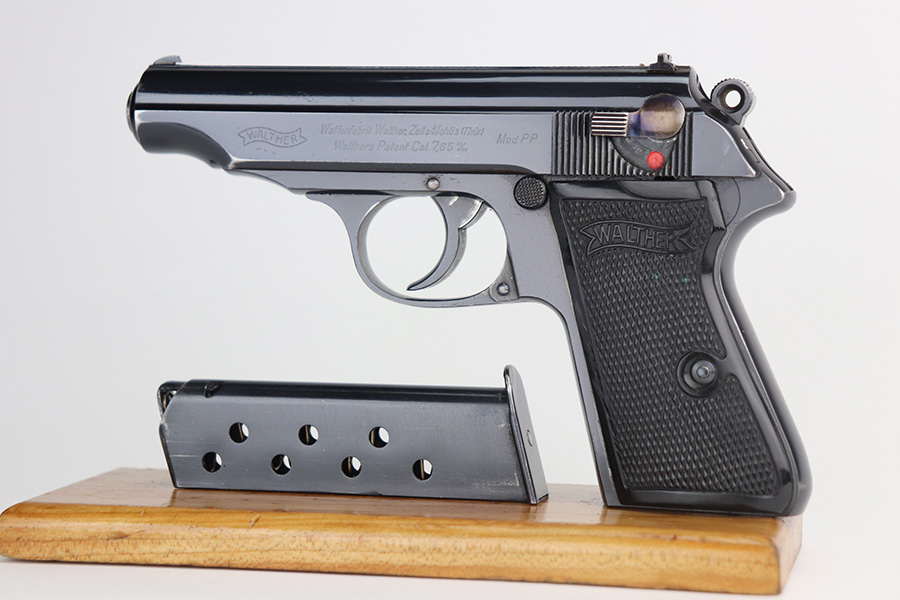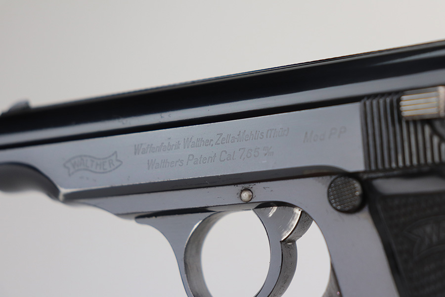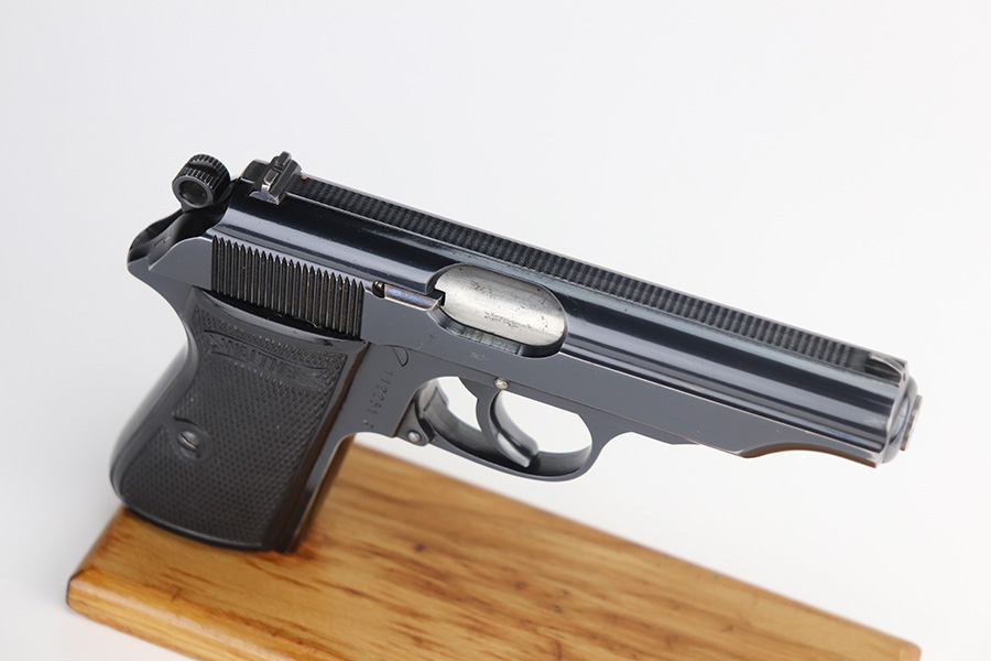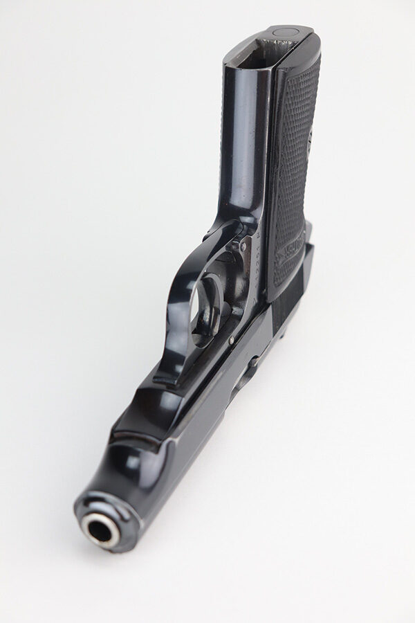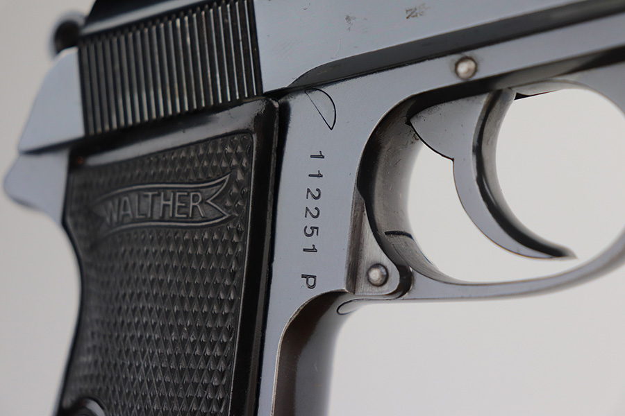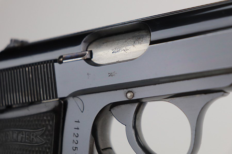 8/9/21 – This is a minty example of a Walther PP sold in the commercial market in 1939. It is all matching and has the proper “Crown N” commercial proofs. It has retained about 97% of its original high polish finish. There are hints of wear around the muzzle and a couple of spots of wear on the back strap. Very minor pin-pricking on the straps and a few very small dots of oxidation on the back strap. Comes with period-correct grips and a proper Walther banner-only magazine. Mint bore.