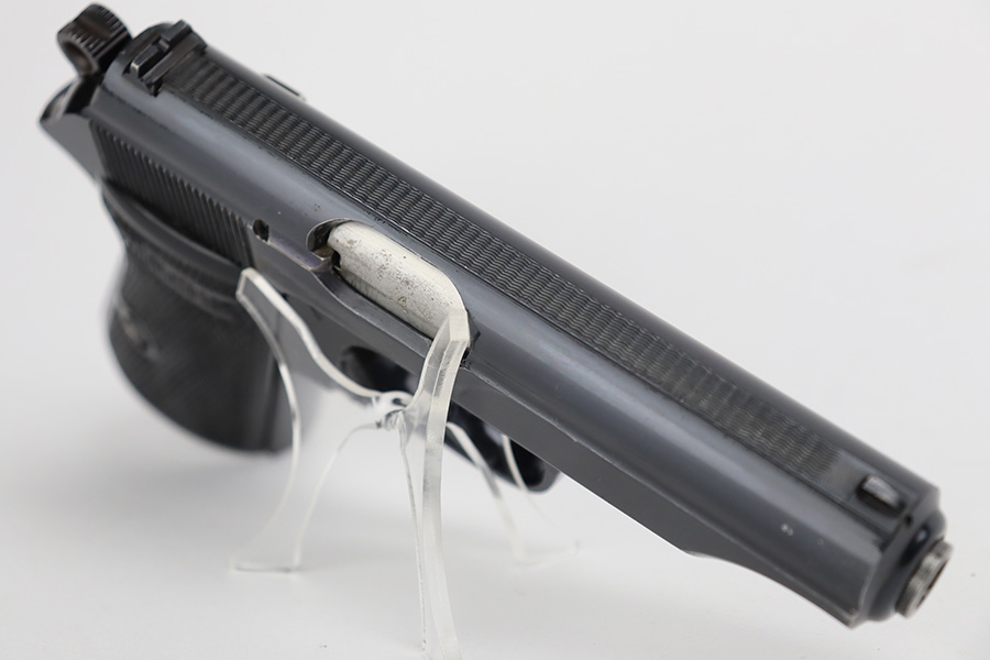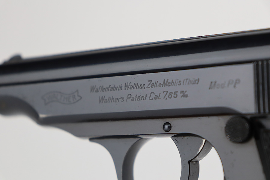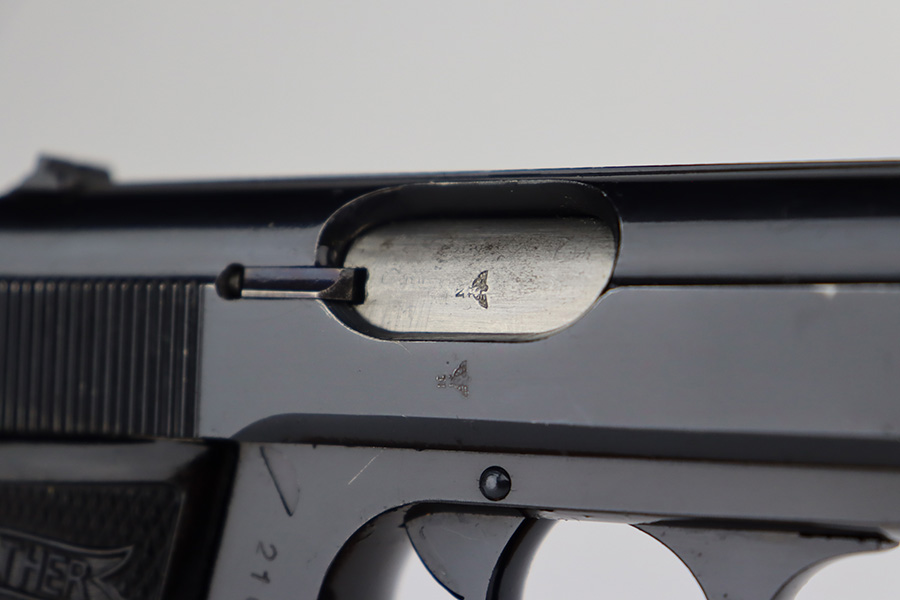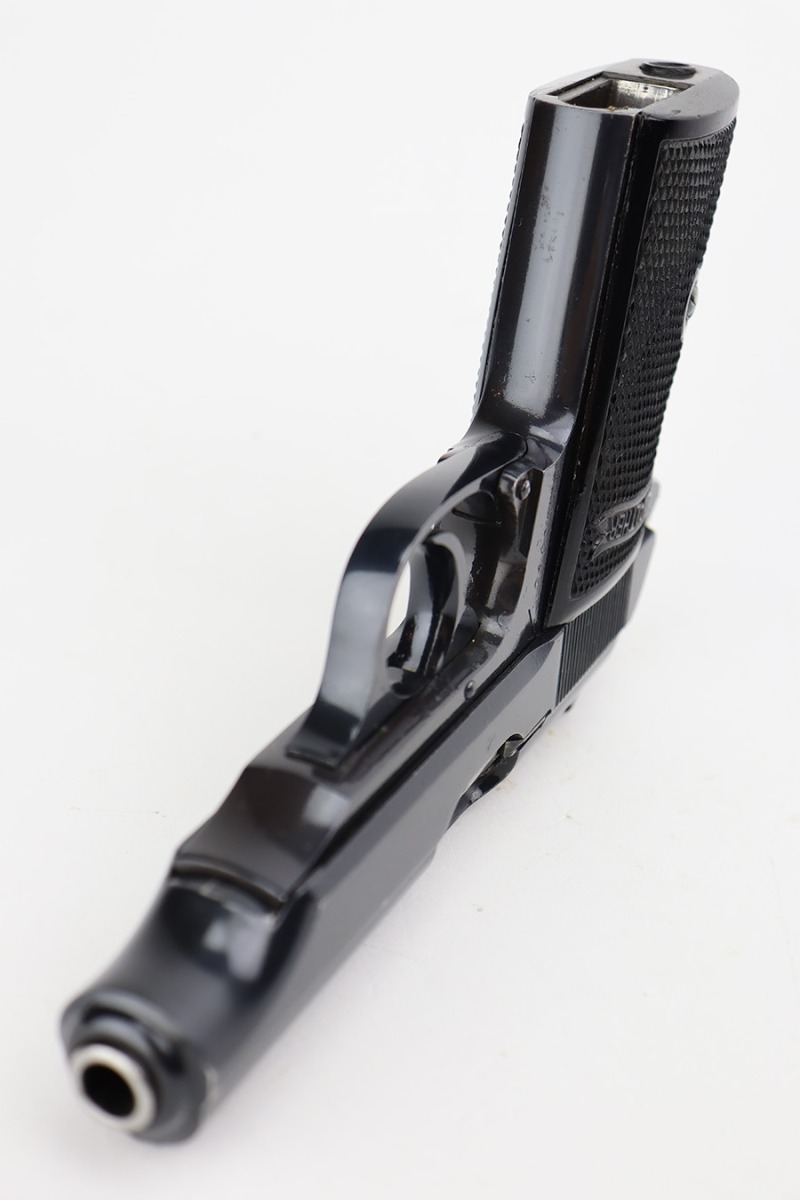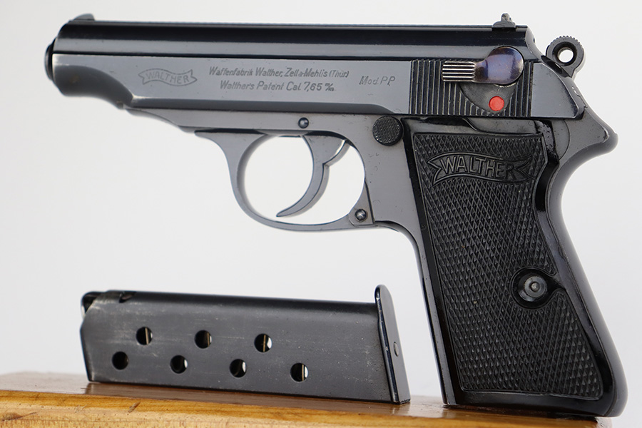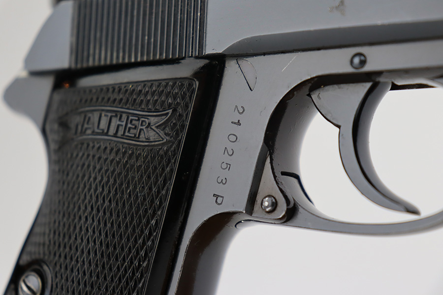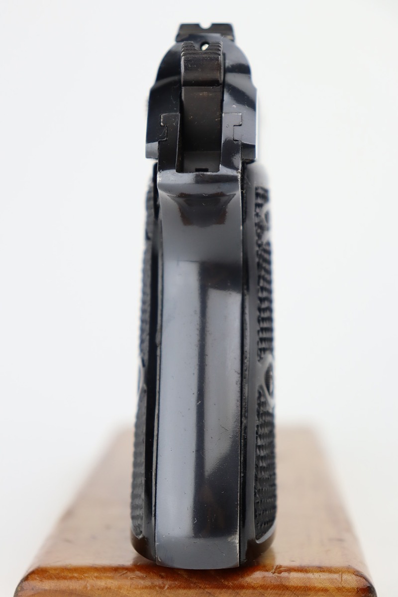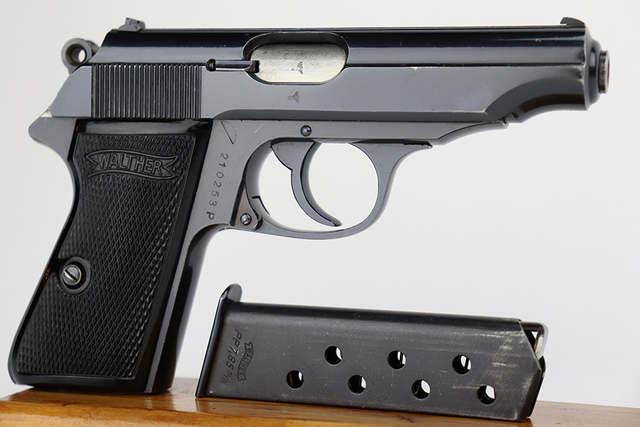 8/24/23 – This is a near-mint example of a Walther PP sold in the commercial market in 1940. It is all matching and has the proper “Eagle N” proofs. It has retained about 98% of its original high polish. There is just minor muzzle wear, a few tiny handling marks here and there, and hints of freckling on the grip straps. Fitted with excellent period-correct black bakelite grips and comes with a proper wartime magazine. Mint bore.