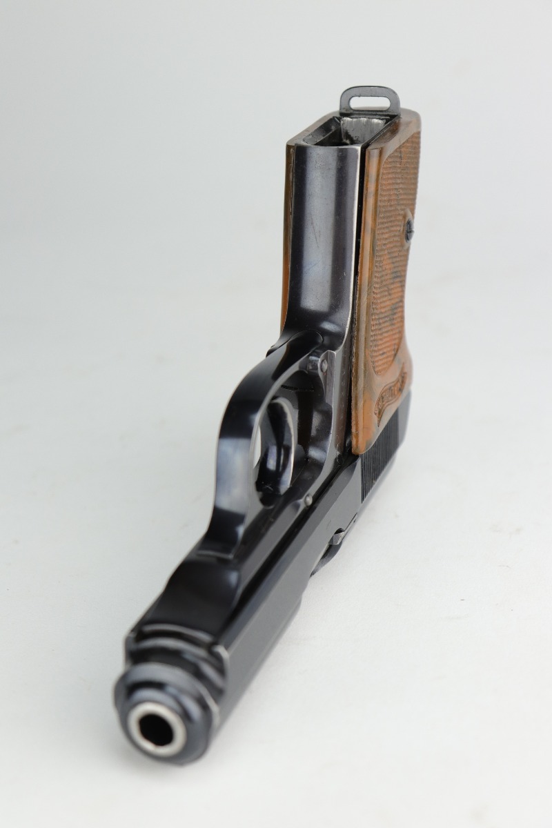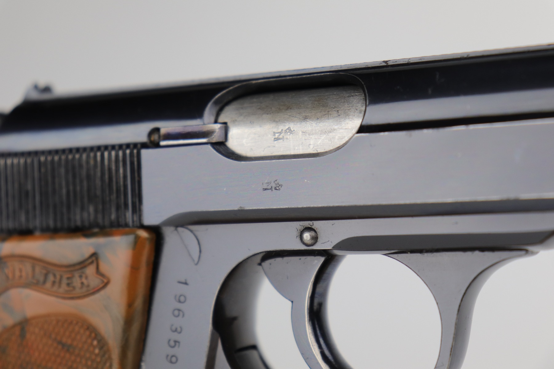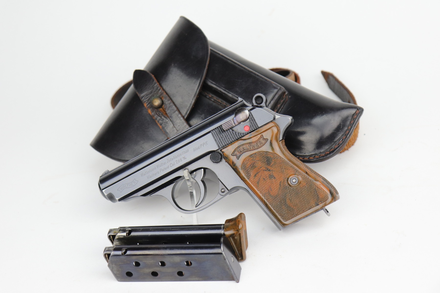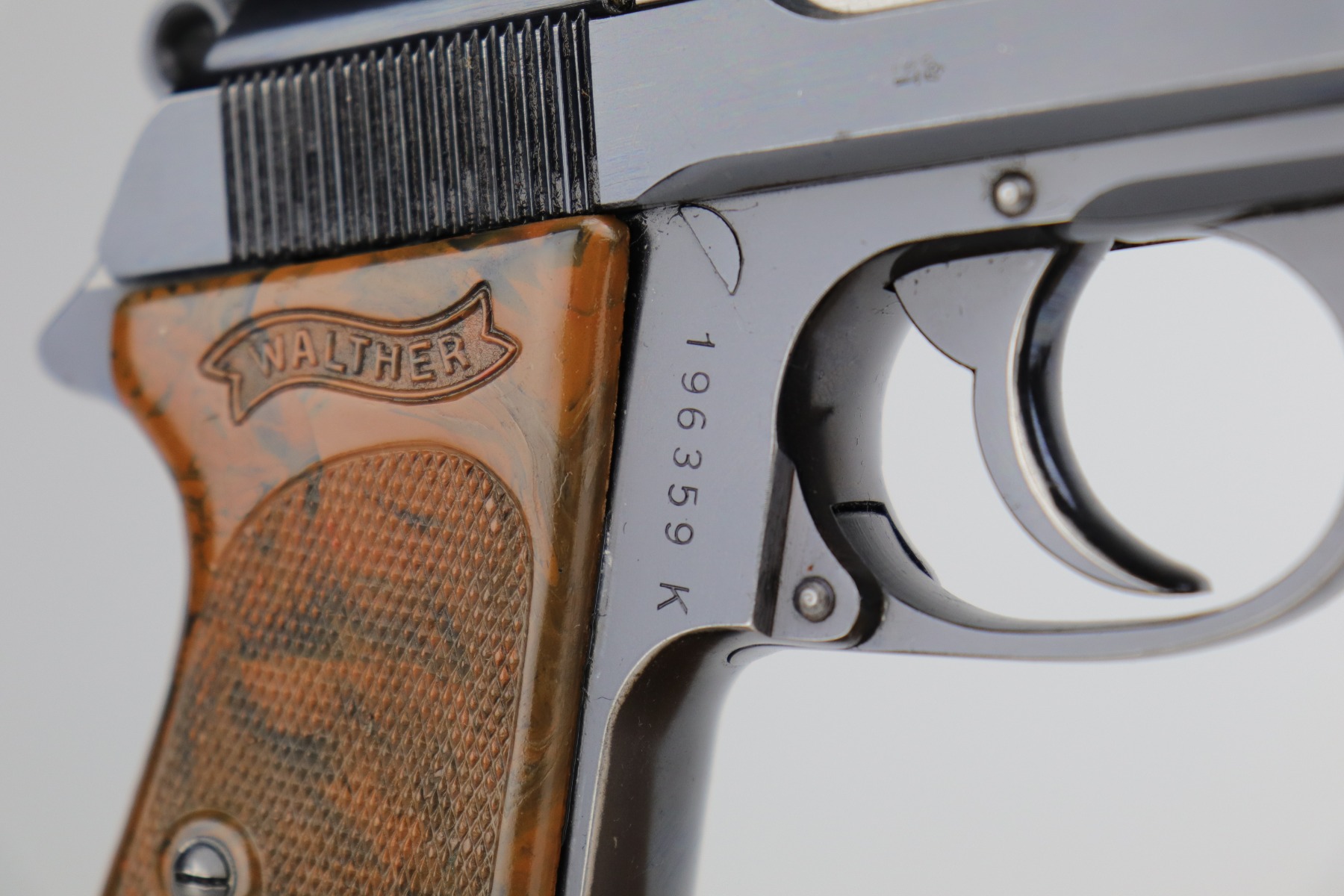 9/15/20 – This is a minty example of a commercial Walther PPK rig. The rig comes with a black leather holster, shoulder strap, a Walther banner finger extension magazine, and a Walther banner flat-bottom magazine. The gun is all matching and has retained more than 98% of its original bluing. There is very minor muzzle wear, high edge wear in general, and on the tang. There is also very light pin-pricking on the front strap. The brown Walther grip is excellent. There are hairline cracks on the left and right sides and at the very top of the spine. The bore is minty.