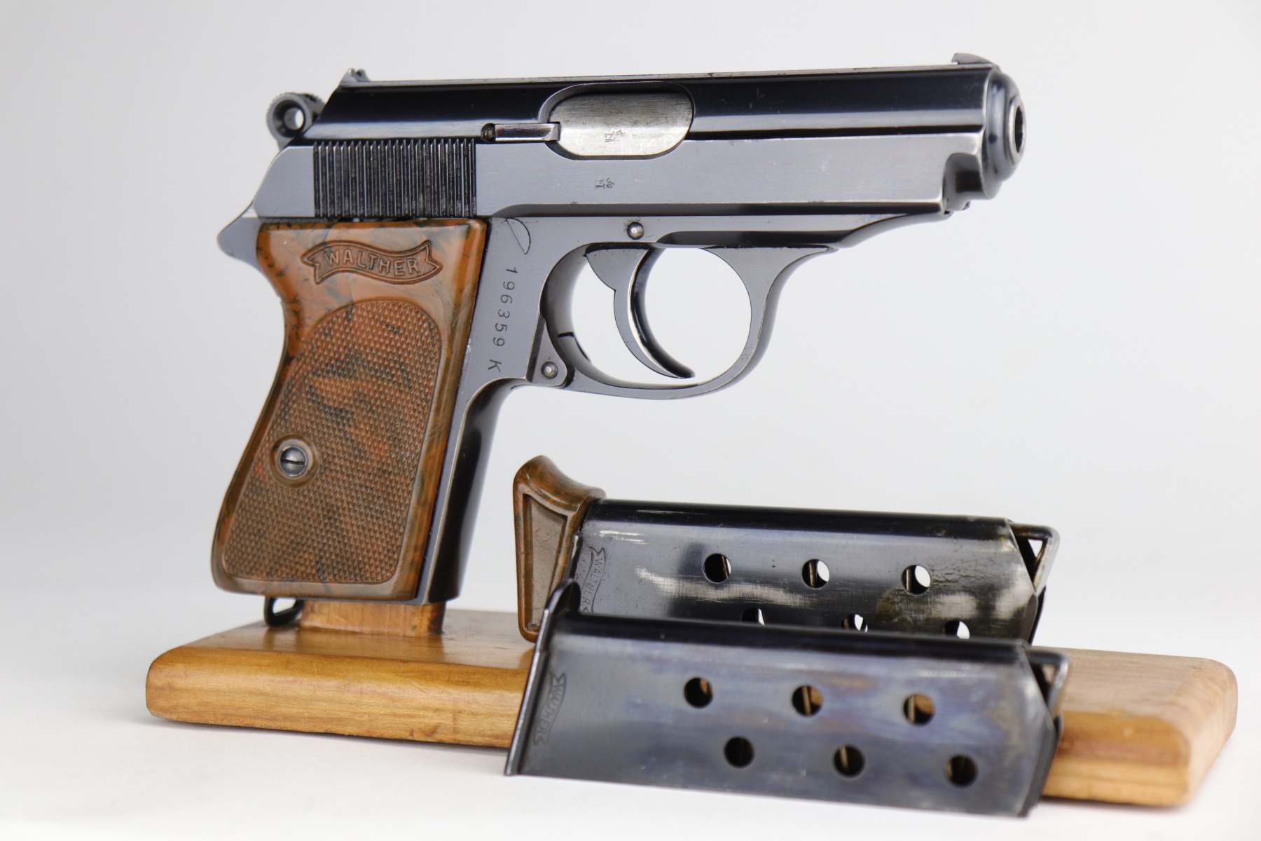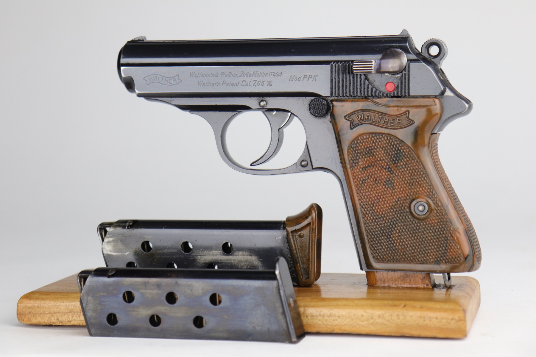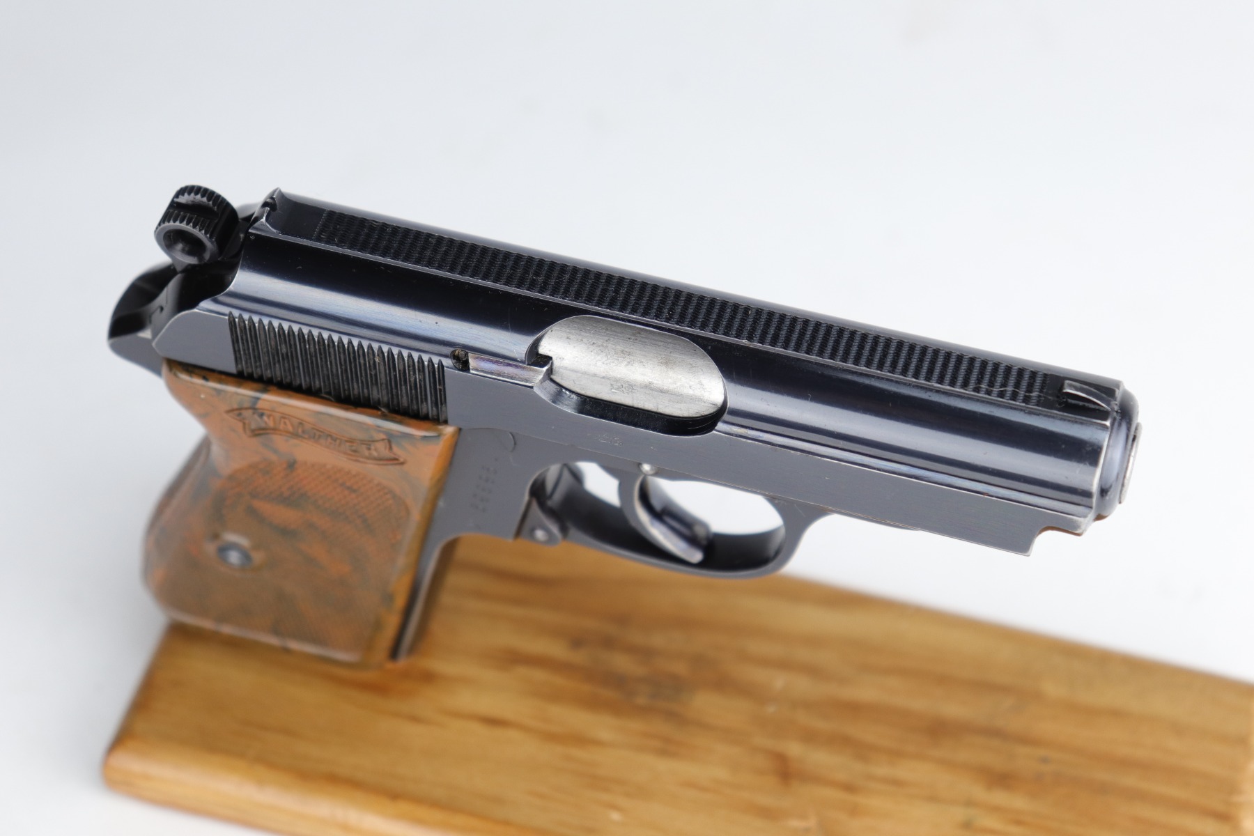 9/15/20 – This is a minty example of a commercial Walther PPK rig. The rig comes with a black leather holster, shoulder strap, a Walther banner finger extension magazine, and a Walther banner flat-bottom magazine. The gun is all matching and has retained more than 98% of its original bluing. There is very minor muzzle wear, high edge wear in general, and on the tang. There is also very light pin-pricking on the front strap. The brown Walther grip is excellent. There are hairline cracks on the left and right sides and at the very top of the spine. The bore is minty.