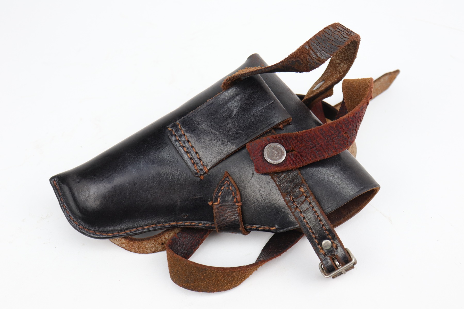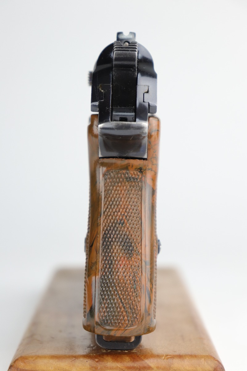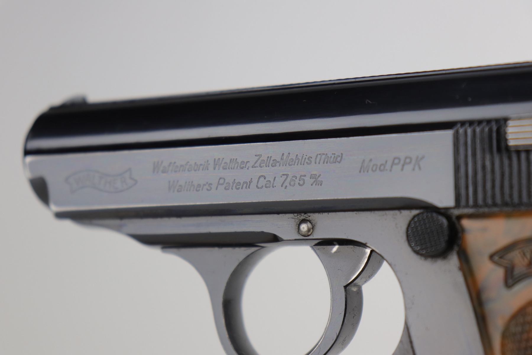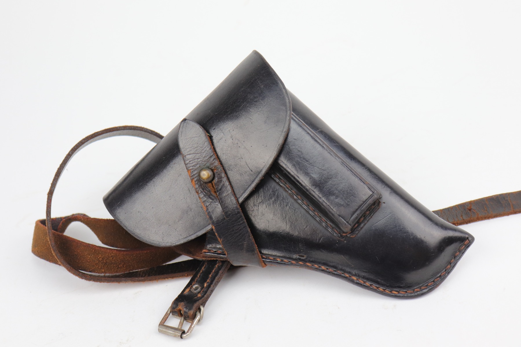 9/15/20 – This is a minty example of a commercial Walther PPK rig. The rig comes with a black leather holster, shoulder strap, a Walther banner finger extension magazine, and a Walther banner flat-bottom magazine. The gun is all matching and has retained more than 98% of its original bluing. There is very minor muzzle wear, high edge wear in general, and on the tang. There is also very light pin-pricking on the front strap. The brown Walther grip is excellent. There are hairline cracks on the left and right sides and at the very top of the spine. The bore is minty.