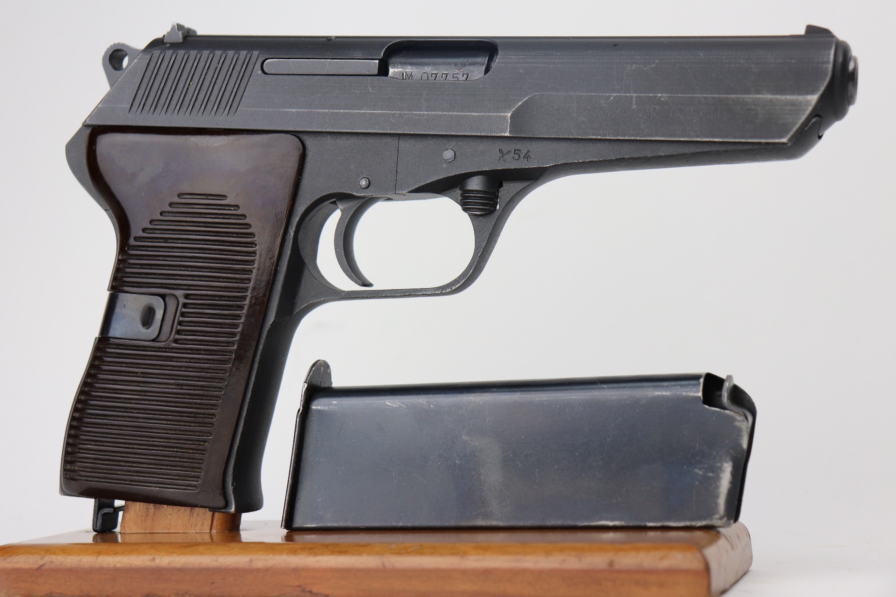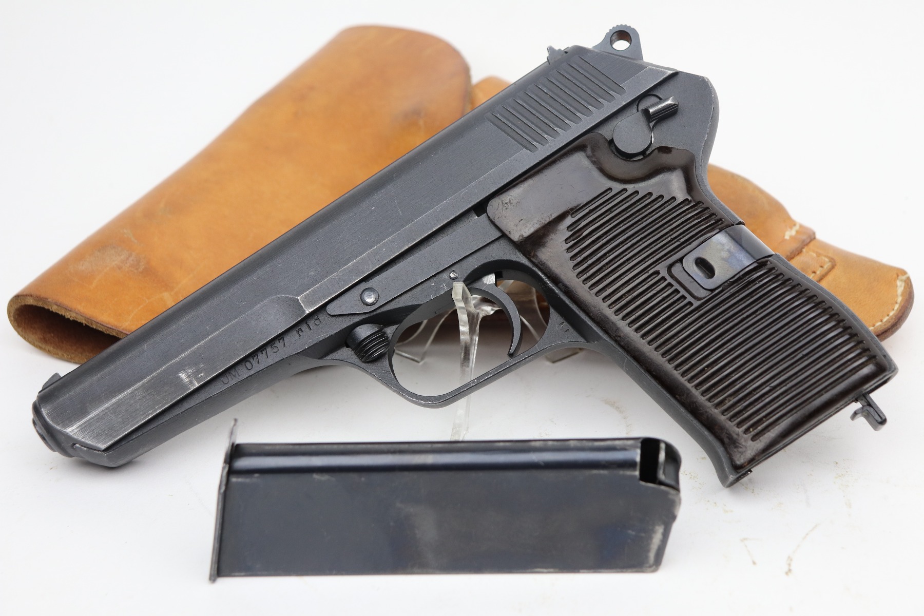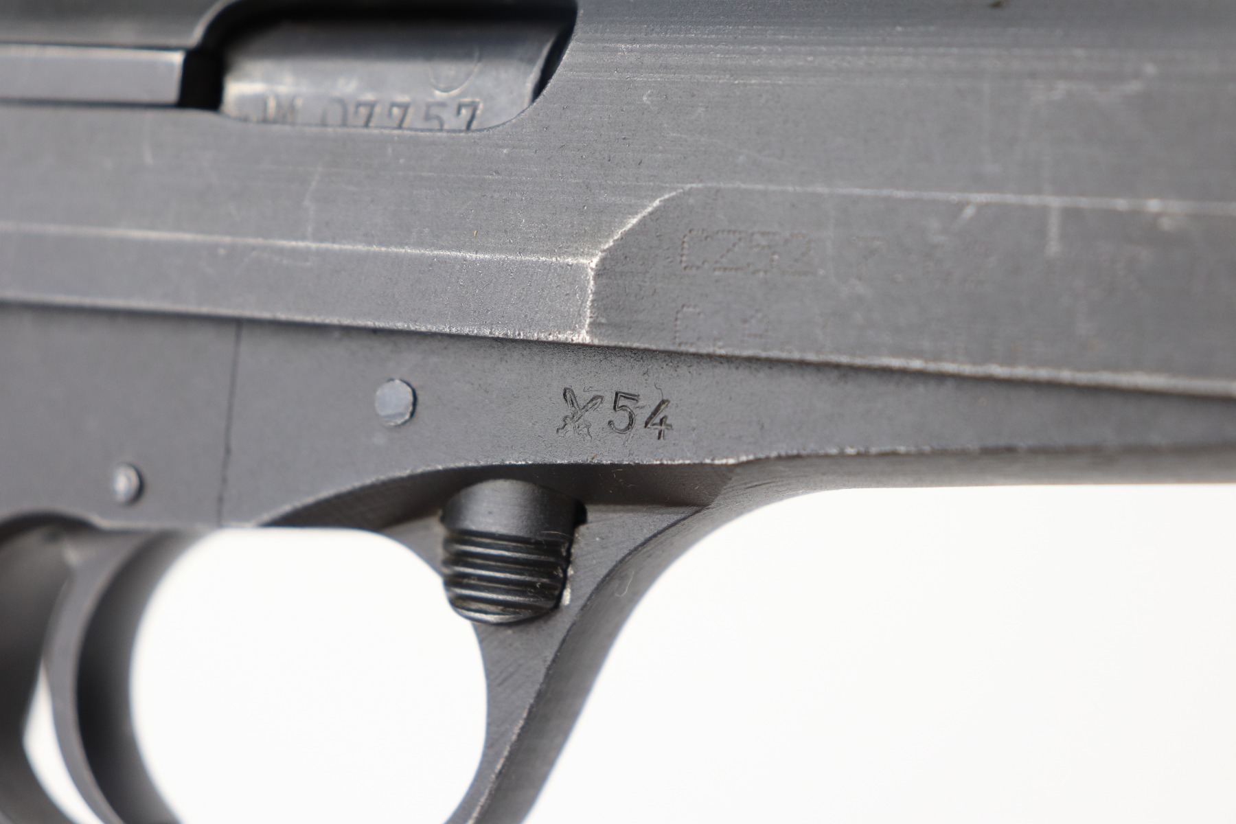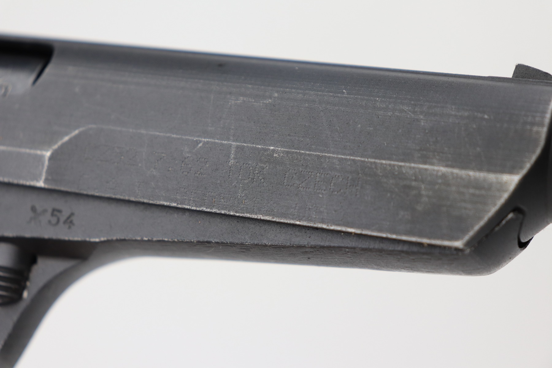 3/30/21 – This is a minty example of a CZ Model 52 Rig, manufactured in 1954. The gun is all matching and has an import mark on the right side of the slide. The rig comes with a nice tan leather holster, cleaning rod, and one proper magazine. Very minor wear around the muzzle and high edges of the slide. Excellent grips. The bore is near-mint.