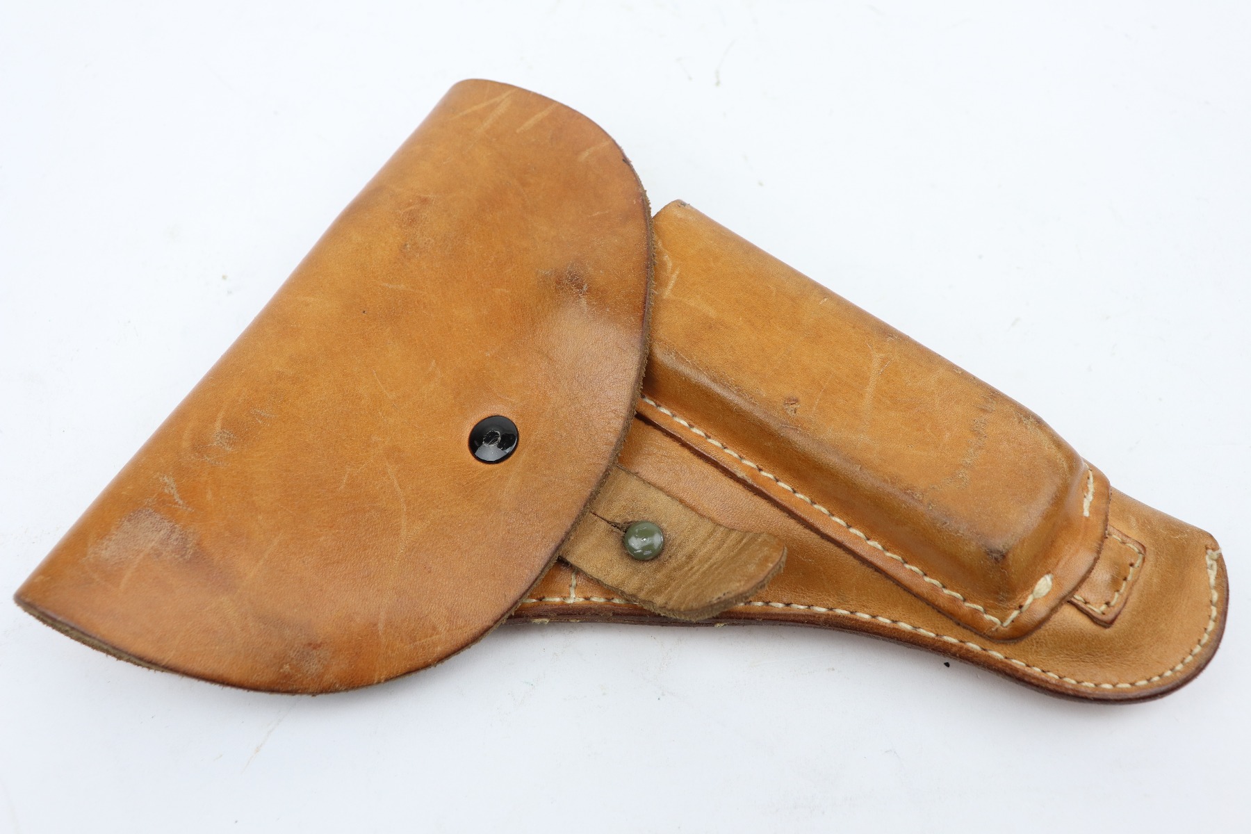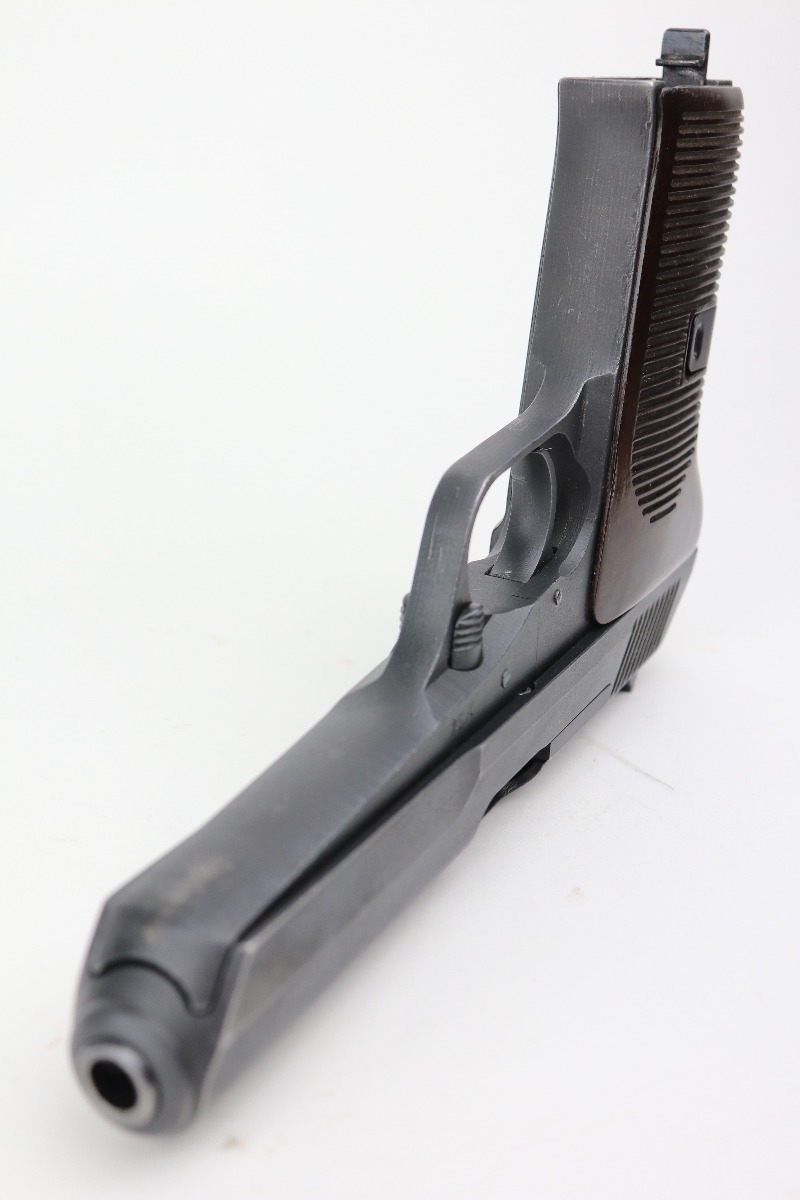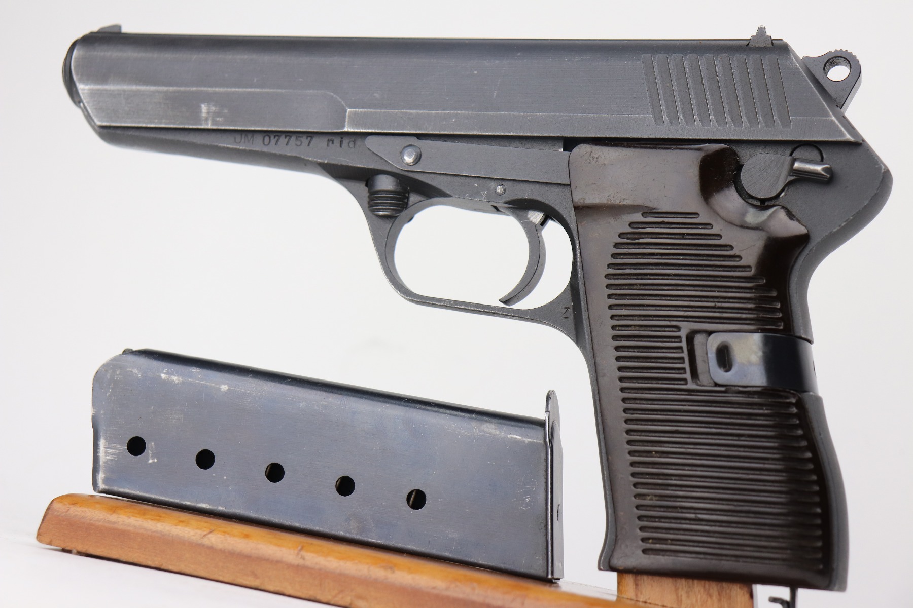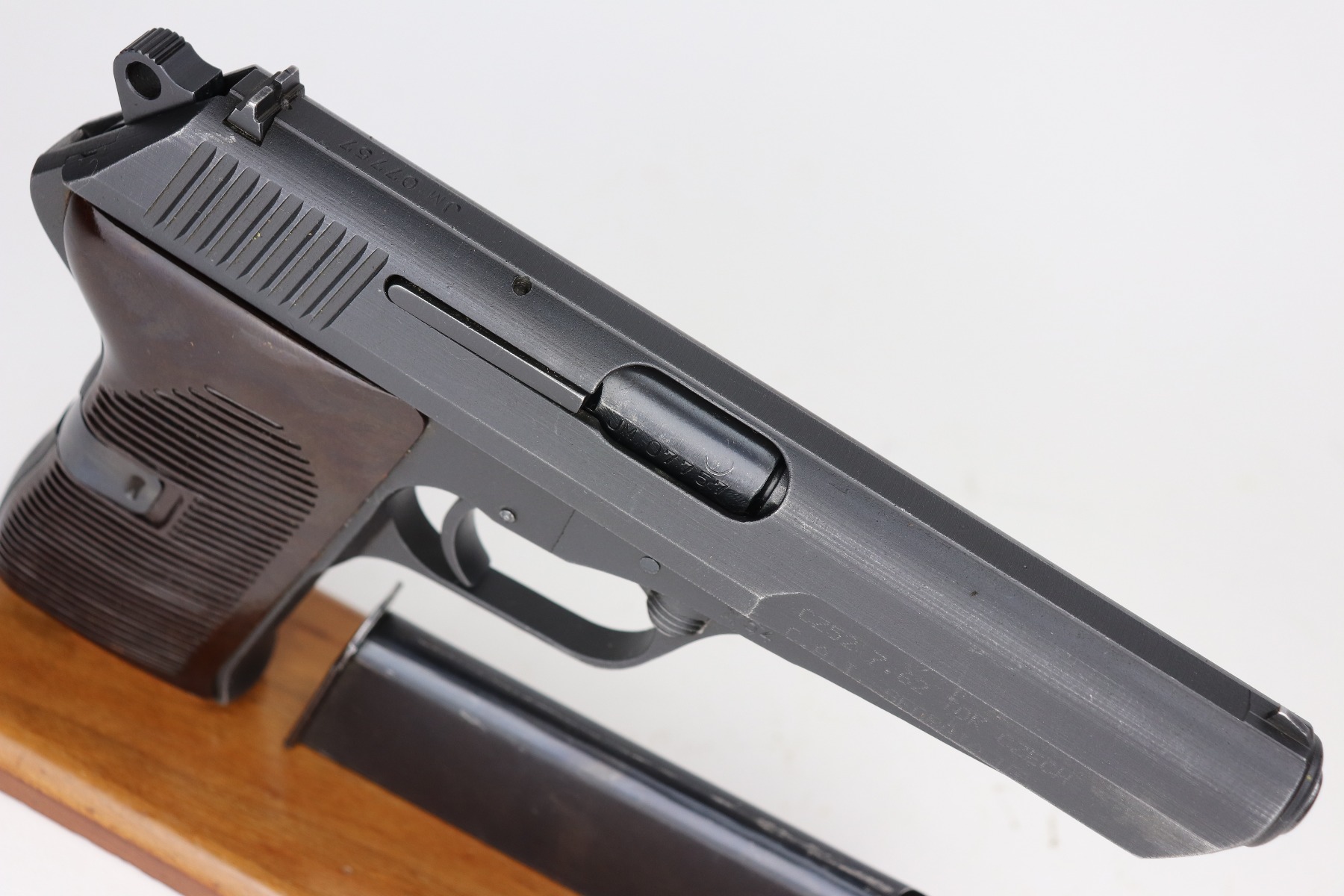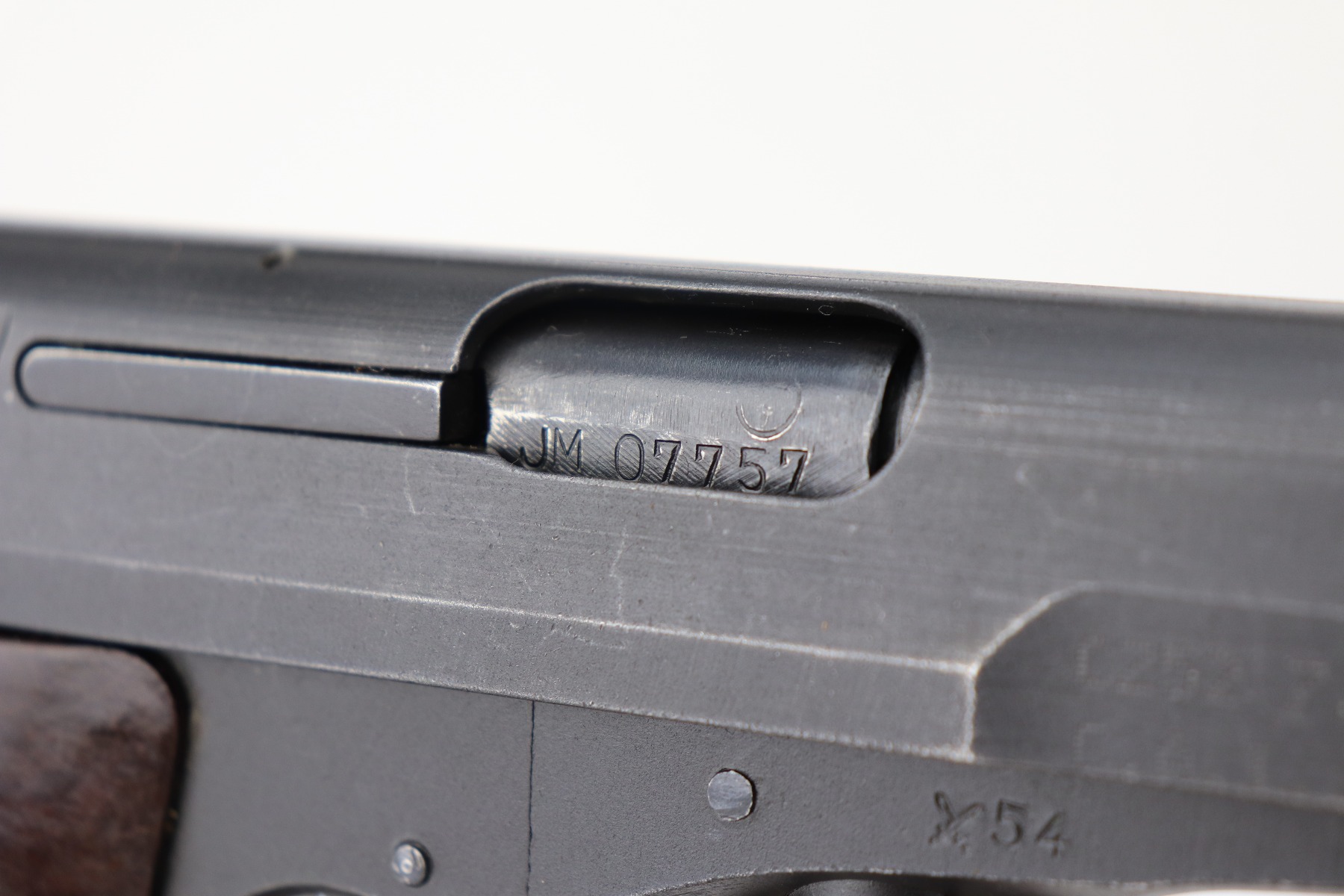 3/30/21 – This is a minty example of a CZ Model 52 Rig, manufactured in 1954. The gun is all matching and has an import mark on the right side of the slide. The rig comes with a nice tan leather holster, cleaning rod, and one proper magazine. Very minor wear around the muzzle and high edges of the slide. Excellent grips. The bore is near-mint.