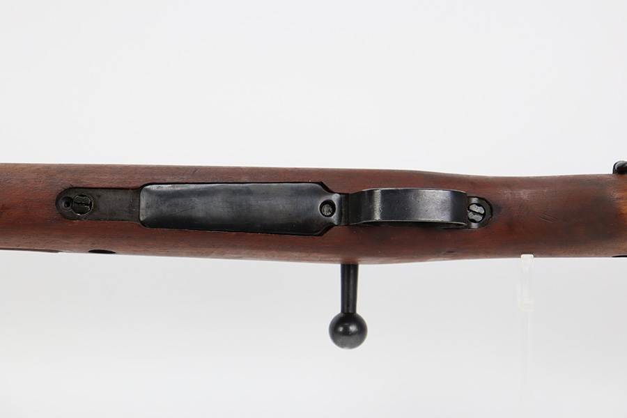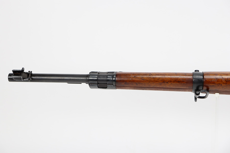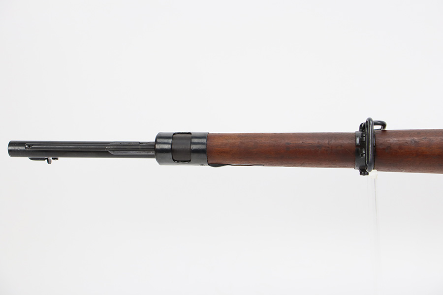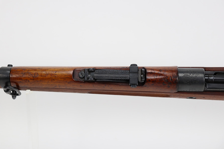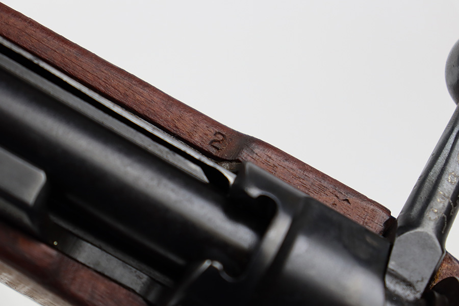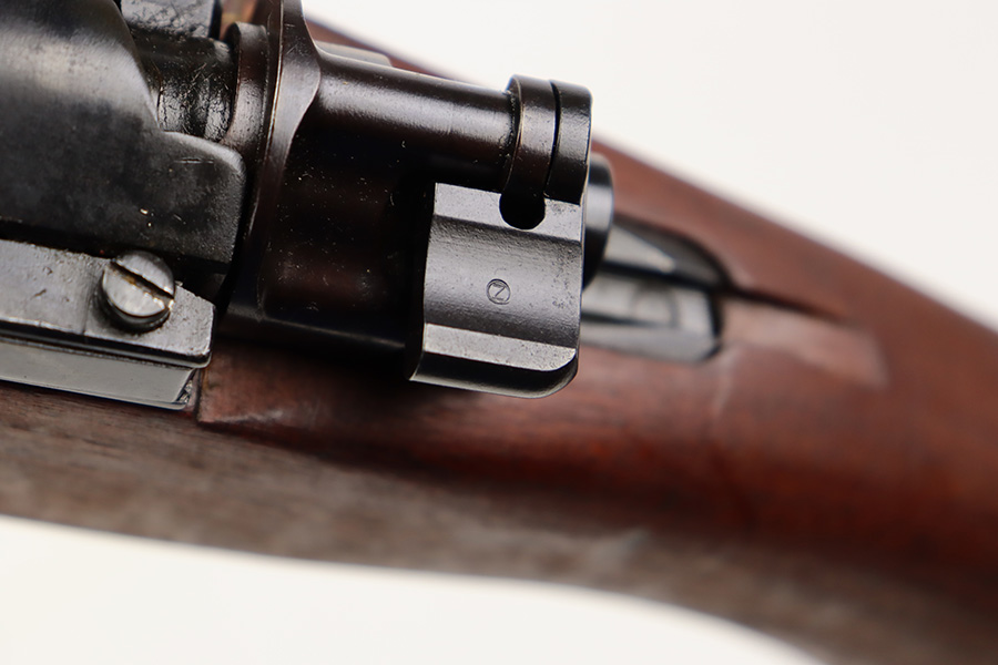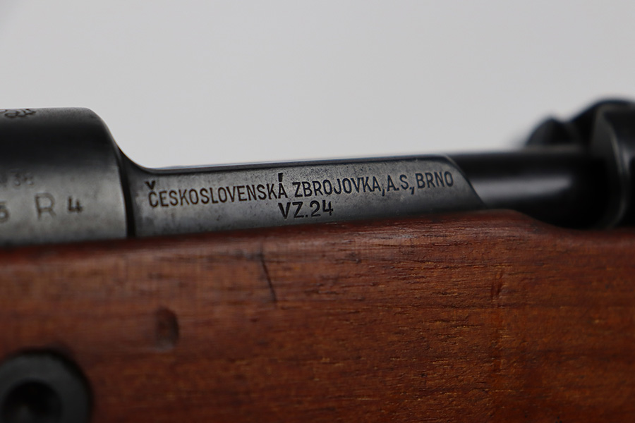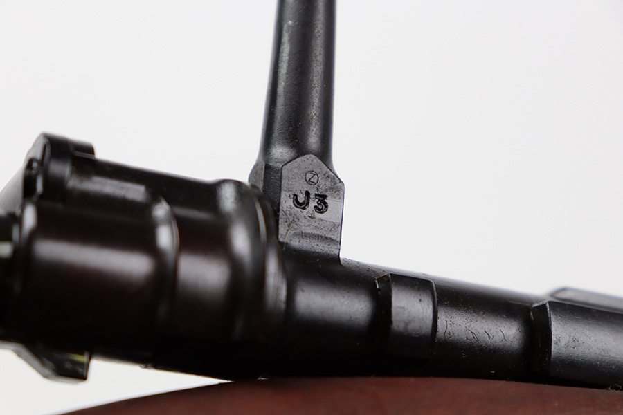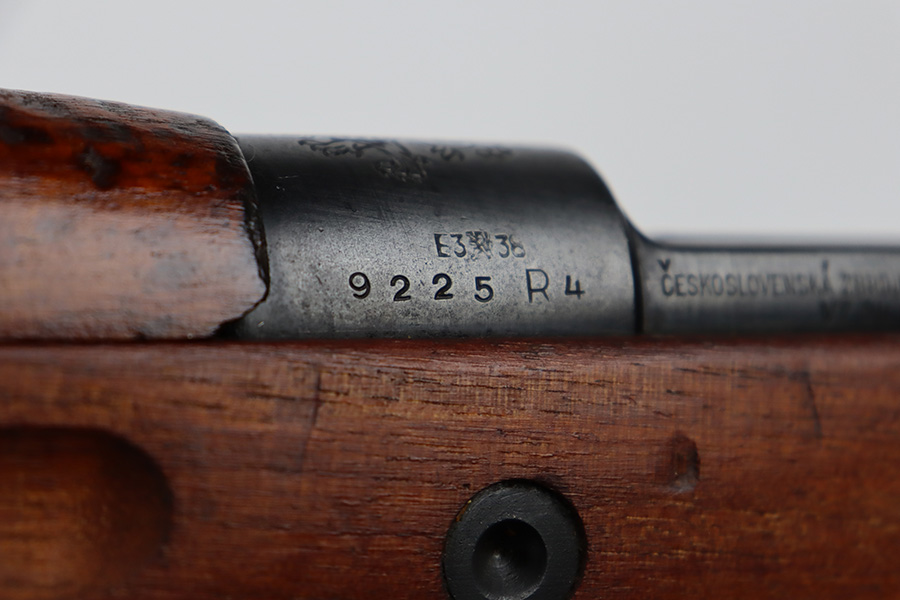 9/7/23 – This is a very nice Czech VZ.24 rifle with 1938 date on receiver. It’s arsenal refurbished, with matching numbers throughout but the bolt serial is hand etched. Excellent bluing throughout. Bore has strong rifling but some frost and pitting in the grooves. Minty stock, though handguard is visibly from a different rifle. Locking screws are missing from trigger assembly. Import mark on barrel.