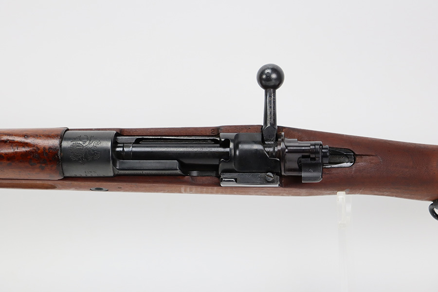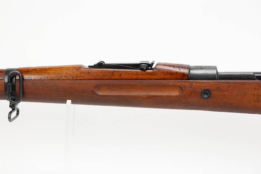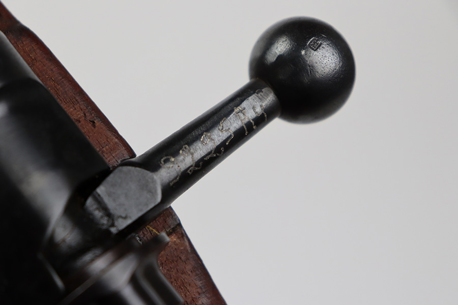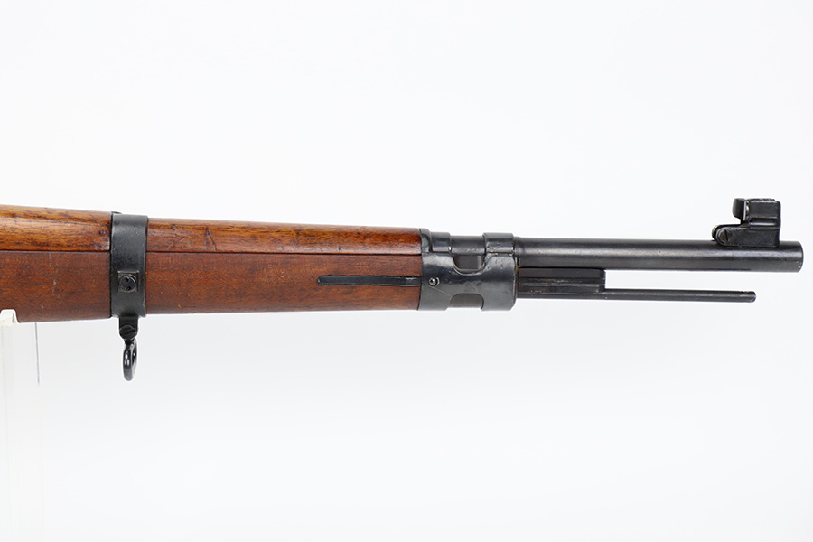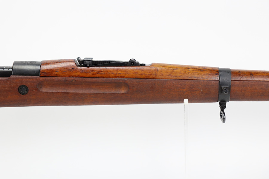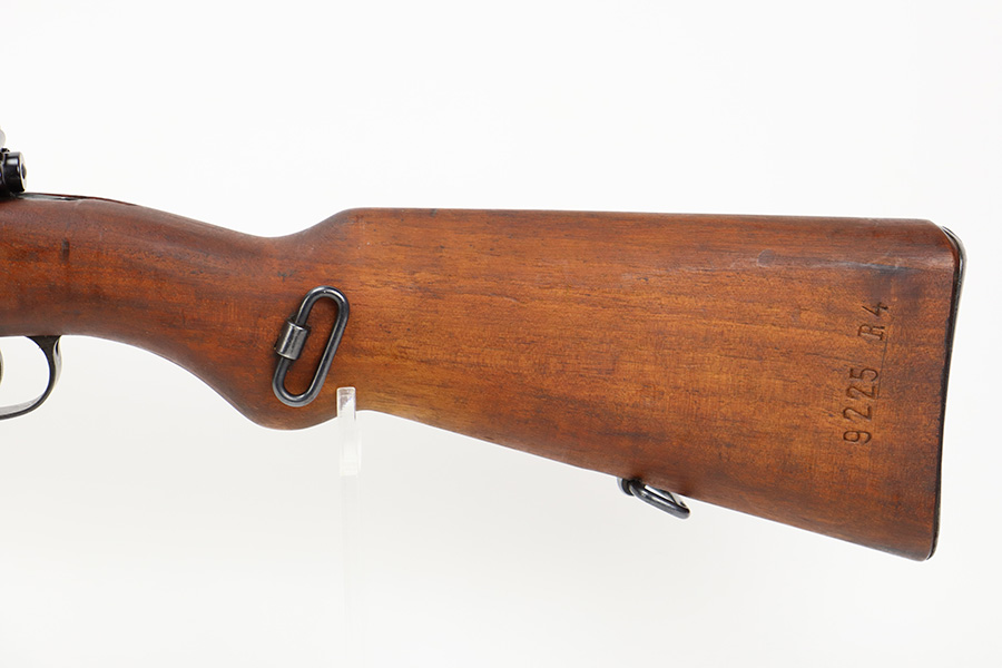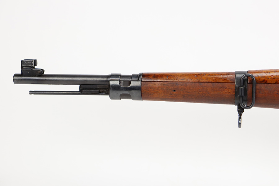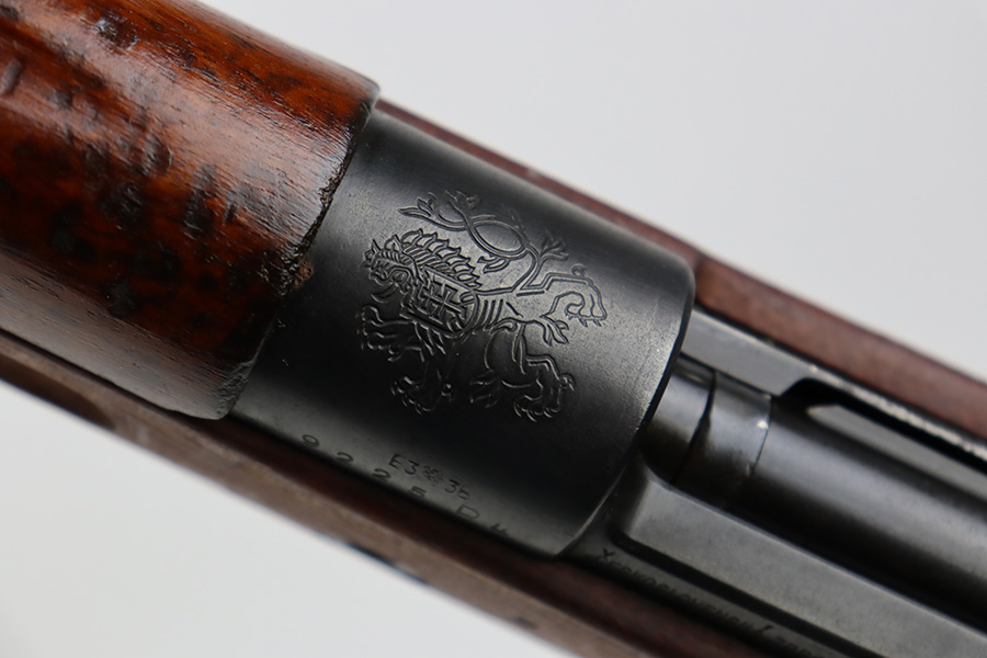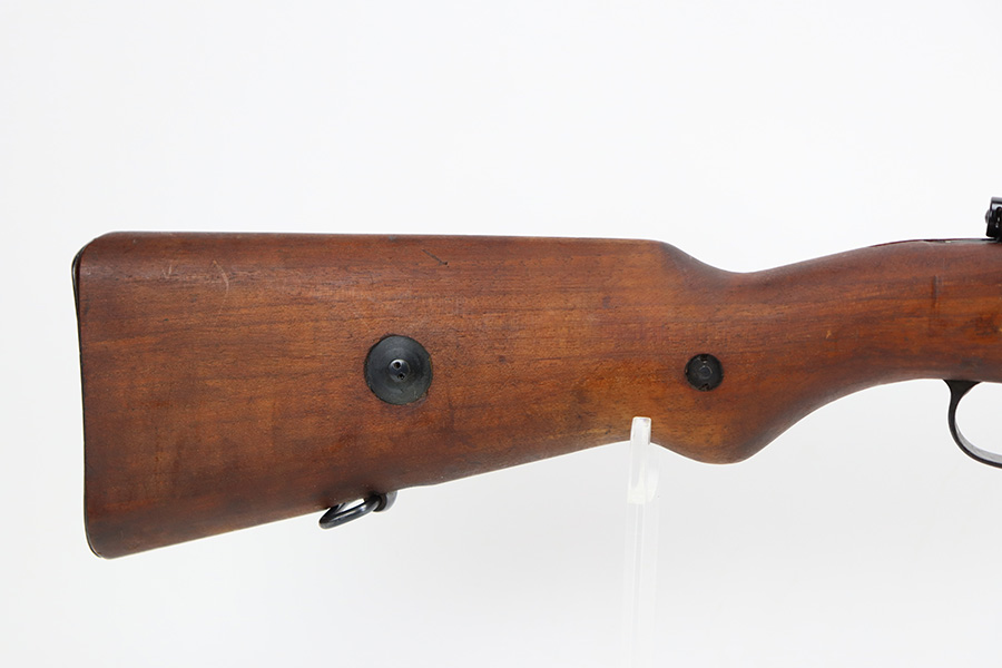 9/7/23 – This is a very nice Czech VZ.24 rifle with 1938 date on receiver. It’s arsenal refurbished, with matching numbers throughout but the bolt serial is hand etched. Excellent bluing throughout. Bore has strong rifling but some frost and pitting in the grooves. Minty stock, though handguard is visibly from a different rifle. Locking screws are missing from trigger assembly. Import mark on barrel.