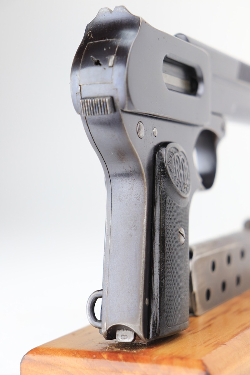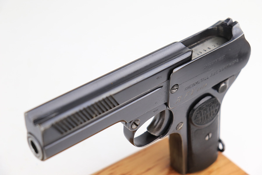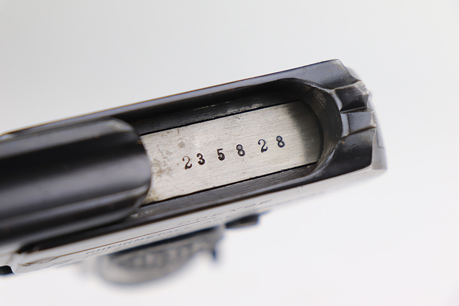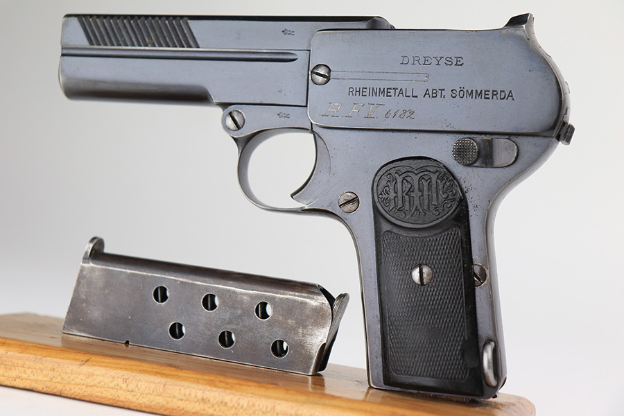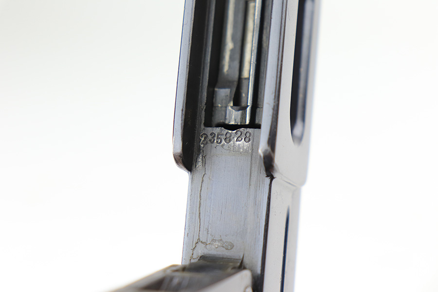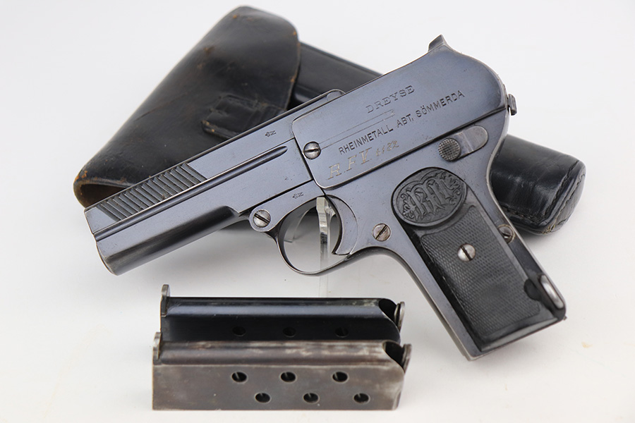 3/4/22 – This is a minty example of a Dreyse Model 1907 manufactured in the early 1900’s. It is all matching and has the proper “Crown N” proofs. There is a post-factory “RFV 6182” marking on the left side of the frame, indicating that this gun would have been issued to the Finance Ministry of the Third Reich. This marking appears to be original, but we could not find many to compare it to. In any case, the gun comes as a rig with a 1937-dated police holster and two period-correct magazines. The gun has retained about 98% of its original finish with very minor thinning and light brown patina on the front strap and hints of wear on some of the high edges. The bore has good rifling, but there are tiny pits in some of the grooves.