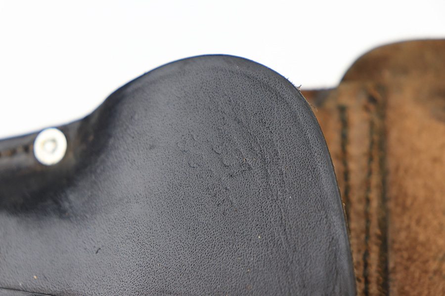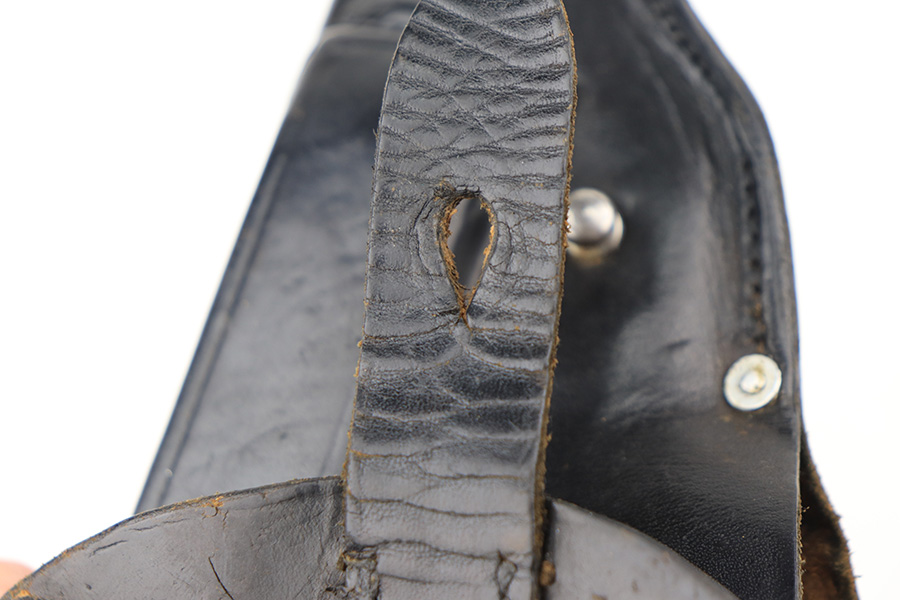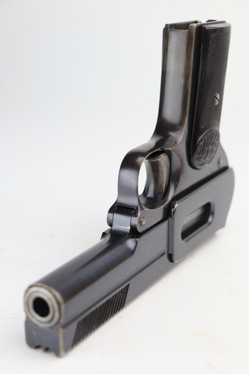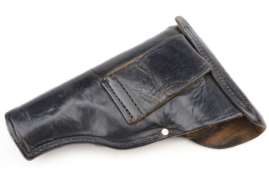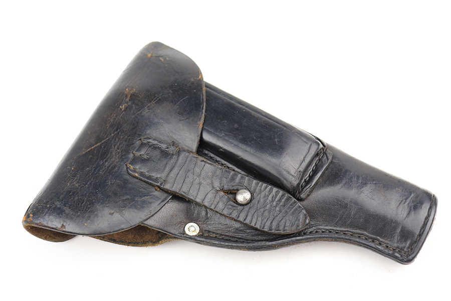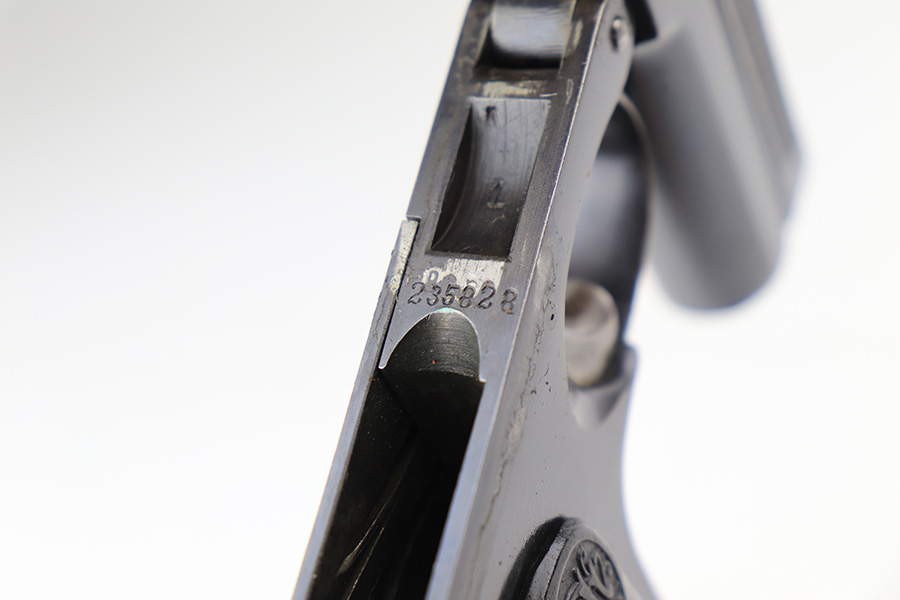 3/4/22 – This is a minty example of a Dreyse Model 1907 manufactured in the early 1900’s. It is all matching and has the proper “Crown N” proofs. There is a post-factory “RFV 6182” marking on the left side of the frame, indicating that this gun would have been issued to the Finance Ministry of the Third Reich. This marking appears to be original, but we could not find many to compare it to. In any case, the gun comes as a rig with a 1937-dated police holster and two period-correct magazines. The gun has retained about 98% of its original finish with very minor thinning and light brown patina on the front strap and hints of wear on some of the high edges. The bore has good rifling, but there are tiny pits in some of the grooves.