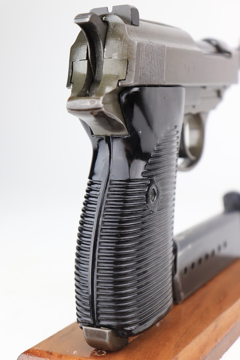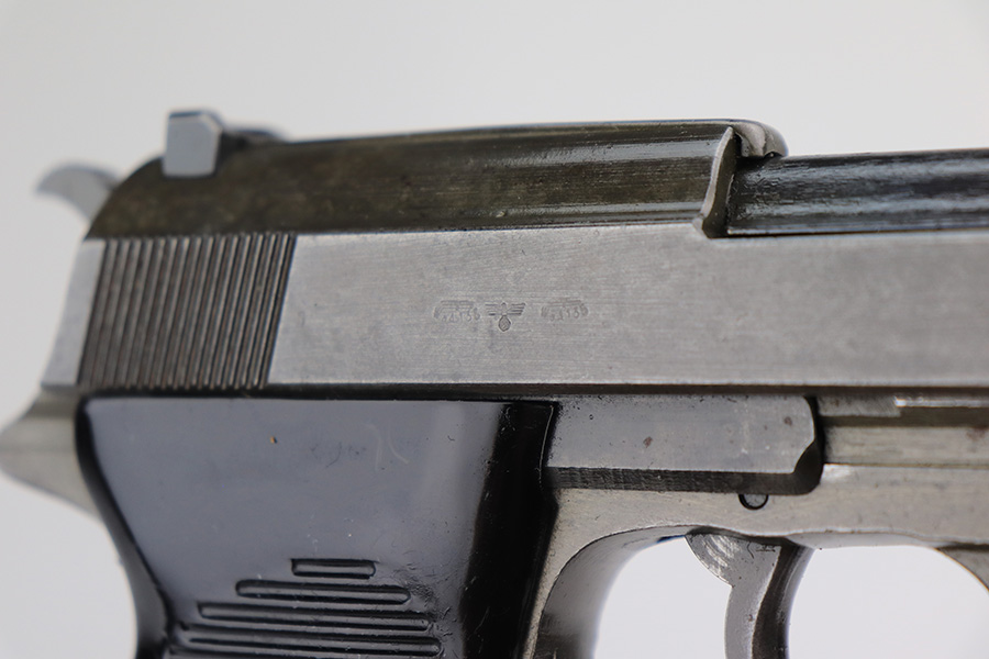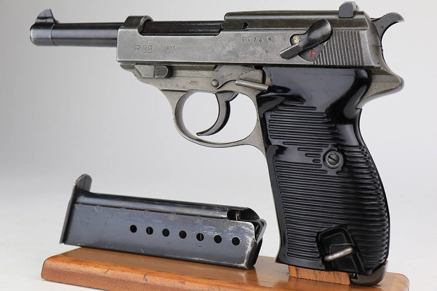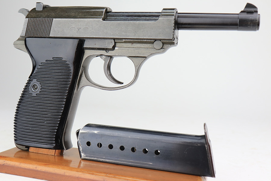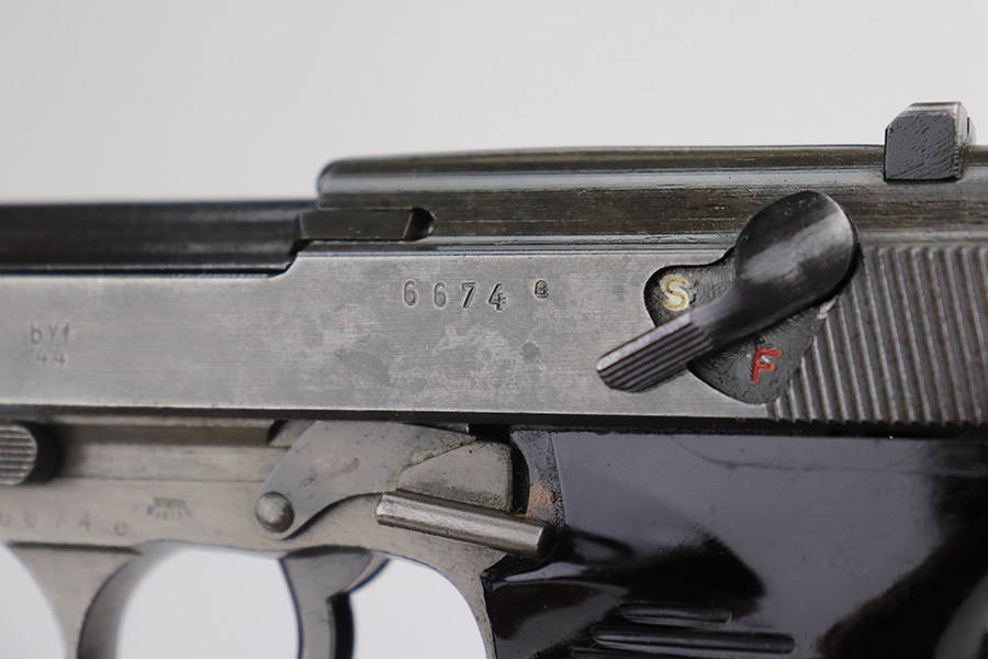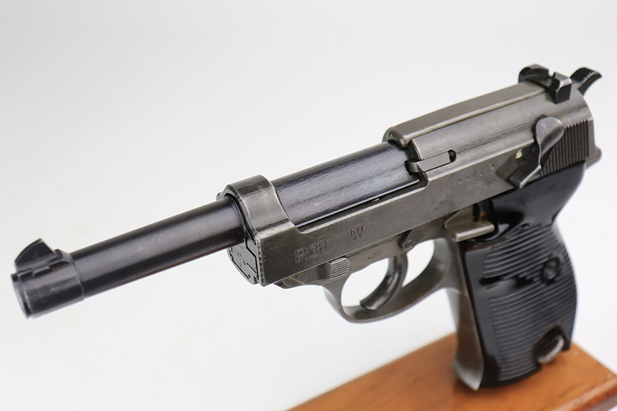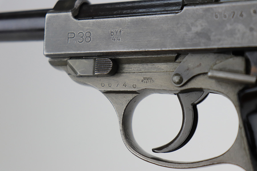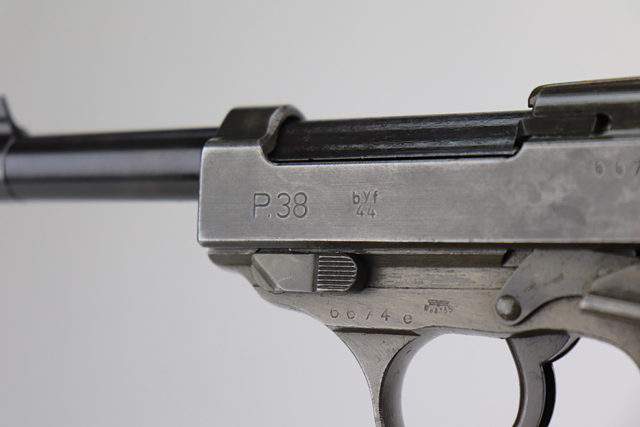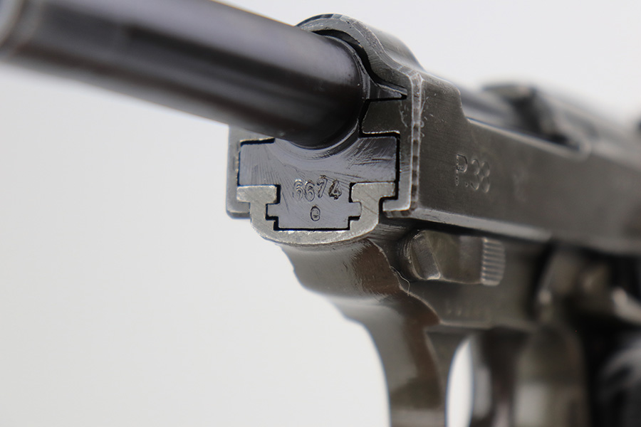4/5/22 – This is a minty example of a “dual-tone” BYF 44 Mauser P.38 issued to the Nazi military in 1944. The gun is all matching and has the proper “Waffen 135” Nazi military acceptance proofs throughout. The barrel is blued, and the slide and frame have a phosphate finish, giving this gun its iconic dual-tone finish. It has retained about 97-98% of its original finish. There is just a hint of thinning on the front strap and hints of wear around the high edges and around the muzzle. There is some spotty discoloration on the phosphate parts – typical for this finish. Comes with nice black bakelite grips – the left panel is shaved down. Also comes with a rare late-war “U”-marked Walther magazine. Stone-mint bore. De-cocker is functional.