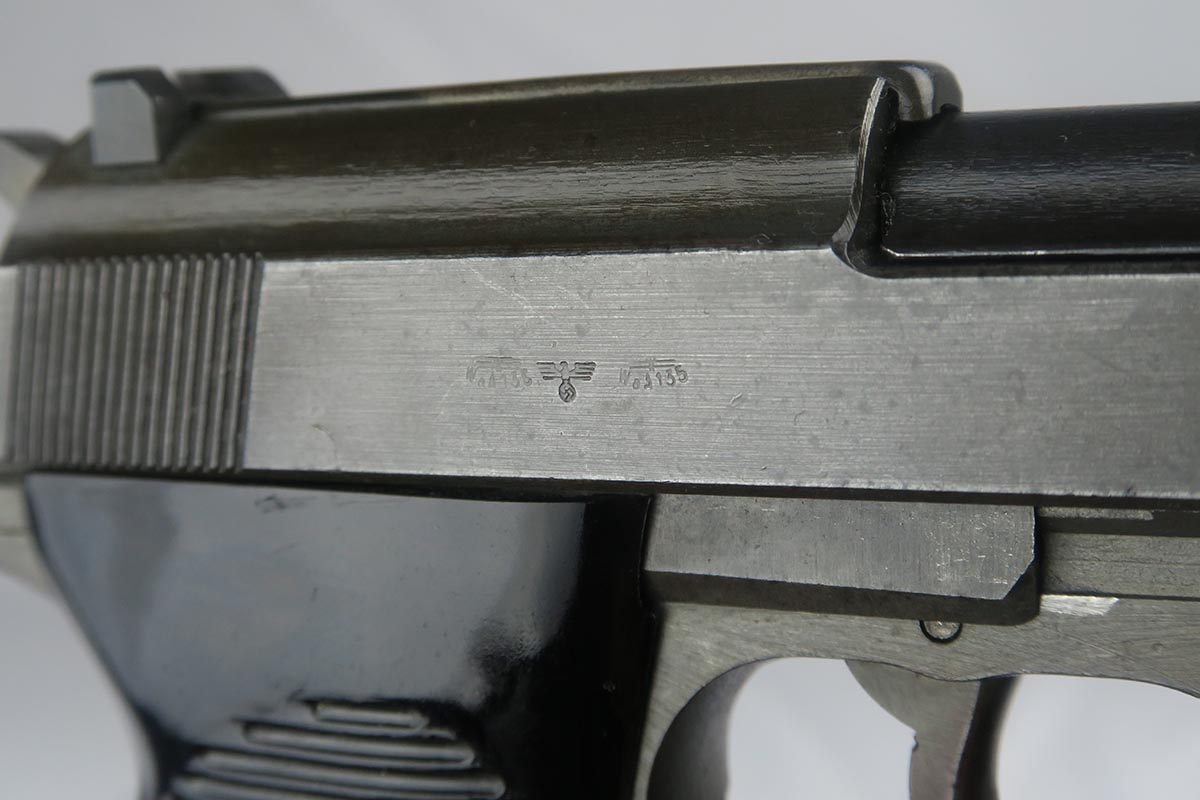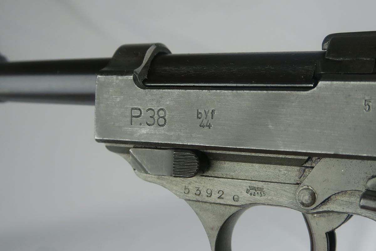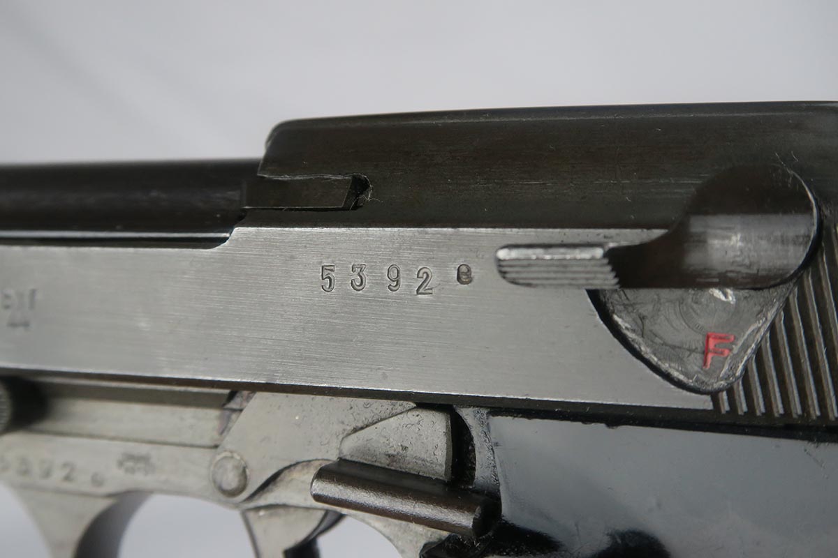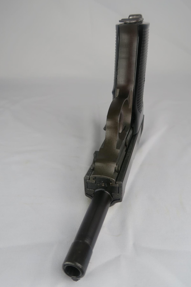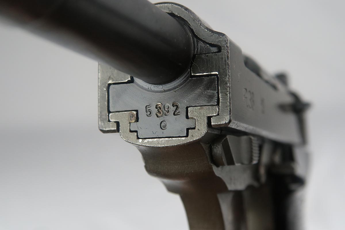 1/9/20 – This is a near-mint condition Mauser P.38 with dual-tone finish from 1944. The pistol shows only the slightest muzzle wear and a spot of minor discoloration on the right side of the slide. The barrel is blued but all other parts have a minty phosphate finish. Excellent bore and black Mauser grips.