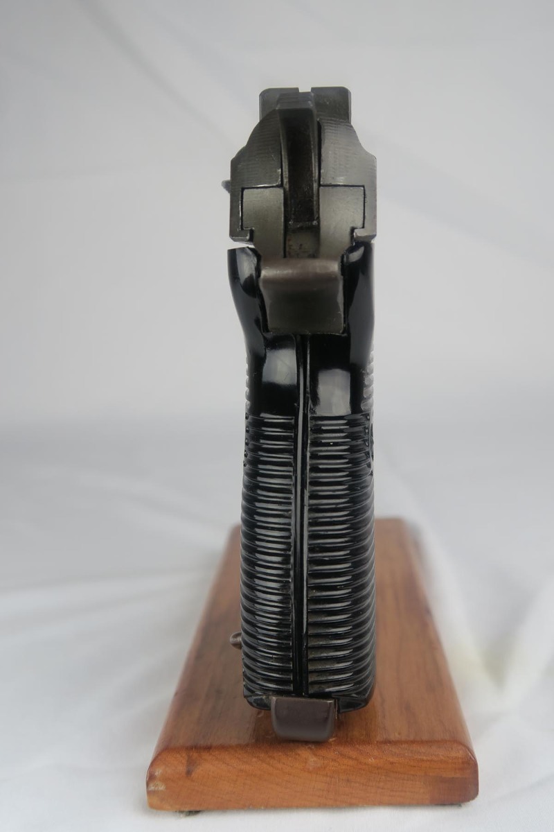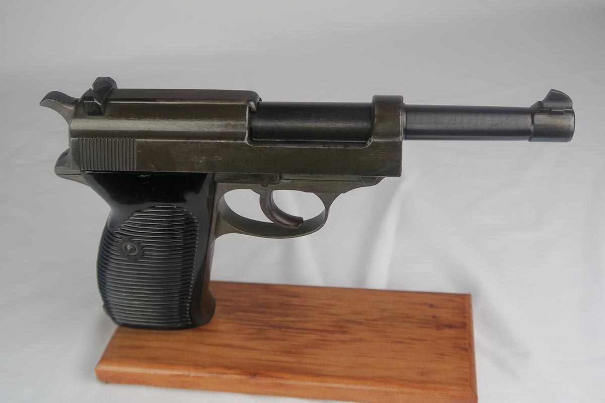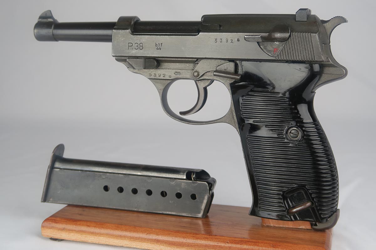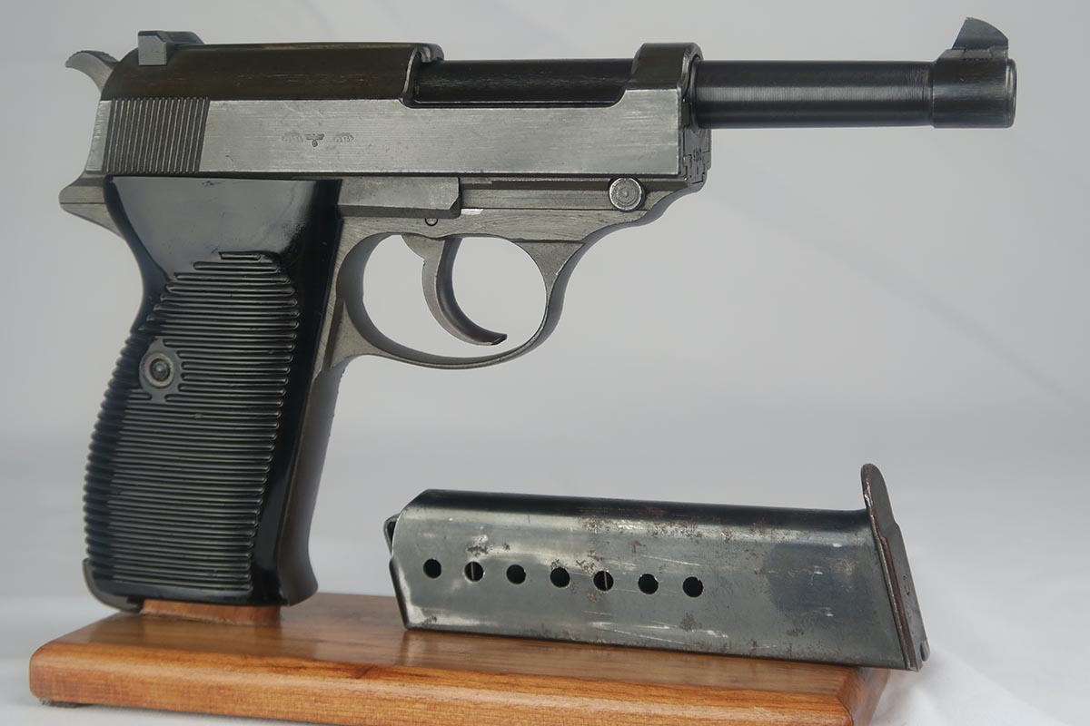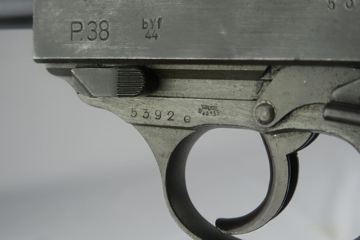 1/9/20 – This is a near-mint condition Mauser P.38 with dual-tone finish from 1944. The pistol shows only the slightest muzzle wear and a spot of minor discoloration on the right side of the slide. The barrel is blued but all other parts have a minty phosphate finish. Excellent bore and black Mauser grips.
