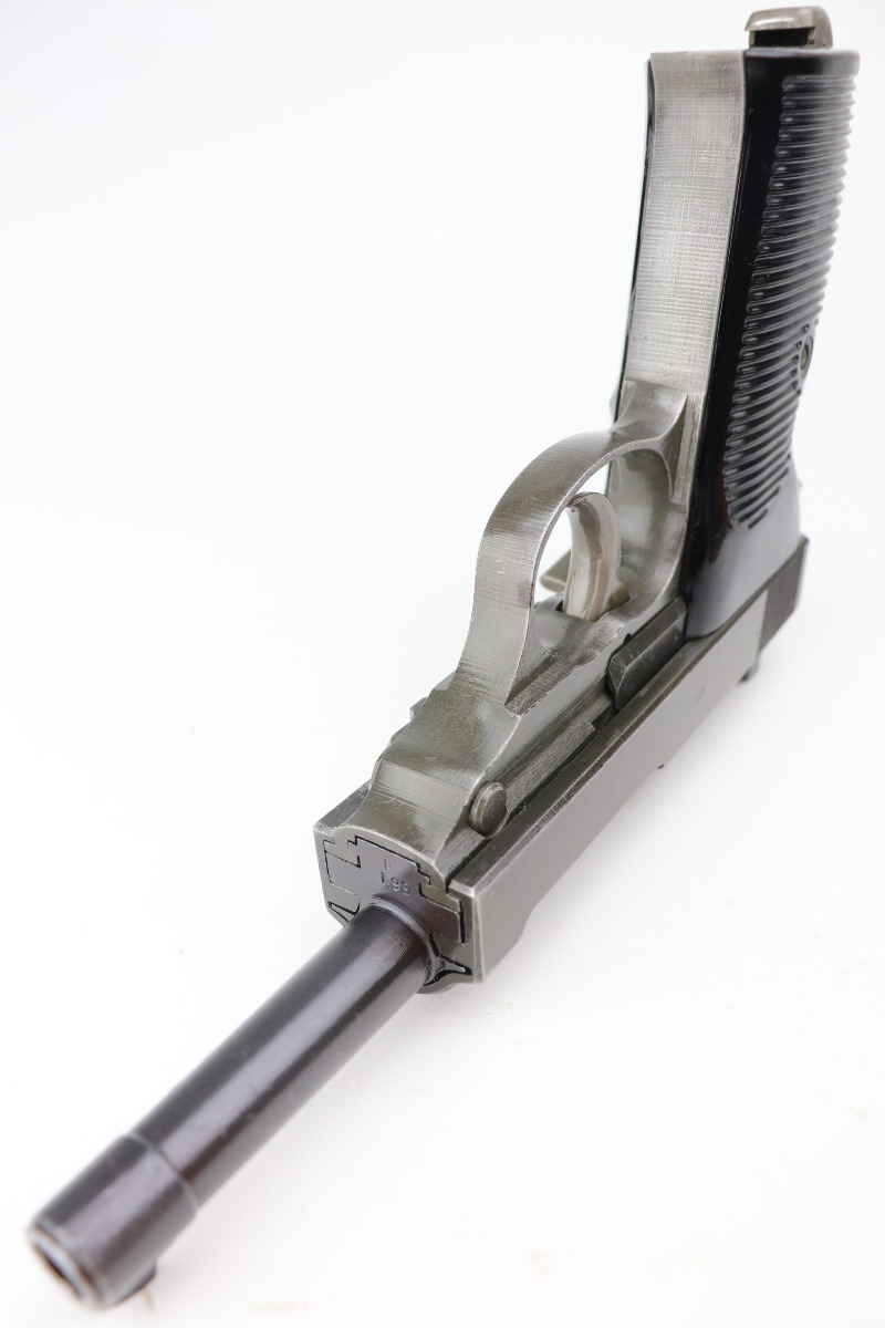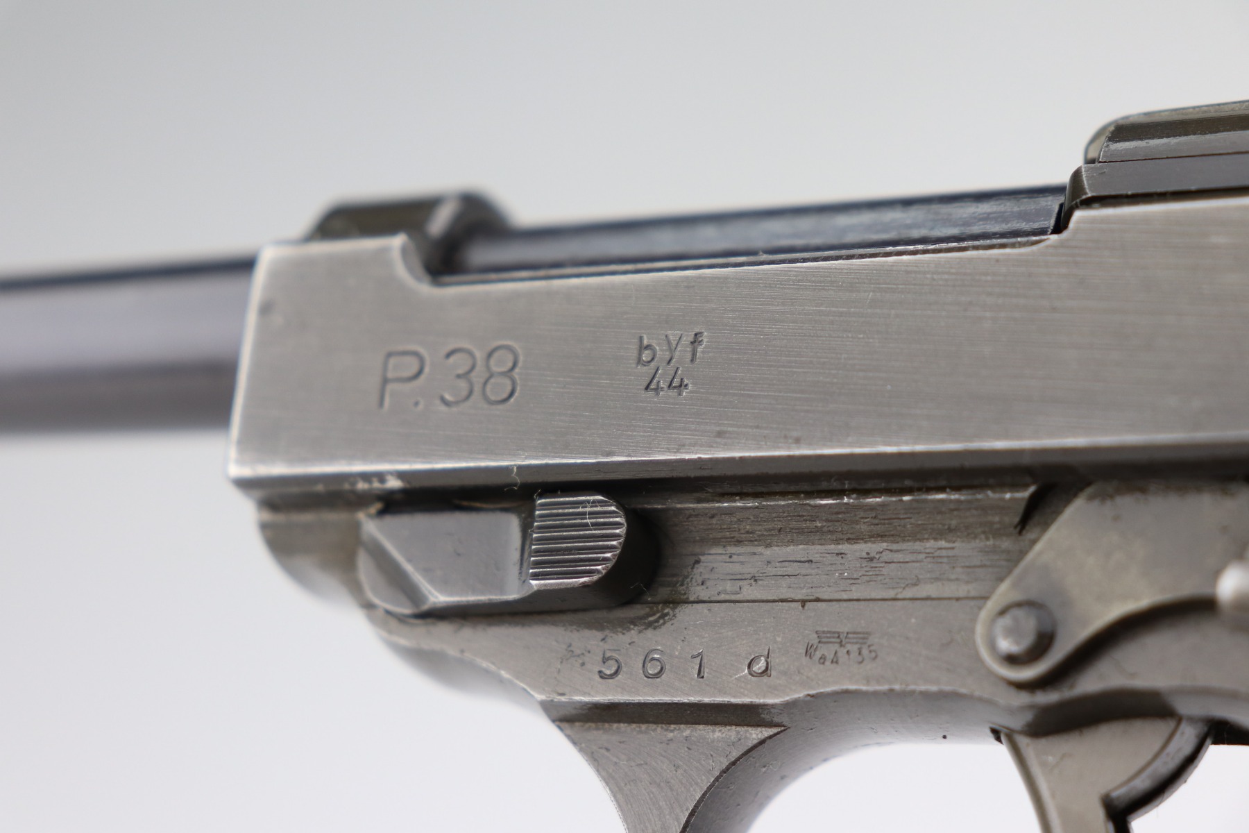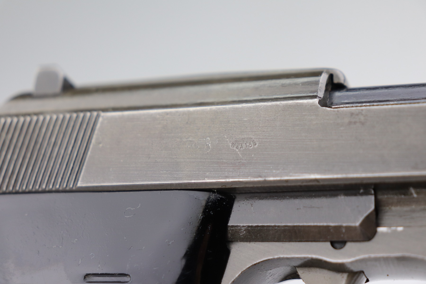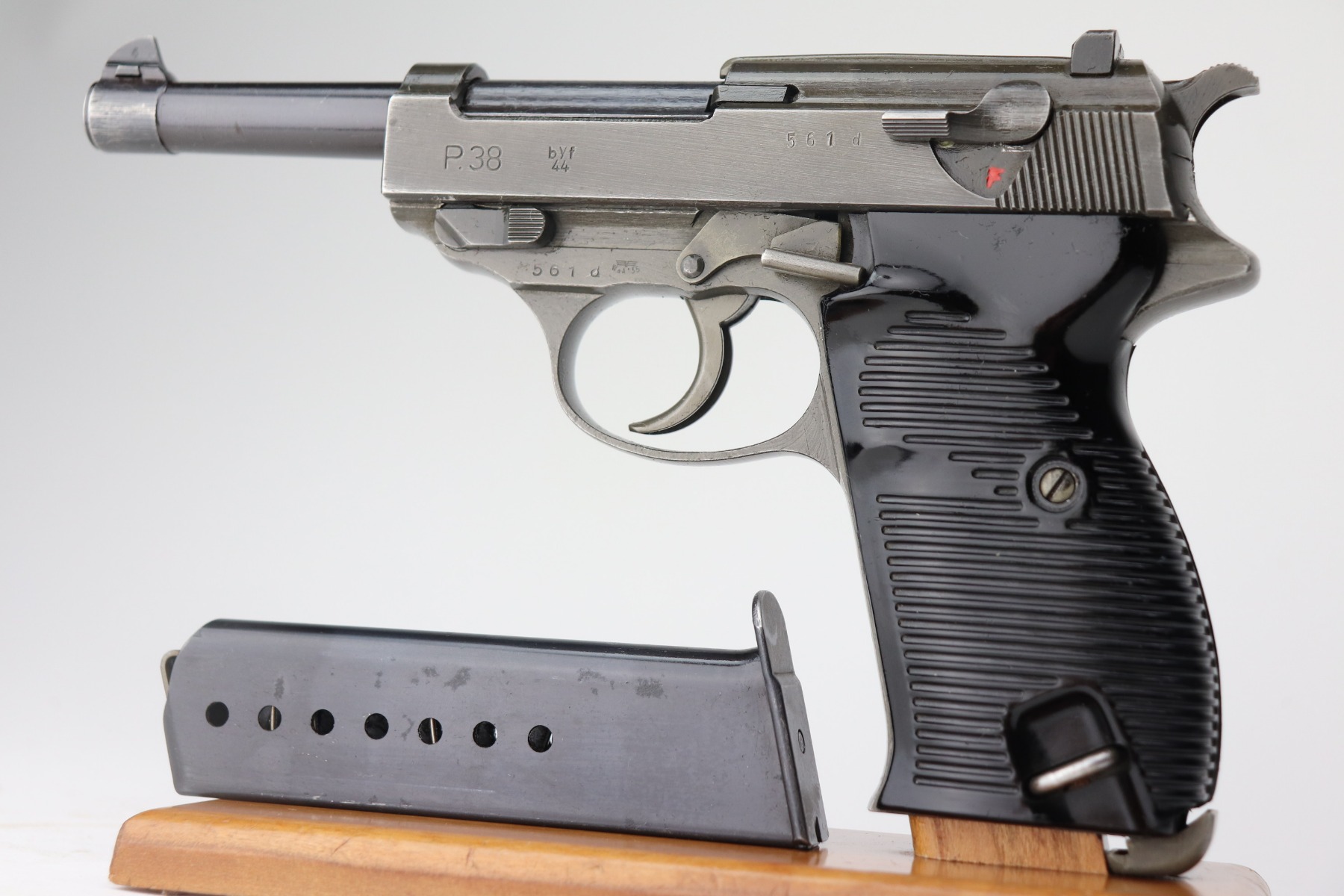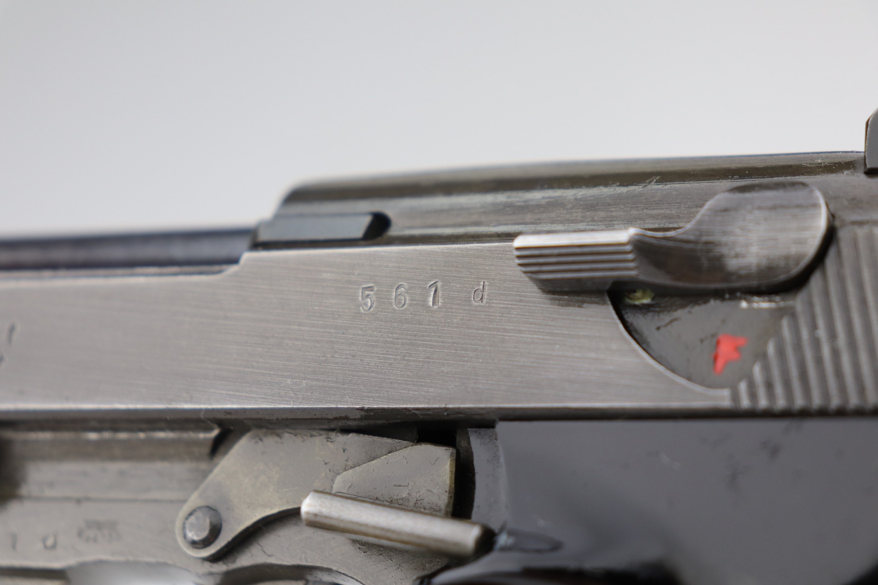 2/17/21 – This is a minty example of a dual-tone Mauser P.38 issued to the Nazi military in 1944. The dual-tone appearance is caused by a phosphate frame and slide and a blued barrel. This one is all matching and has the proper “Waffen 135” military proofs. It has retained about 98% of its original finish with just a hint of wear around the muzzle and very minor thinning on the front strap. It comes with excellent grips and a period-correct magazine. The bore is near-mint. De-cocker is functional.