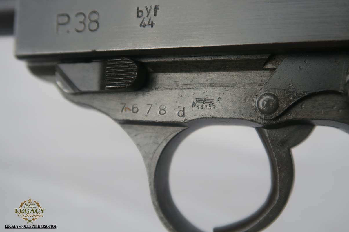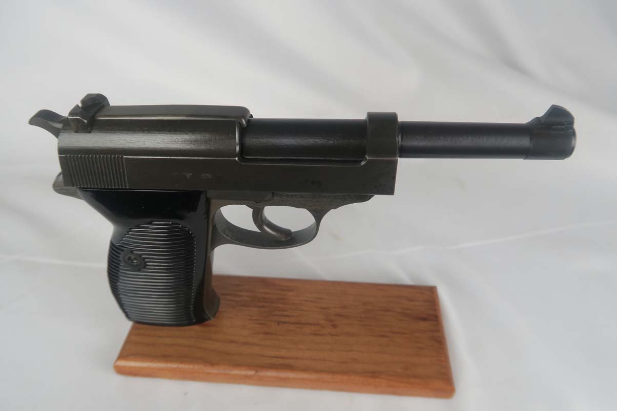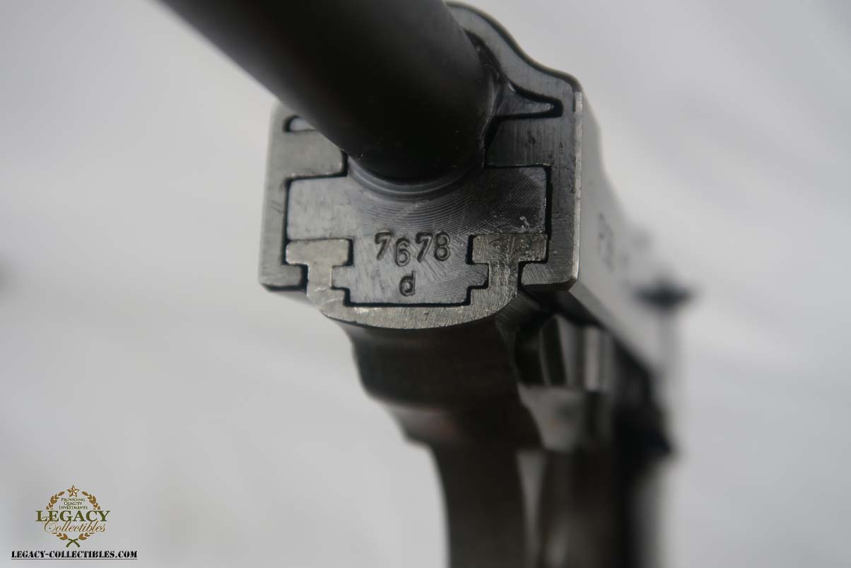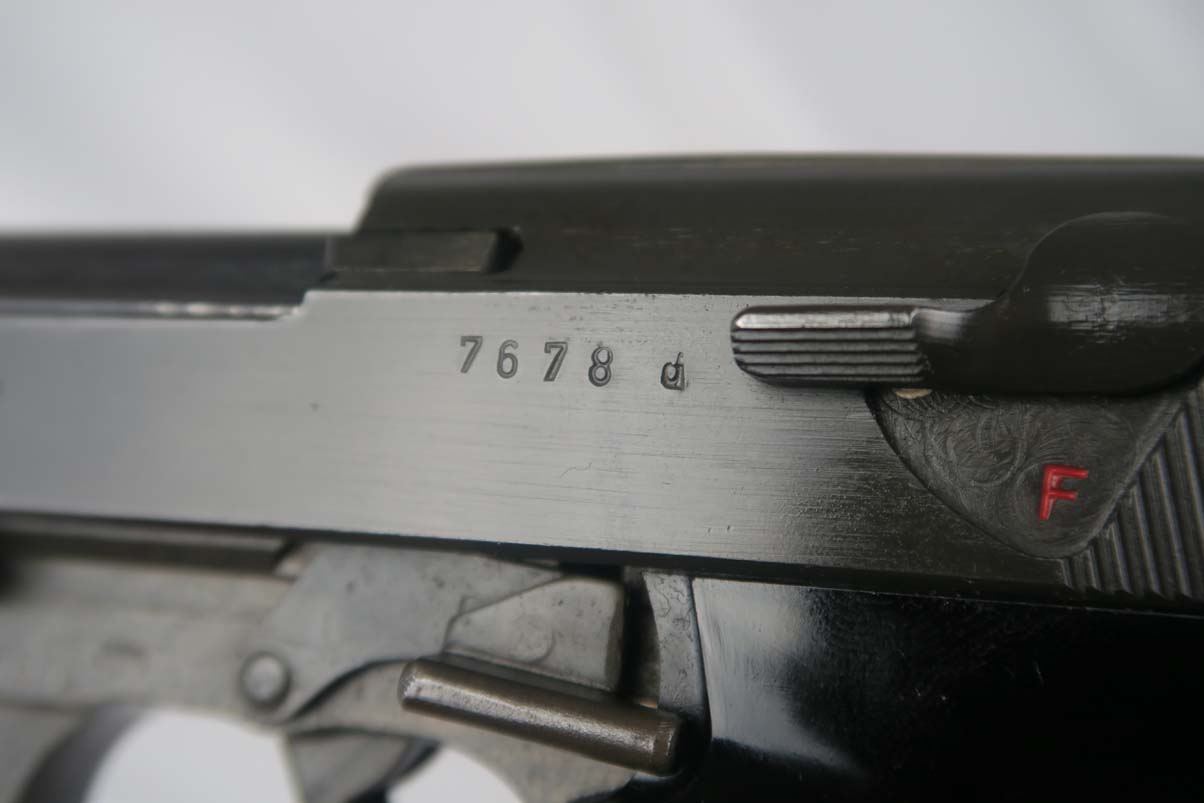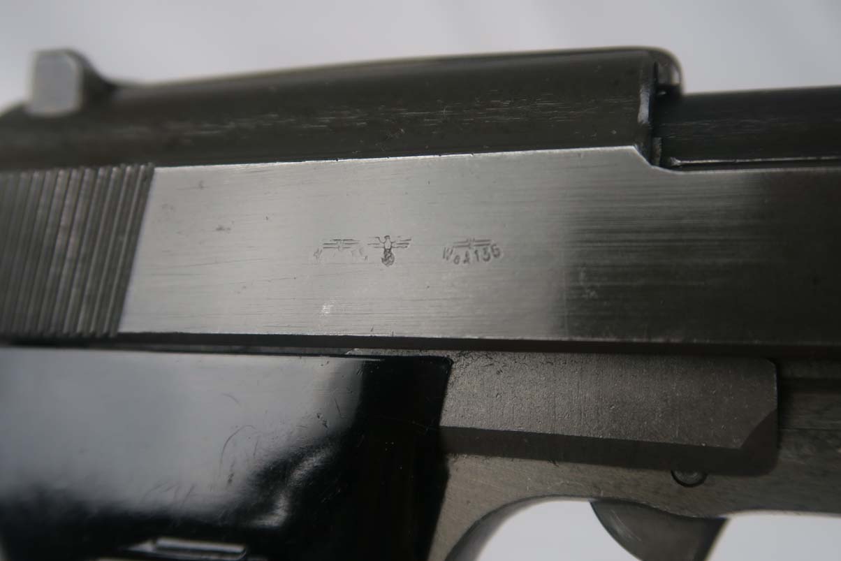3/30/17 – This is an excellent dual-tone Mauser P.38, with about 98% of its original dark phosphate finish remaining.  The phosphate on this pistol has that beautiful greenish tinge you see on some of the nicer phosphated guns.  Frame and barrel are minty, with nearly all the wear found on the right side of the slide near the front edge.  Blued barrel with phosphate frame and slide.  Rare phosphate mag, with no finish on the body but a phosphated bottom and follower.  Near perfect grips.  Excellent bore.