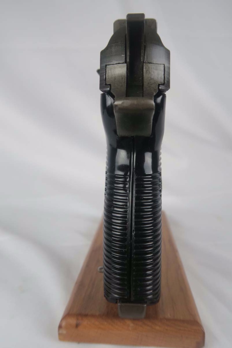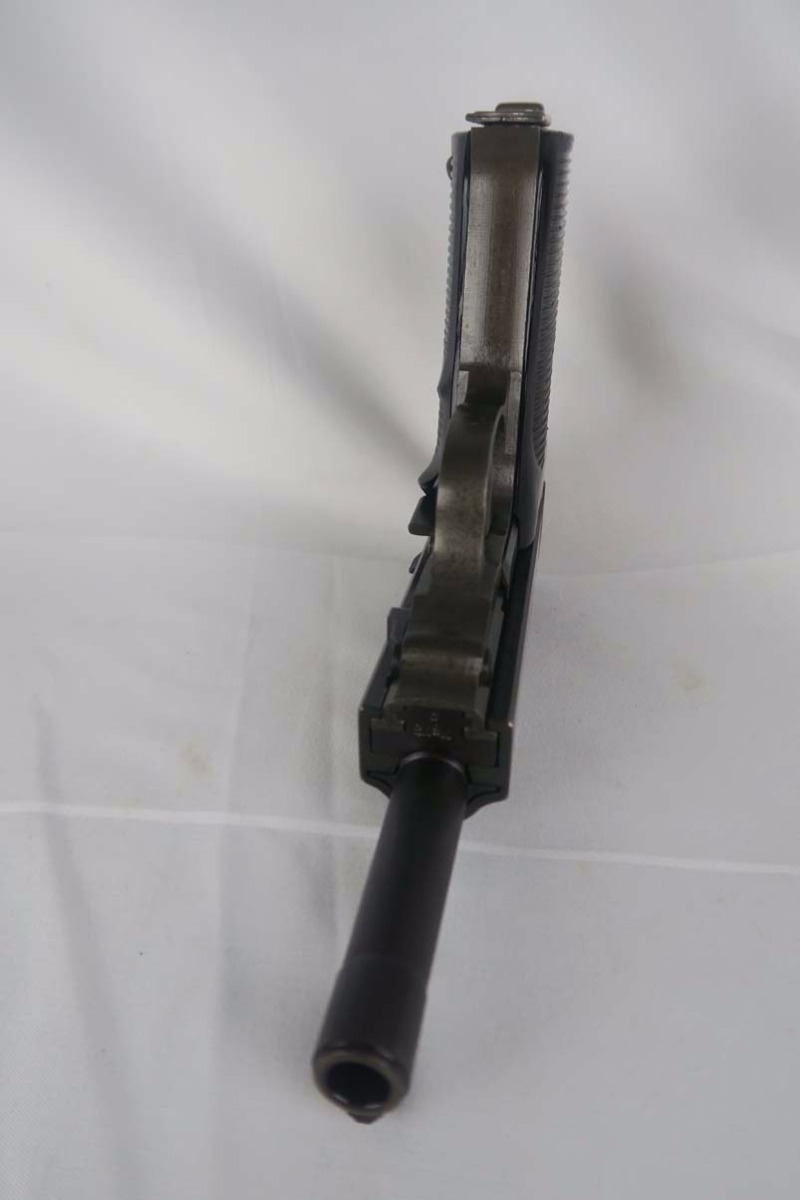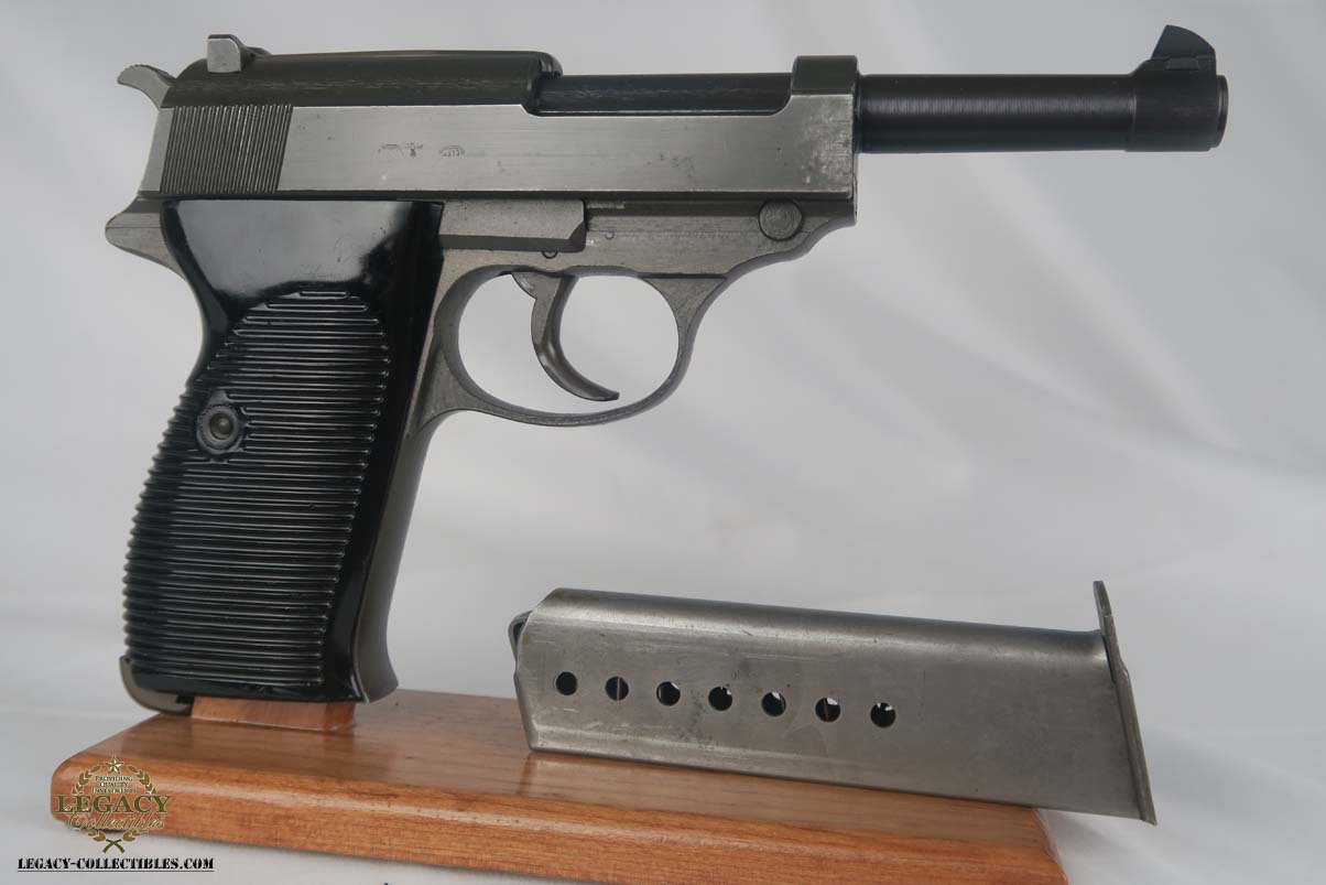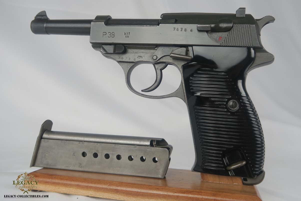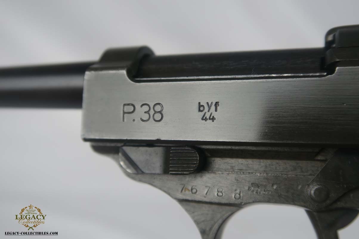 3/30/17 – This is an excellent dual-tone Mauser P.38, with about 98% of its original dark phosphate finish remaining.  The phosphate on this pistol has that beautiful greenish tinge you see on some of the nicer phosphated guns.  Frame and barrel are minty, with nearly all the wear found on the right side of the slide near the front edge.  Blued barrel with phosphate frame and slide.  Rare phosphate mag, with no finish on the body but a phosphated bottom and follower.  Near perfect grips.  Excellent bore.